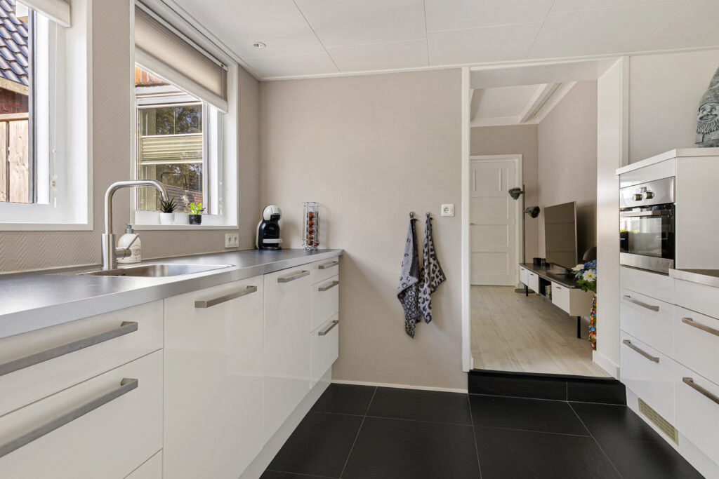 Entree/hal met meterkast en opgang naar de verdieping, L-vormige woonkamer (ca. 25,5 m²) met toegang naar de kelder (ca. 4 m²), keuken (ca. 7,5 m²; met keukenblok voorzien van spoelbak en vaatwasser en apart keukenblok met koel-/vriescombinatie, combi-magnetron, 4-pits gaskookplaat en afzuigkap), bijkeuken (ca. 6 m²; met witgoedaansluitingen, cv-opstelling, achterdeur) en aangrenzend toilet en badkamer (ca. 8 m²; met inloopdouche, ligbad, wastafelmeubel en designradiator).
