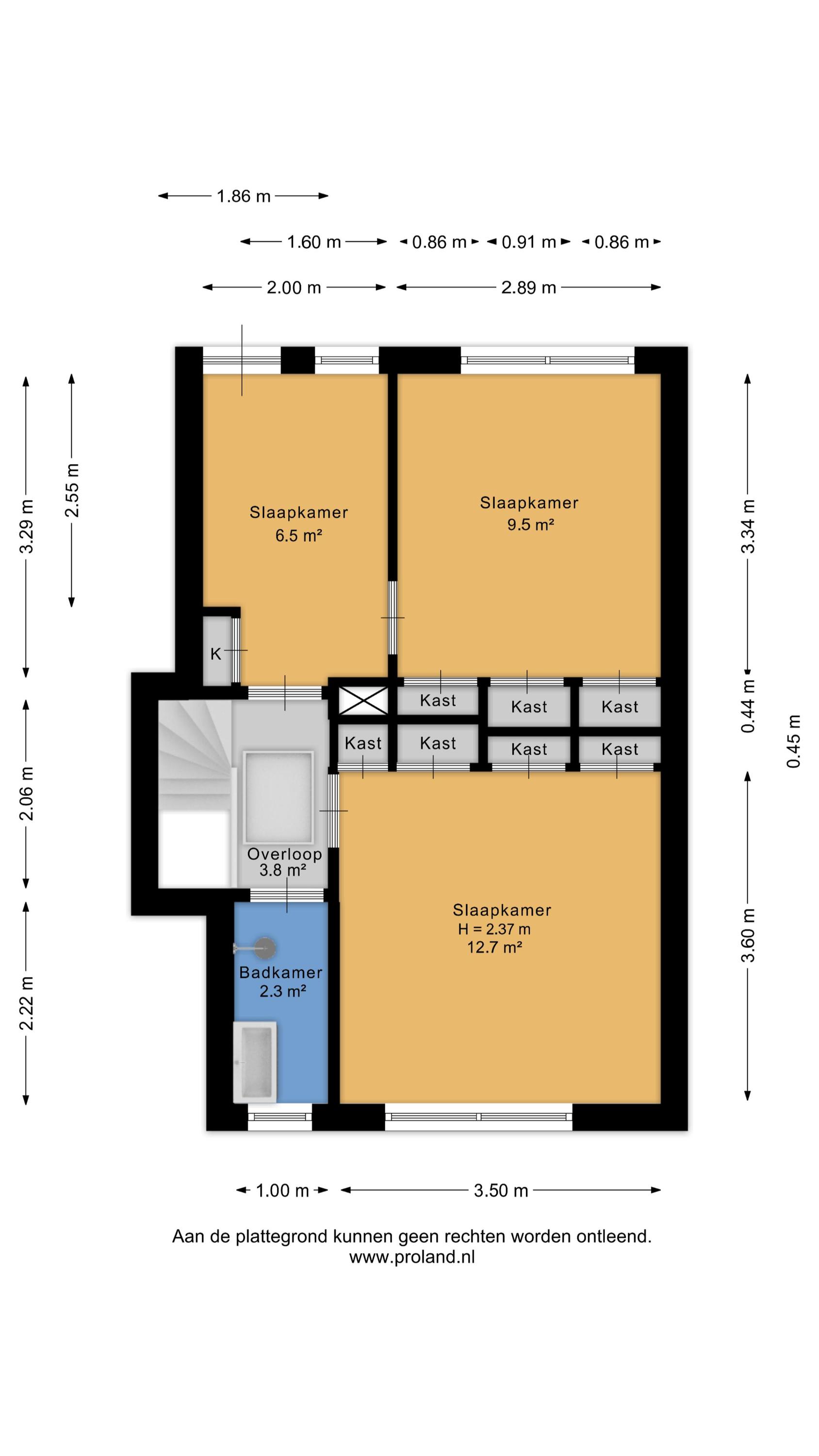 Middels vaste trap te bereiken overloop met aangrenzend slaapkamer (ca. 6,5 m²), slaapkamer (ca. 9,5 m²; met vaste kastruimte), slaapkamer (ca. 12,5 m²; met vaste kastruimte) en badkamer (ca. 2,0 m²; met douche en wastafelmeubel).