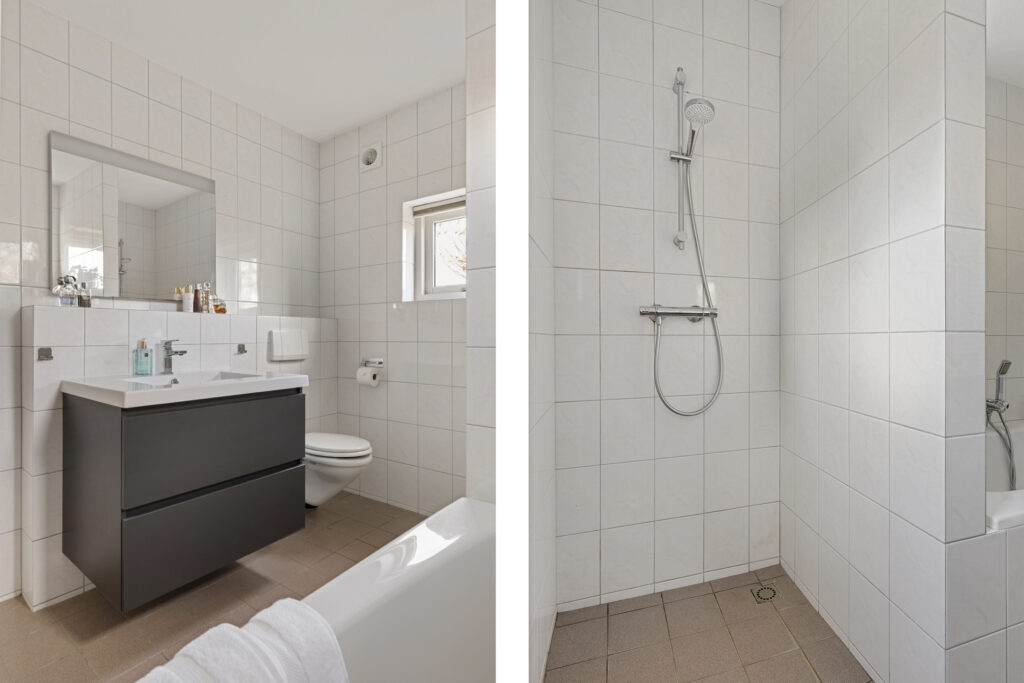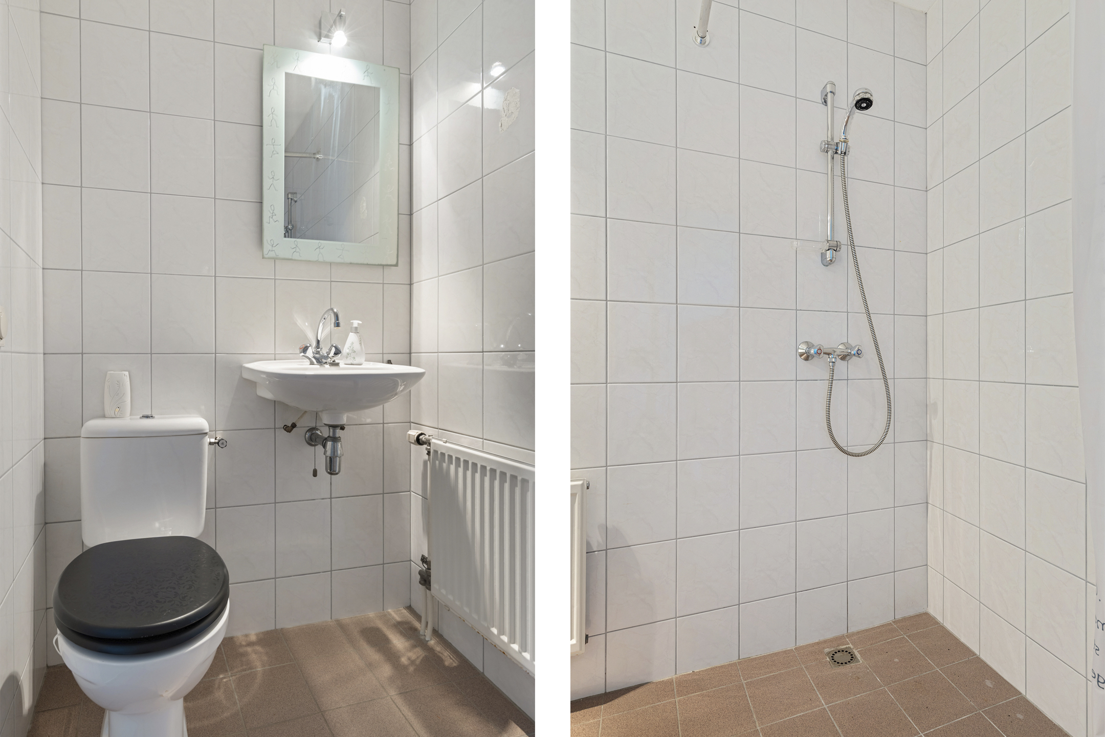 Middels vaste trap te bereiken overloop met aangrenzend slaapkamer (ca. 10 m²), badkamer (ca. 2,5 m²; met douche, wastafel en toilet), kastruimte en slaapkamer (ca. 18 m²).