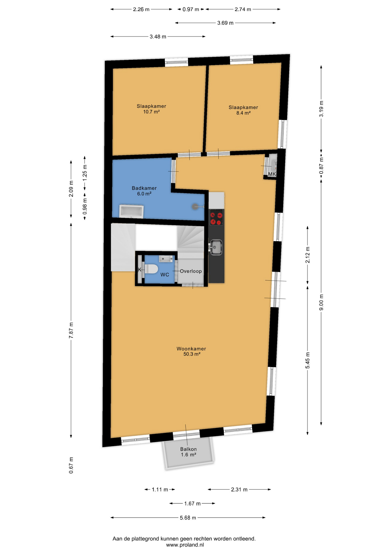 Middels vaste trap te bereiken overloopje met aangrenzend modern toilet, uiterst royale woonkamer met half open keuken (ca. 50 m²; keukenblok voorzien van koelkast, vaatwasser, combi-oven, inductiekookplaat en afzuigkap), trapopgang naar de verdieping en openslaande deuren naar het balkon (ca. 1,5 m²), badkamer (ca. 6 m²; met inloopdouche, wastafelmeubel en witgoedaansluitingen), slaapkamer (ca. 10,5 m²) en slaapkamer (ca. 8,5 m²).
