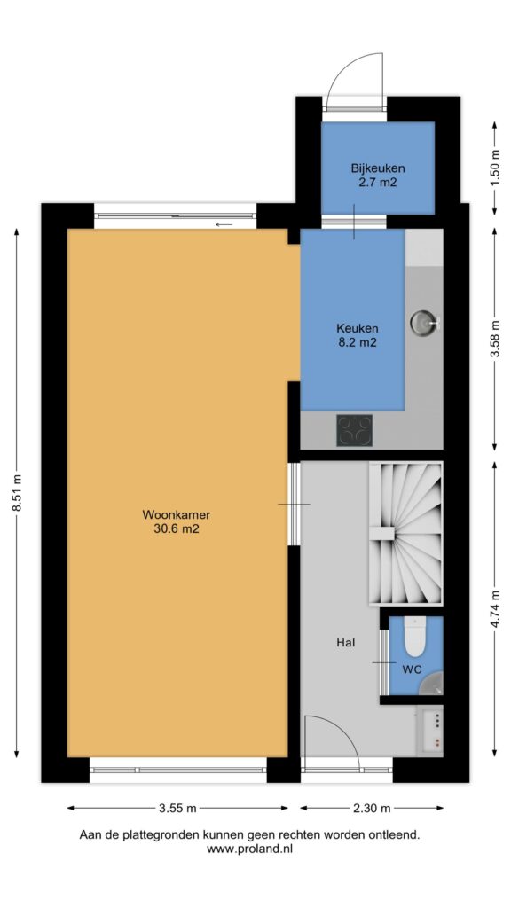 Entree/hal met meterkast, toilet, royale trapkast en opgang naar de verdieping, woonkamer (ca. 30 m²), half open keuken (ca. 7,5 m²; met hoekopstelling voorzien van inbouwapparatuur en achterentree (ca. 2,5 m² met installaties).
