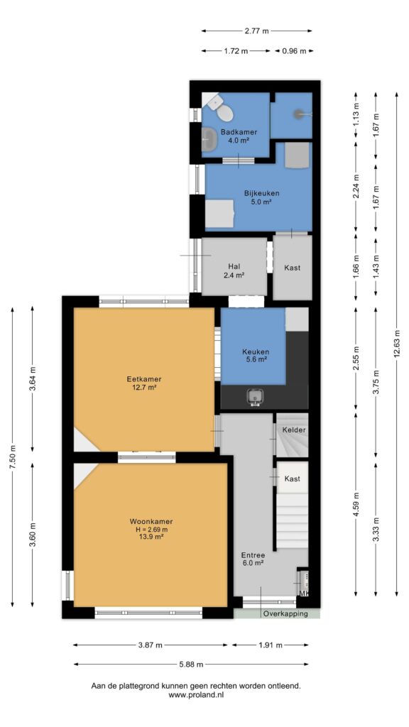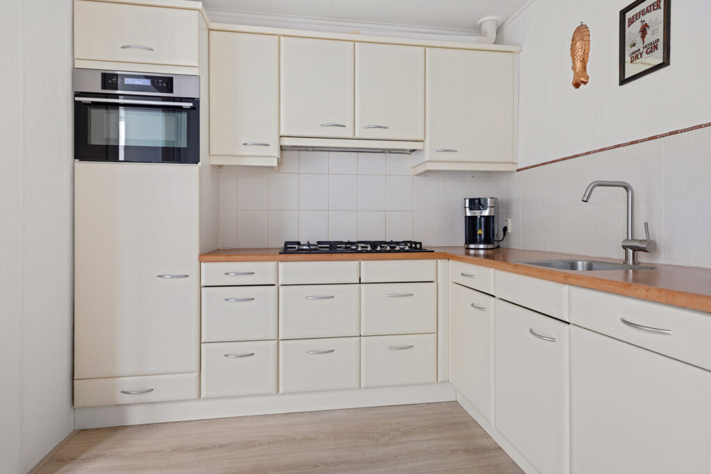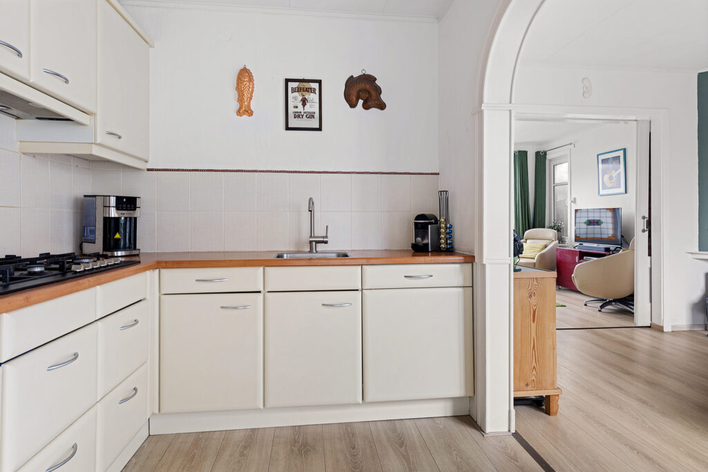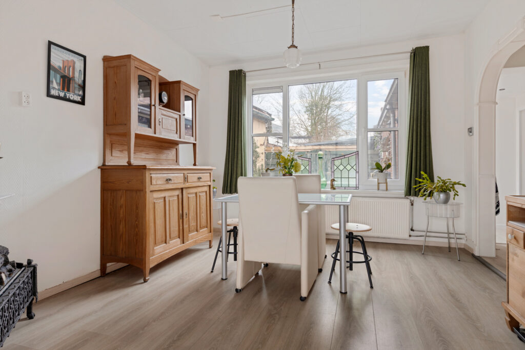 Hal/entree met toegang tot de kelder. Ruime en lichte woon-/eetkamer (ca. 25 m²) voorzien van laminaatvloer en sfeervolle en suite-deuren. Semi-open keuken met moderne inbouwkeuken, uitgerust met een 5-pits gaskookplaat, afzuigkap, koelkast, combi-magnetron en vaatwasser. Achterhal met toegang tot de bijkeuken met witgoedaansluitingen. Badkamer op de begane grond voorzien van douche, wastafel, toilet en designradiator.