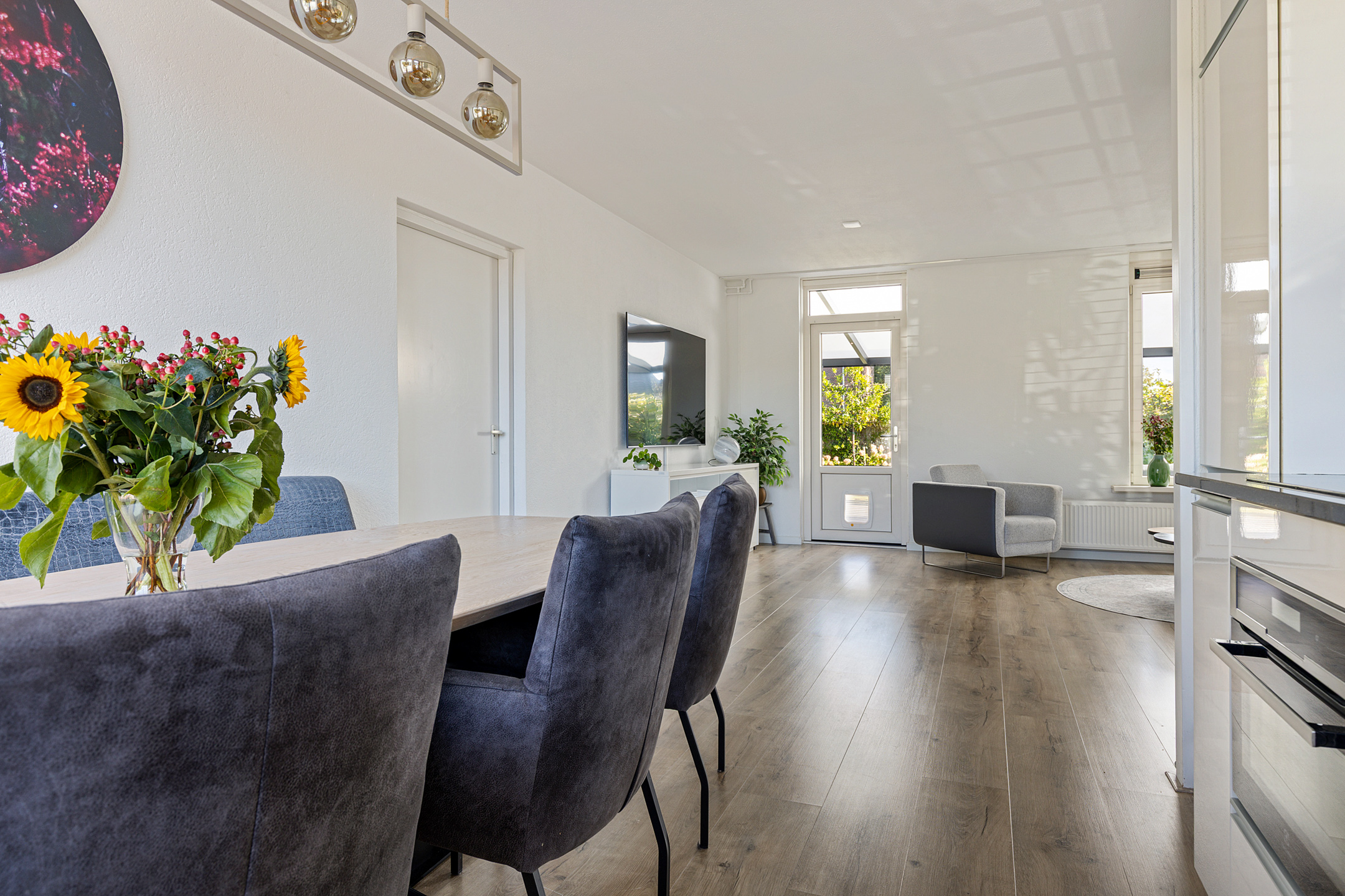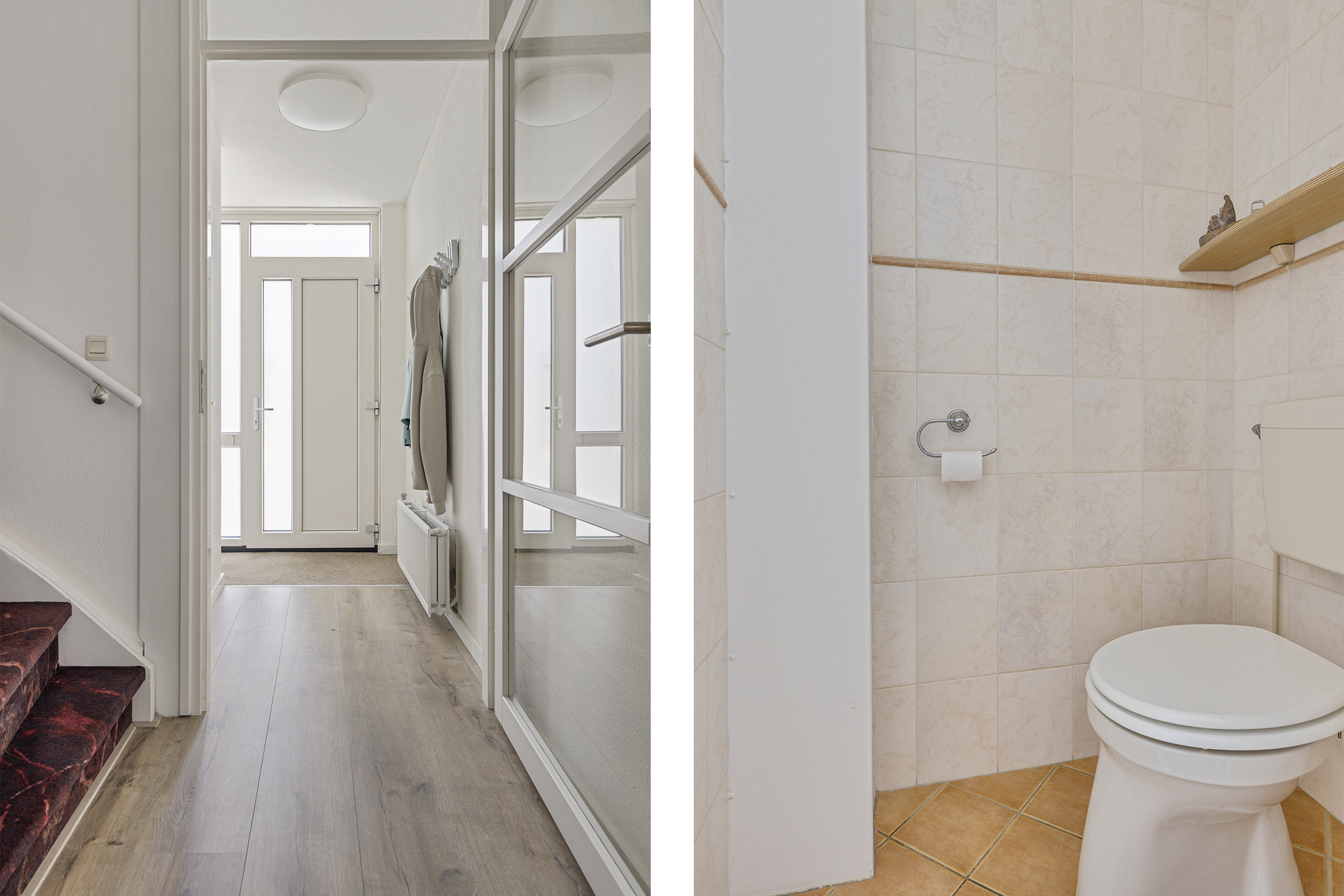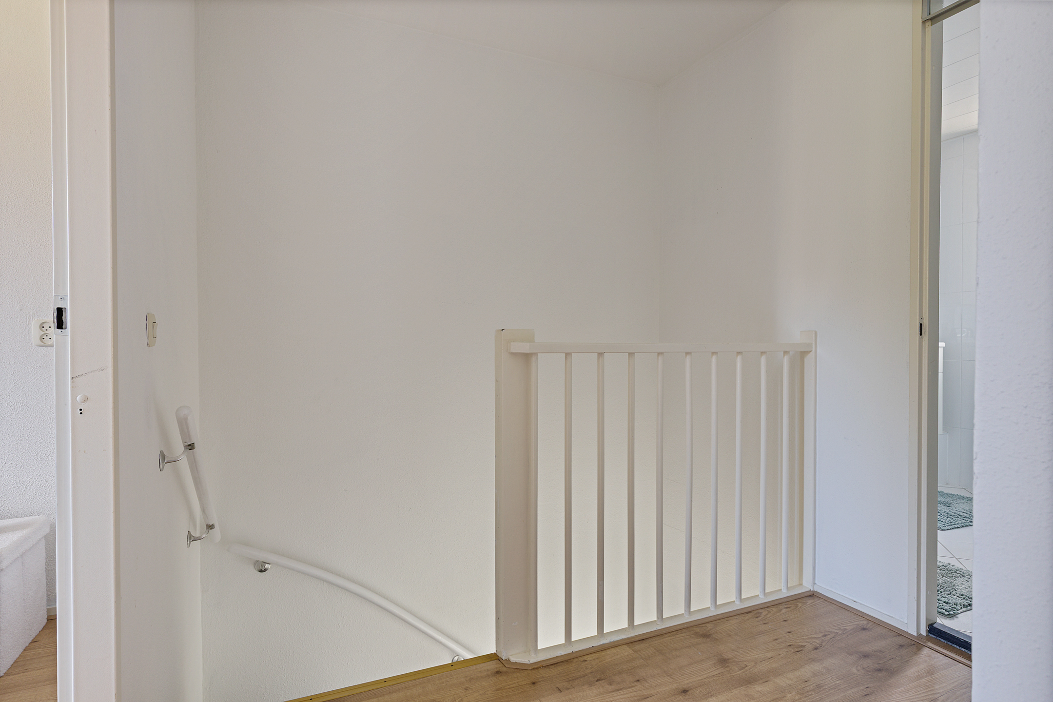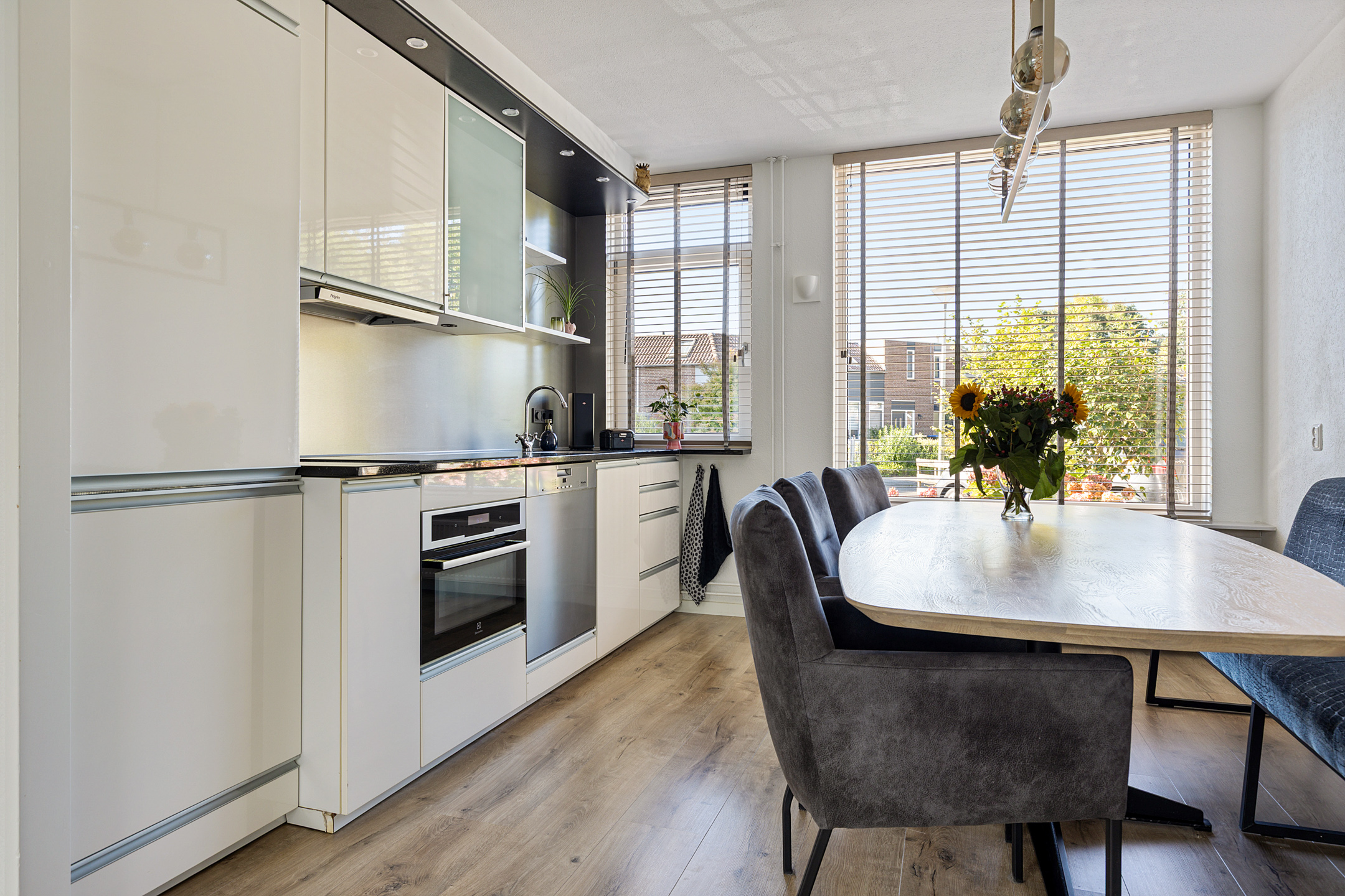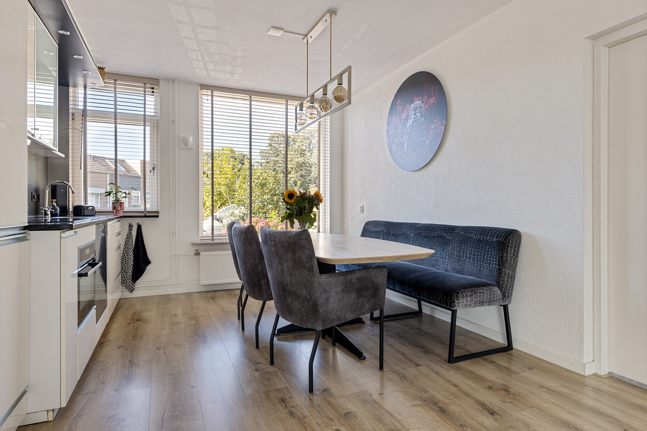 Op de begane grond zoals gezegd een slaap- en badkamer, waarbij eerstgenoemde aan de rustige, tuinzijde van de woning is gesitueerd. Ook de aanwezigheid van een bijkeuken is niet standaard in het straatbeeld. Helemaal niet met de afmetingen als op huisnummer 103. Aan de tuinzijde verder de woonkamer met tuindeur naar de heerlijke veranda. De open en moderne keuken is juist aan de straatzijde gesitueerd, net als de entree met toilet en trapopgang naar de eerste verdieping. Op deze verdieping biedt de overloop toegang tot nog eens drie slaapkamers waarvan twee met laminaatvloeren, een tweede - keurige - badkamer en stook- annex bergruimte.