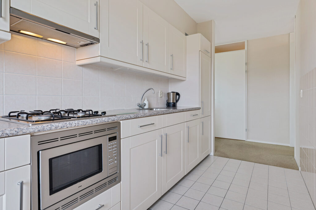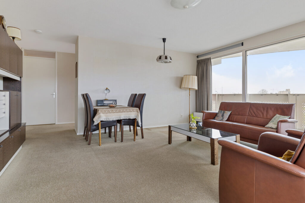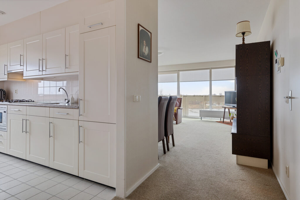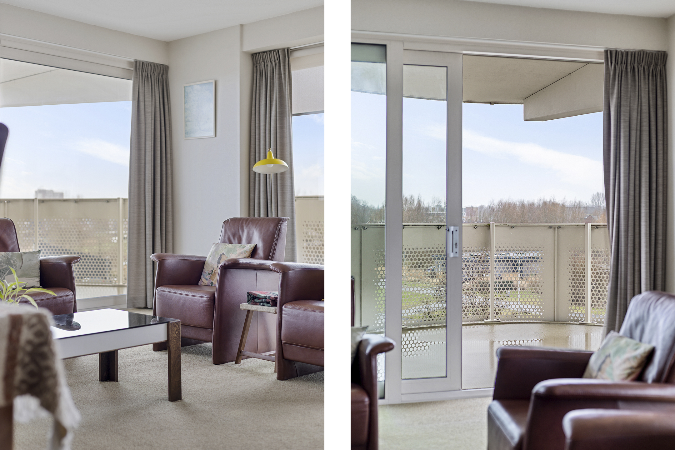 Entree/hal met meterkast, toilet en aangrenzend bijkeuken (ca. 3,5 m²; met witgoedaansluitingen en cv-opstelling), slaapkamer (ca. 16 m²), slaapkamer (10,5 m²; met kastenwand) en slaapkamer (ca. 19 m²). Vanuit laatstgenoemde slaapkamer en hal te bereiken badkamer (ca. 7,5 m²; met douche, toilet en twee wastafels), half open keuken (ca. 8 m²; met keukenblok voorzien van 4-pits gaskookplaat, combi-magnetron, afzuigkap en koel-/vriescombinatie), woonkamer (ca. 43,5 m²; met dubbele schuifpui naar het royale balkon (ca. 40 m²).