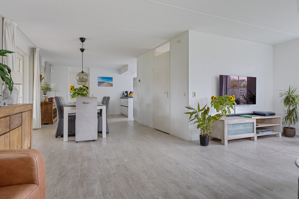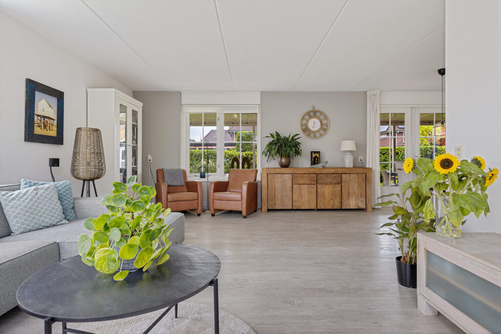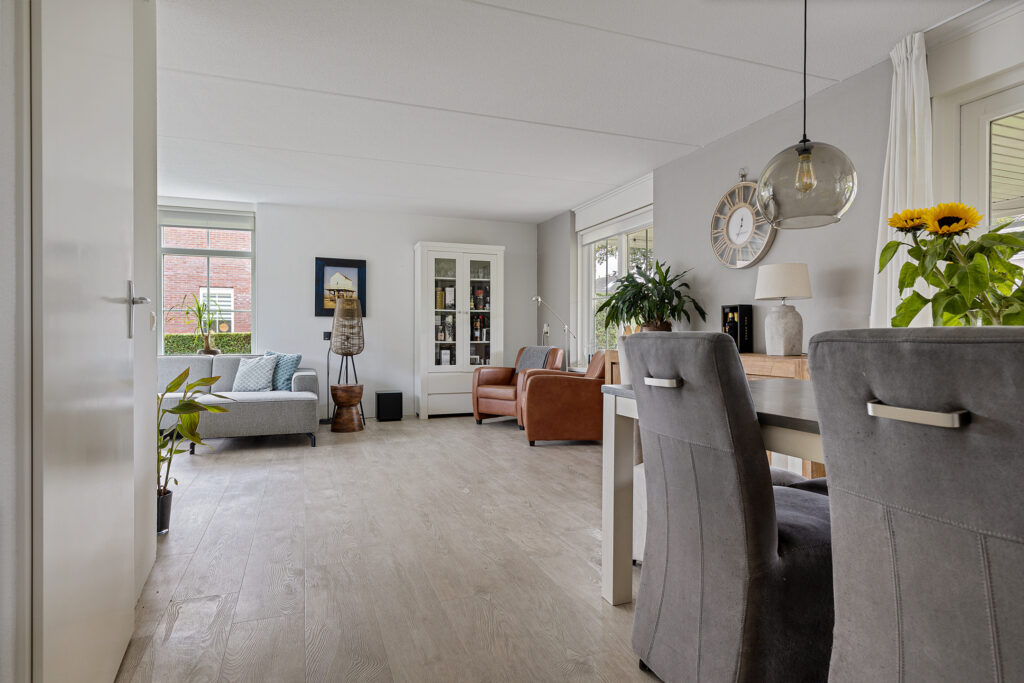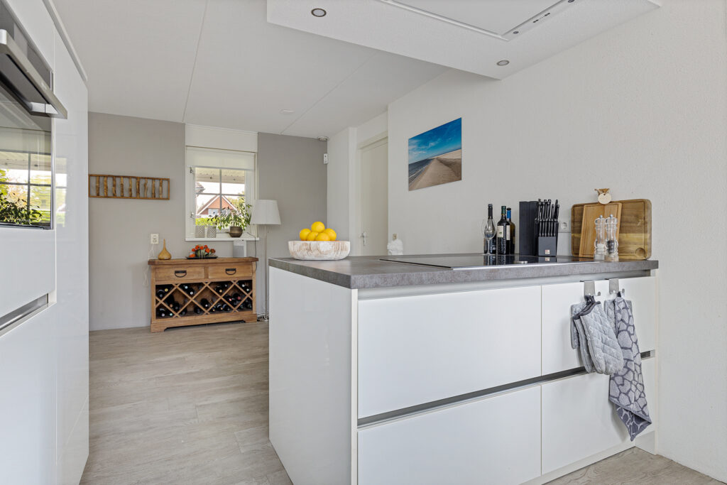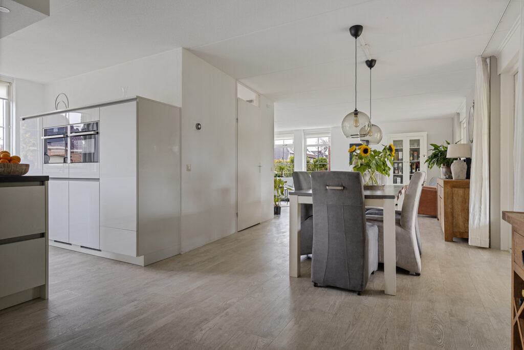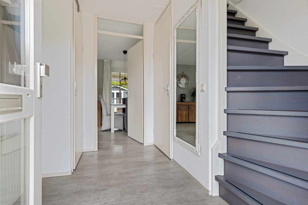 De woning is vanaf de openbare weg te betreden middels de entree in de voorgevel en leidt naar de ontvangsthal die beschikt over de trapopgang naar de eerste verdieping, de meterkast en het betegelde toilet. Vanuit de hal is vervolgens de L-vormige woonkamer te bereiken. Deze woonkamer beschikt over heerlijke tuindeuren naar de overkapping en een fraaie PVC-vloer die drempelloos ‘doorloopt’ naar de open eetkeuken. In 2018 is de inrichting van deze keuken vernieuwd en daarbij uitgevoerd in een uiterst moderne staat, voorzien van alle denkbare inbouwapparatuur. Het geheel wordt op de begane grond gecompleteerd door de functionele - dubbele - bijkeuken met witgoedaansluitingen, gerealiseerd in de oorspronkelijke garage.
