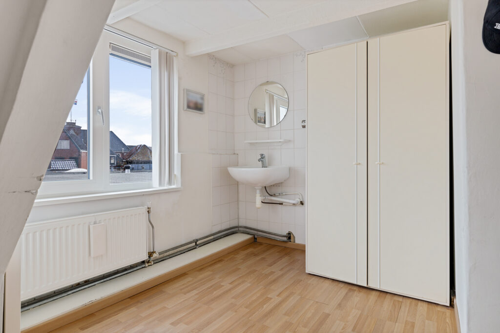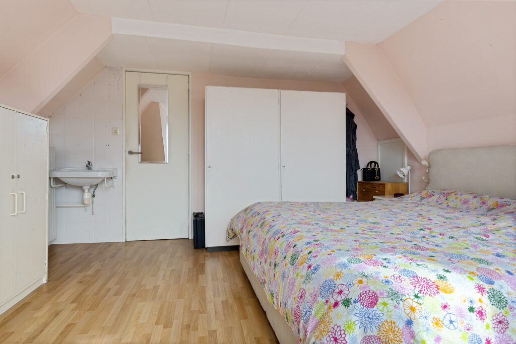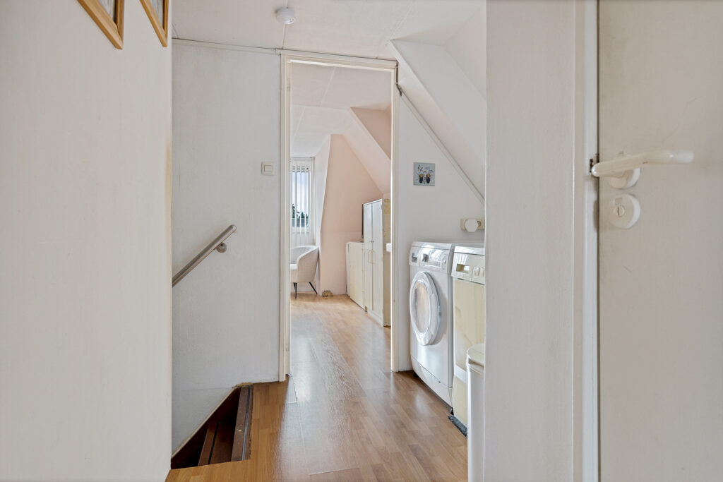 Middels vaste trap te bereiken overloop met witgoedaansluitingen, kastruimte en aangrenzend slaapkamer (ca. 15 m²), slaapkamer (ca. 9 m²) en slaapkamer (ca. 14 m²).