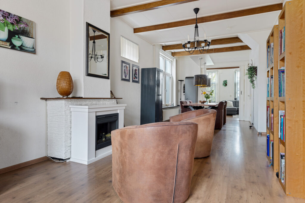 Overloop met aangrenzend woonkamer (ca. 24 m²) met elektrische haard, middels suitedeuren te bereiken eetkamer (ca. 30 m²) en keuken (ca. 6,5 m²; met hoekopstelling voorzien van koel-/vriescombinatie, oven, 5-pits gaskookplaat, afzuigkap, vaatwasser en toegang naar het dakterras (ca. 23 m²). Tevens vanuit de hal te bereiken toilet, badkamer (ca. 5 m²; met ligbad, douche en wastafelmeubel) en opgang naar de tweede verdieping.