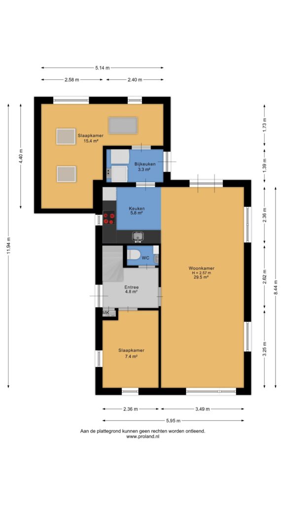 Entree, hal, toilet, slaapkamer (ca. 7 m²), woonkamer van ca. 30 m² en half open keuken (ca. 6 m²) voorzien van koelkast, combimagnetron, kookplaat en vaatwasser. Via de tuindeuren heb je direct toegang tot de tuin. Vanuit de keuken kom je in de bijkeuken van ca. 6 m² en vervolgens de 2e L-vormige slaapkamer van ca. 15 m².
