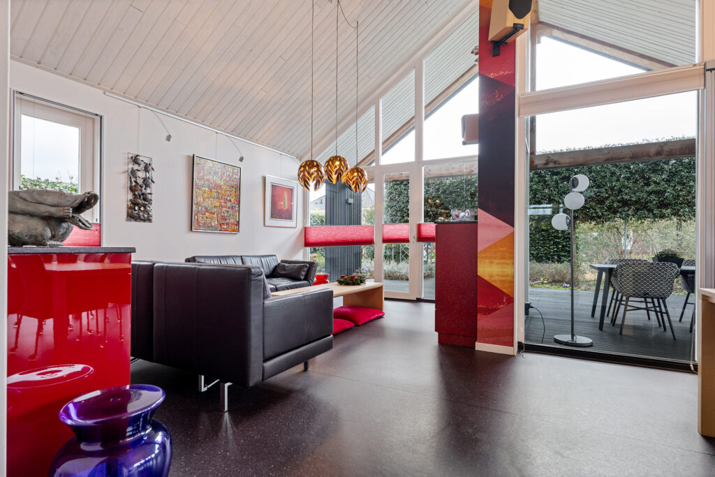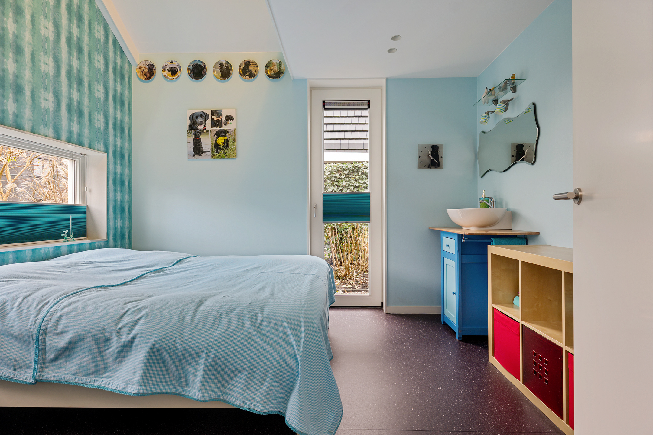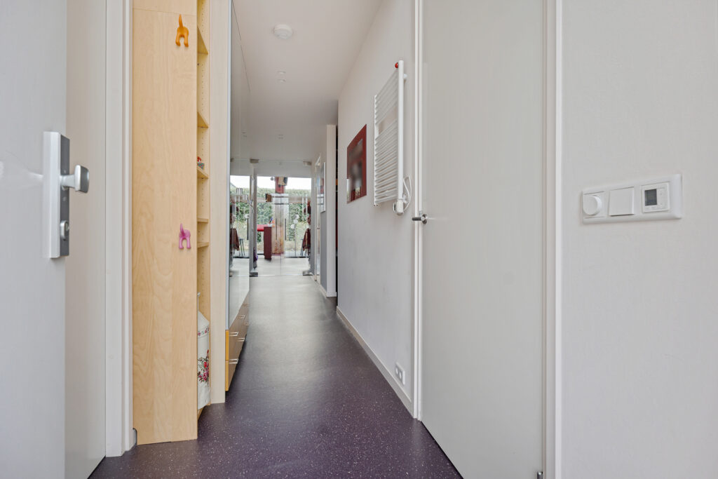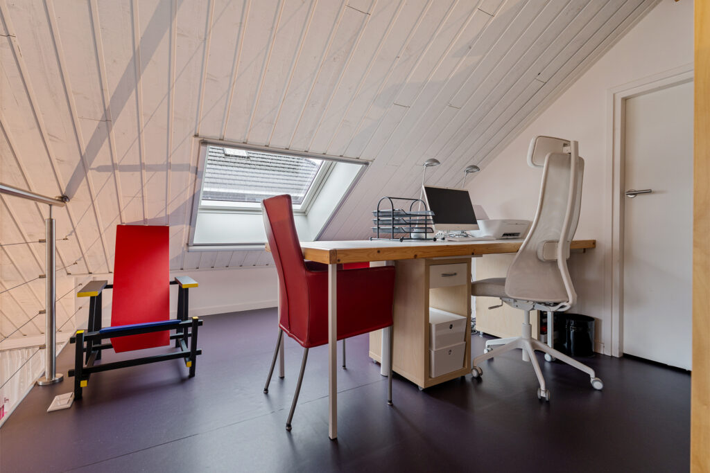 Vanuit de woonkamer leidt een trap naar de vide, waar zich een fijne werkplek bevindt met lichtinval via het Velux-dakraam en zicht op de tuin door de grote ramen van de woon- en eetkamer. Loop je verder door, dan bereik je de ruime zolderberging.