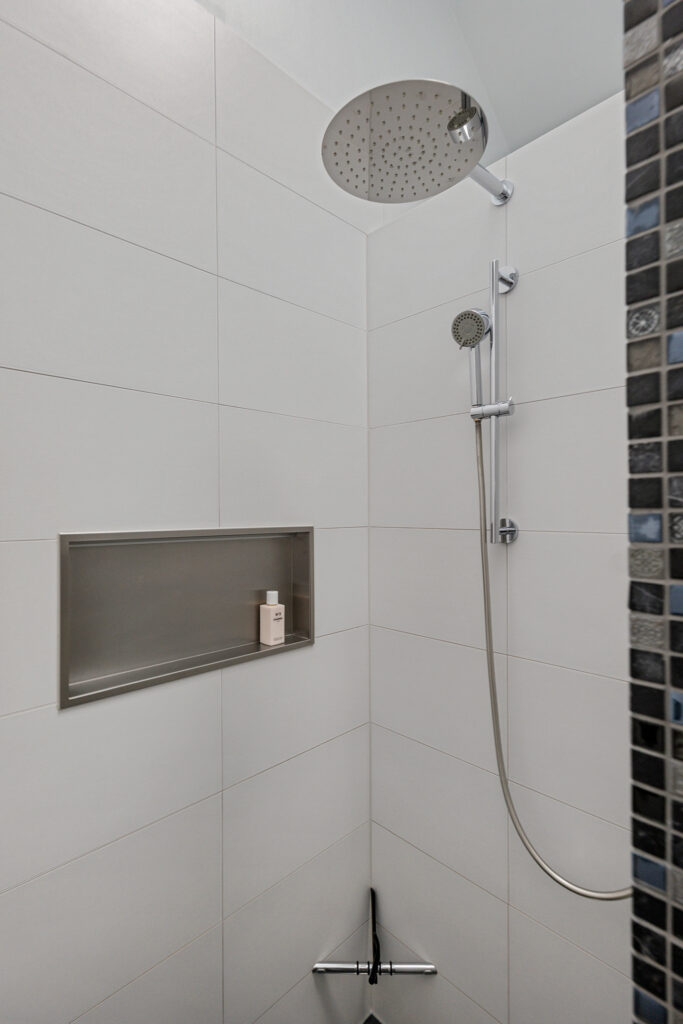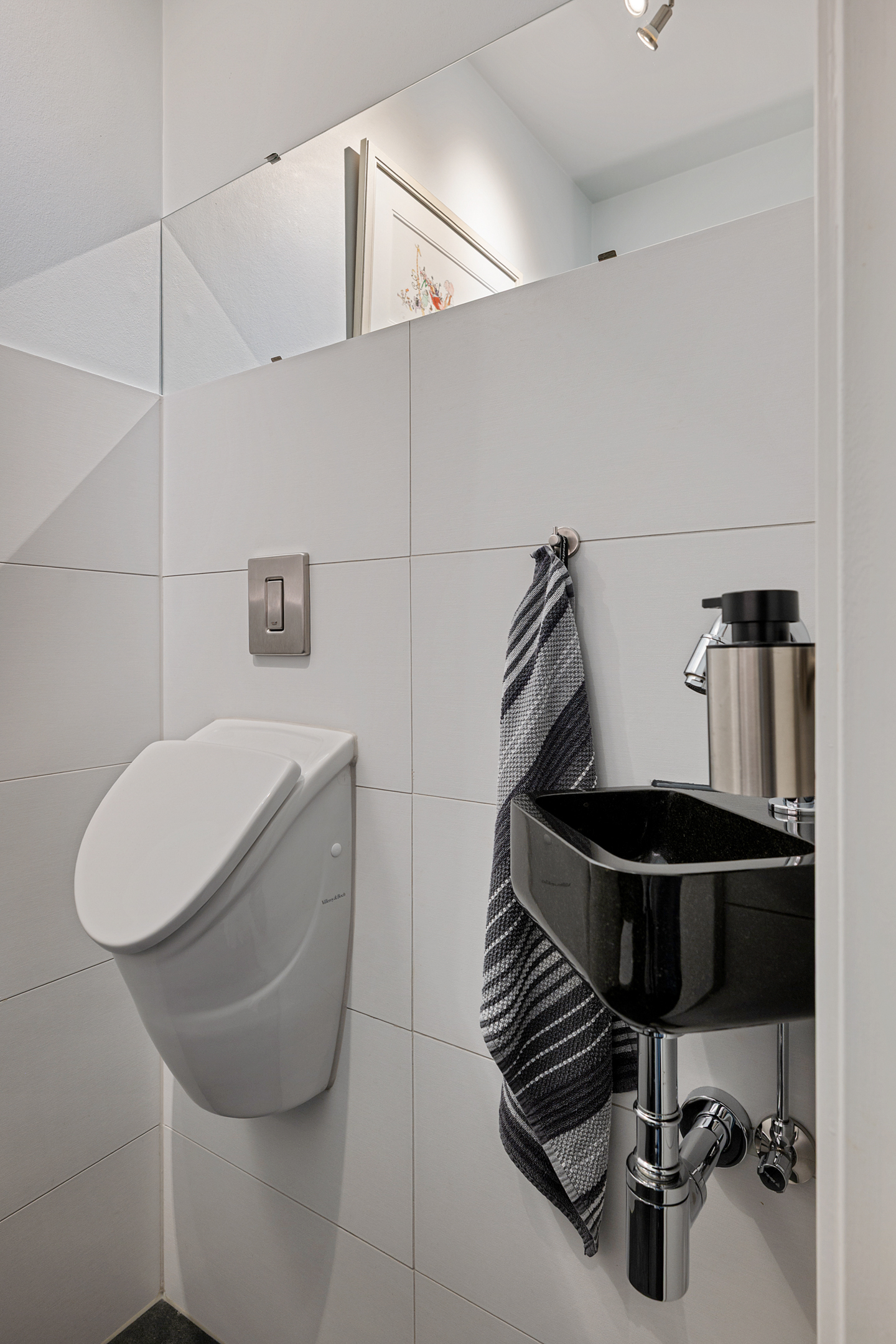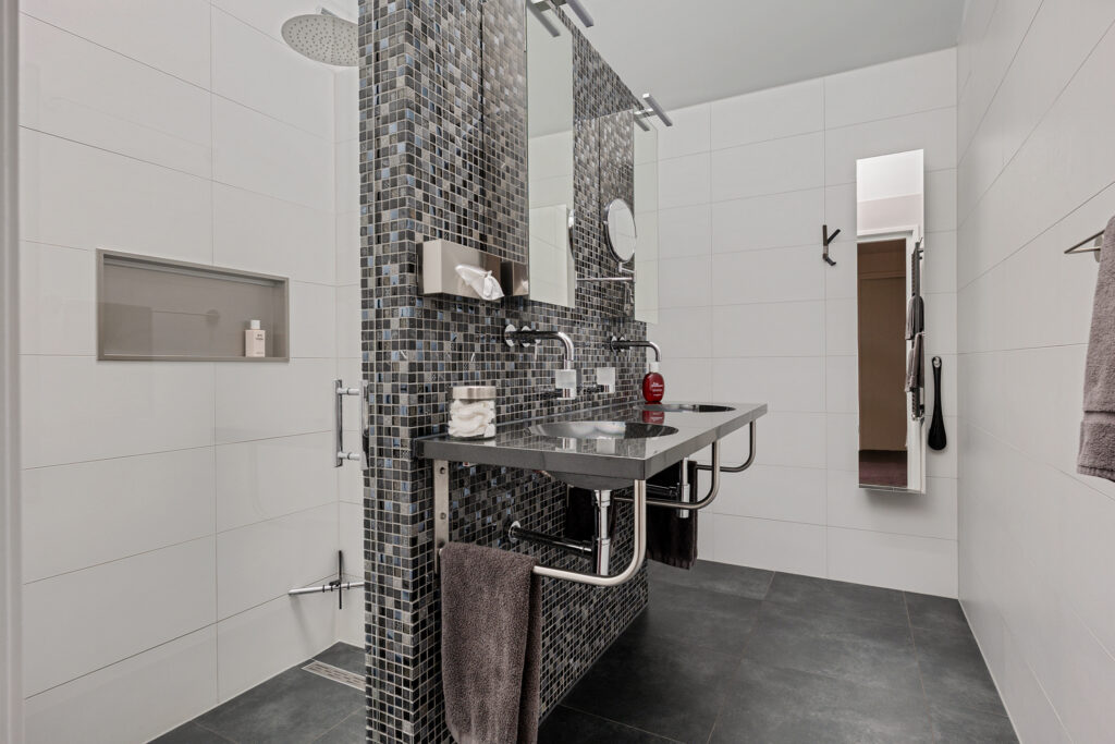 De badkamer (ca. 7,6 m²) is modern uitgevoerd en voorzien van een inloopdouche, dubbele wastafel, toilet en vloerverwarming. Daarnaast is er een separaat toilet in de hal aanwezig.