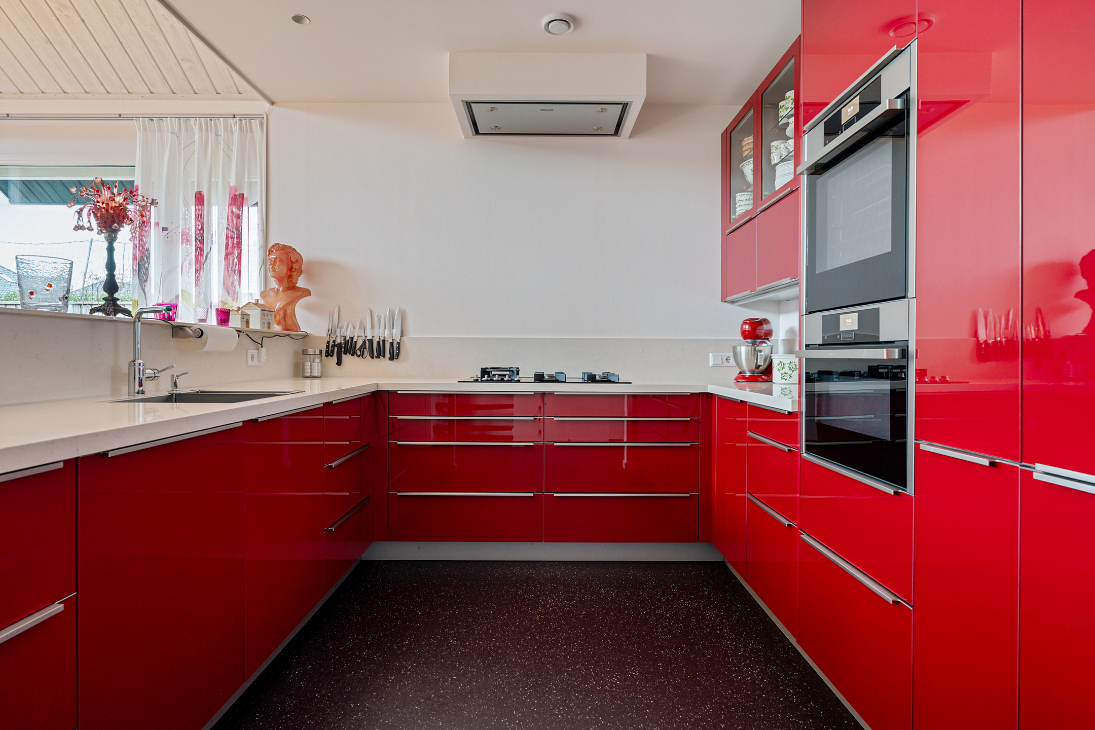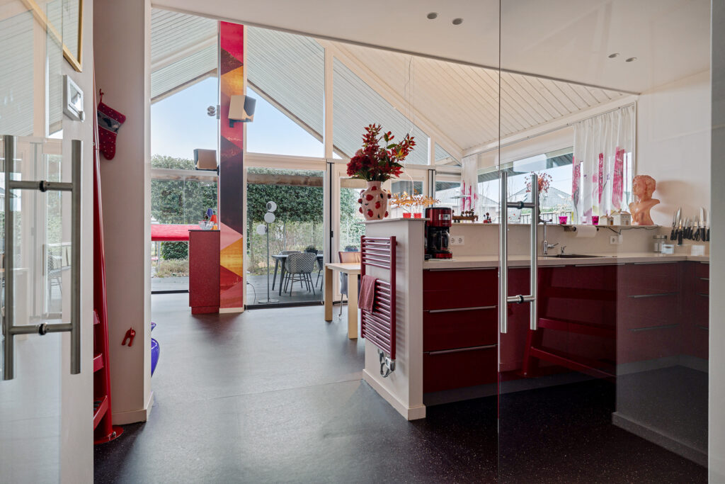 De keuken (ca. 9,1 m²) is halfopen en praktisch ingericht, met volop werkruimte en directe verbinding met de eetkamer. Daarnaast bevindt zich een ruime bijkeuken (ca. 11,6 m²) met opstelplaats voor wasapparatuur en extra bergruimte, eveneens met toegang naar buiten.