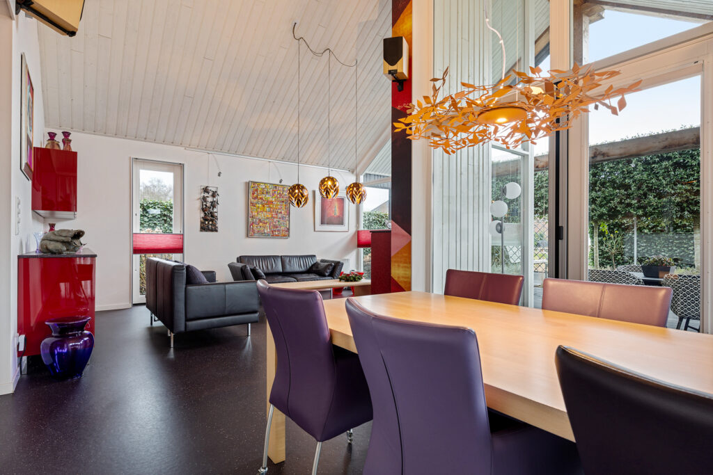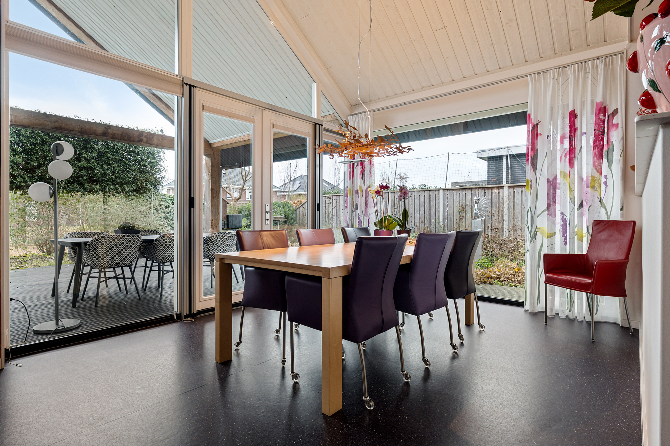 Via de ruime entree met garderobe bereik je de verschillende vertrekken van deze prettig ingedeelde woning. De lichte woonkamer (ca. 40,8 m²) ligt aan de tuinzijde en biedt dankzij de grote ramen prachtig zicht op het water. Aangrenzend bevindt zich een fijne eetkamer die doorloopt naar de overkapping — een heerlijke plek om het hele jaar door van binnen en buiten te genieten.