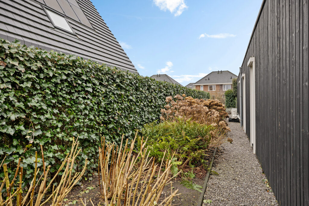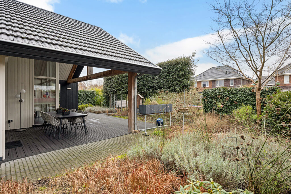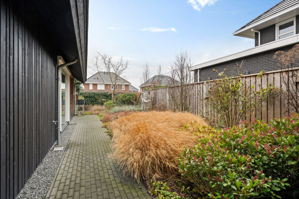 De tuin rondom de woning is fraai aangelegd en geeft het huis een verzorgde, uitnodigende uitstraling. Aan de zijkant bevindt zich de ruime carport (ca. 29,5 m²), geschikt voor meerdere voertuigen.