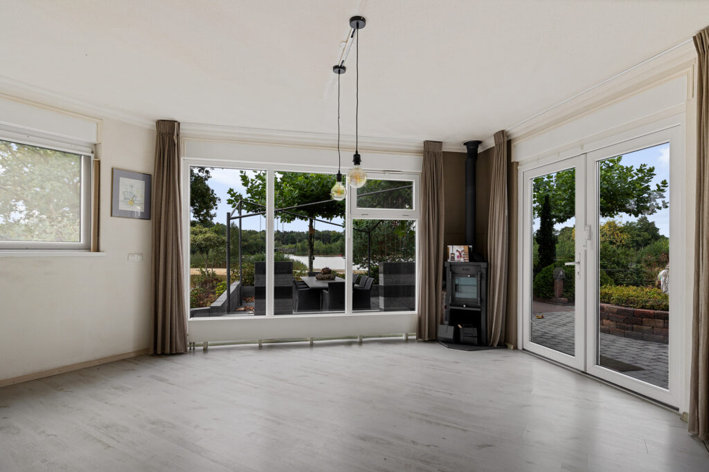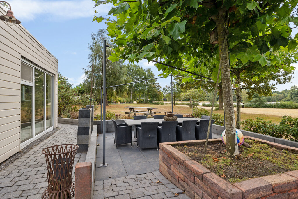 Voorts kom je terecht in de woonkamer en de open keuken welke is voorzien van een koelkast, oven, 6 -pits gasfornuis, vaatwasser en een afzuigkap. Tevens bevindt zich in deze ruimte een sfeervolle pelletkachel en een haard. Zodra je in de winter door de tuindeuren weer naar binnen loopt kun je hier heerlijk even je handen opwarmen.
