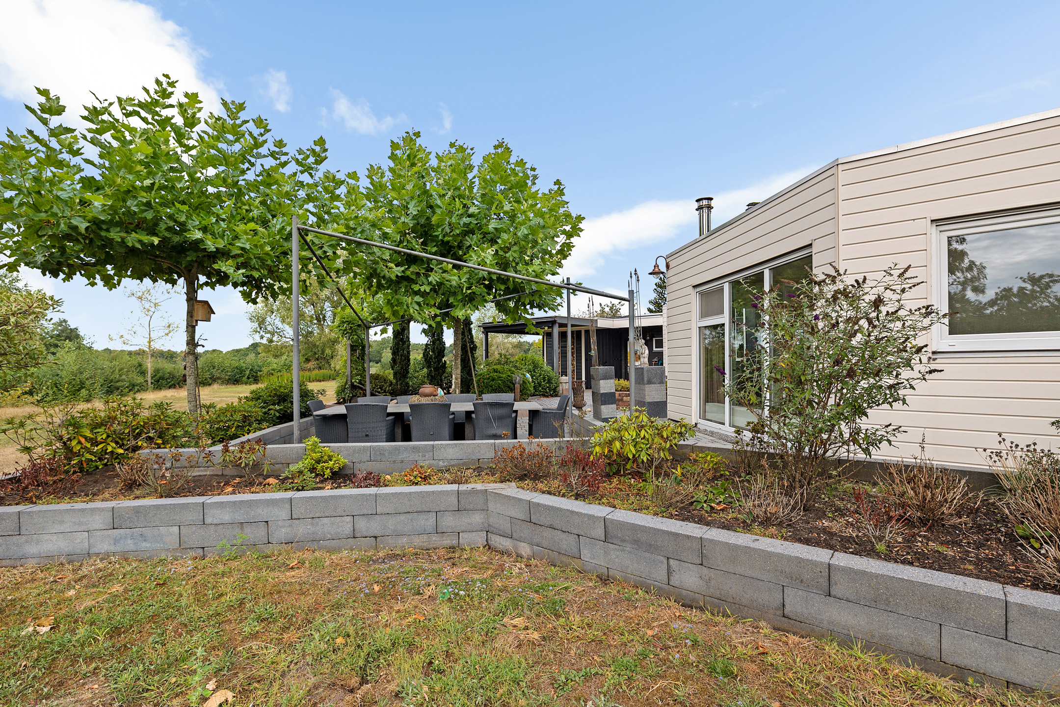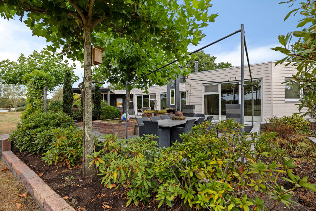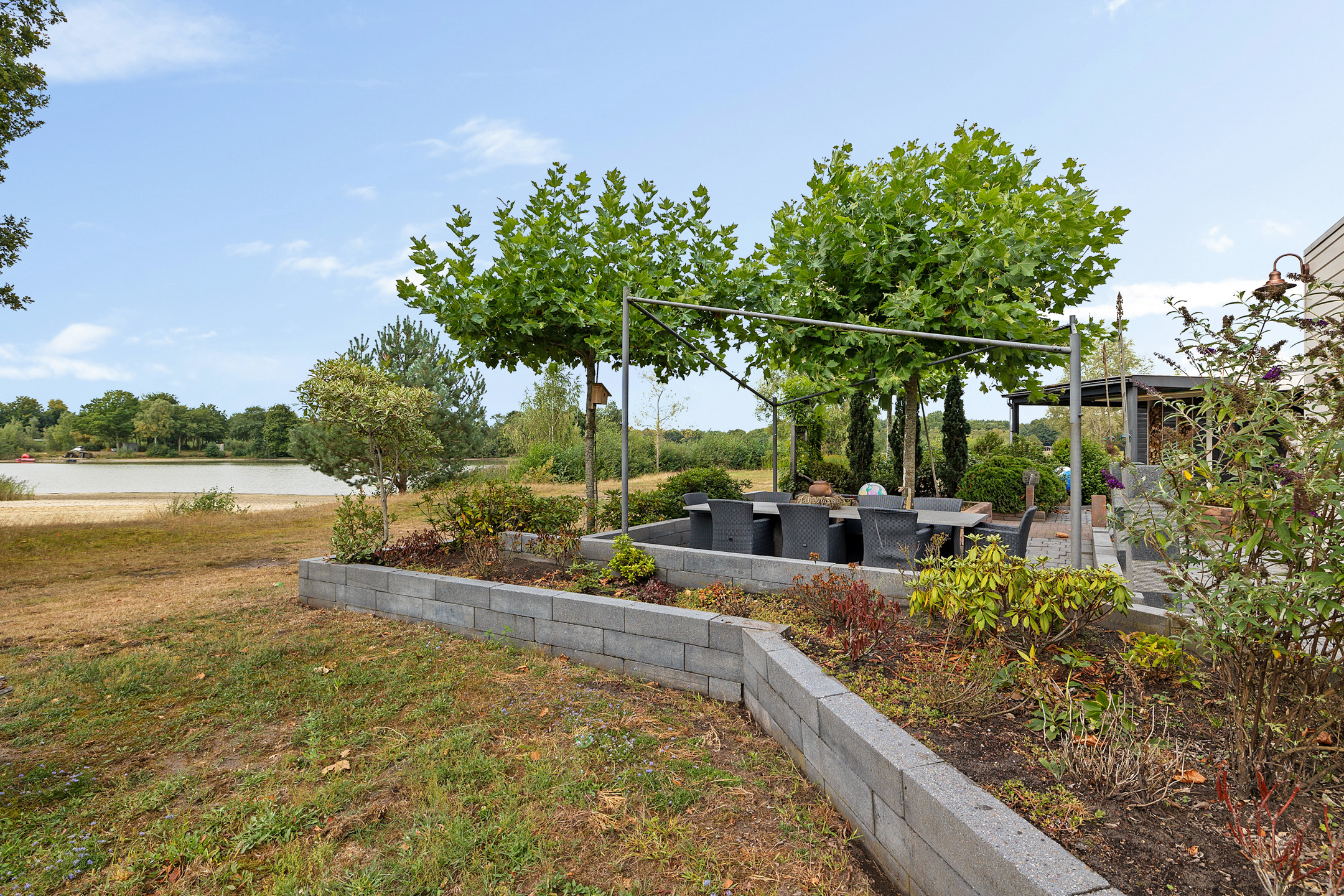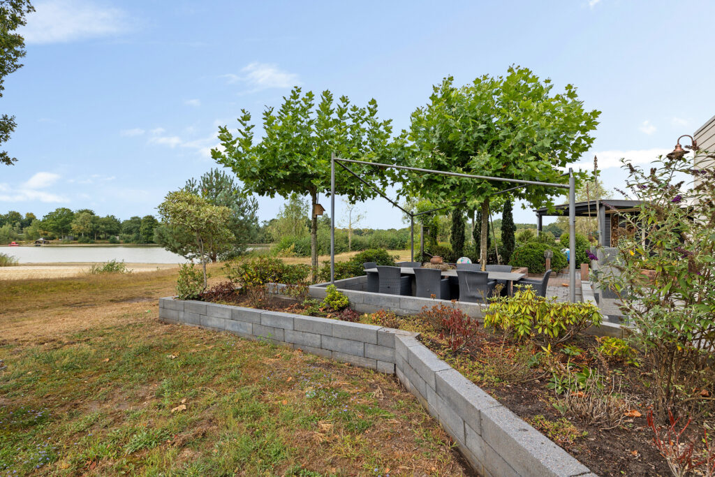 De onder architectuur aangelegde tuin beschikt over twee terrasmogelijkheden zowel open dan wel onderdak met uitzicht over het schitterende water.