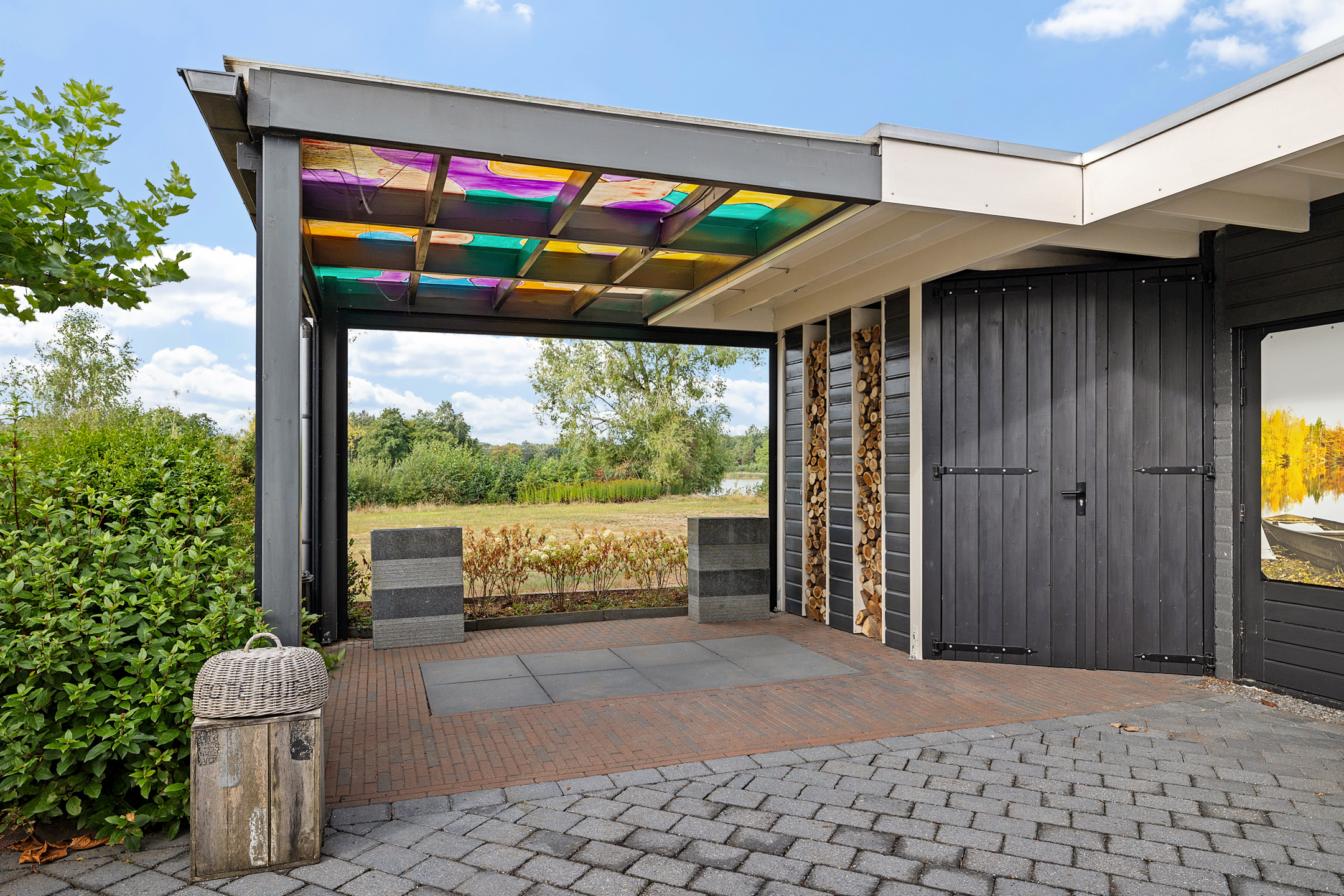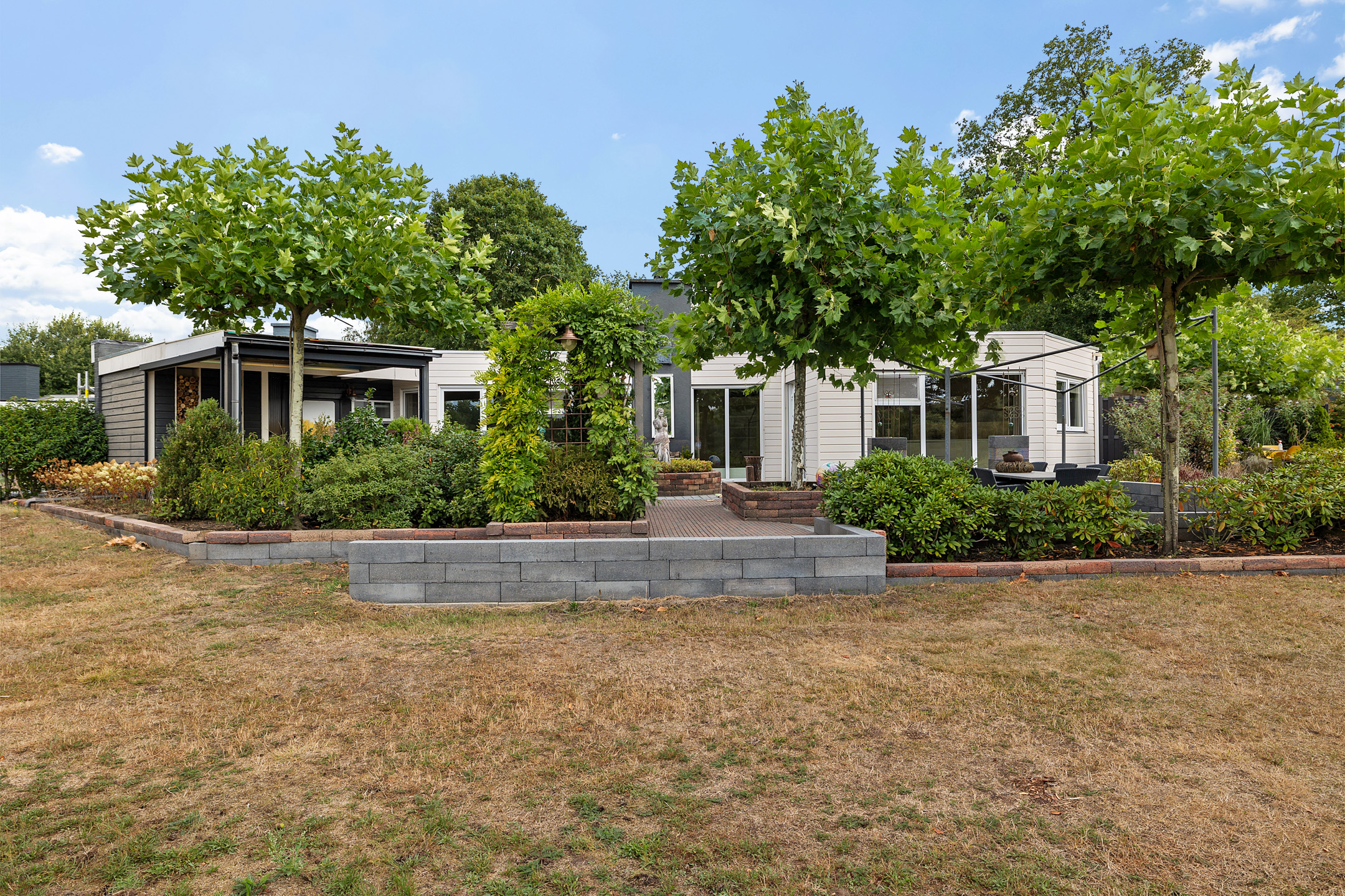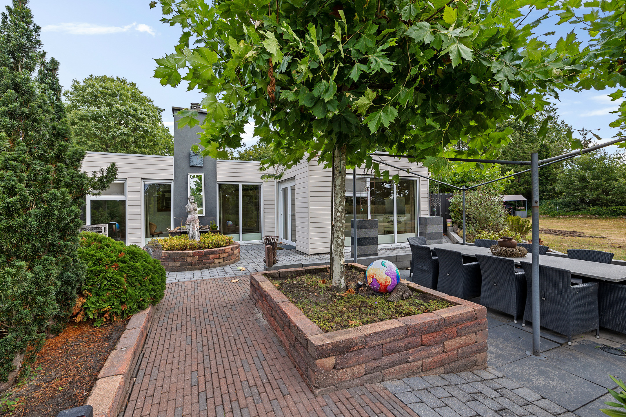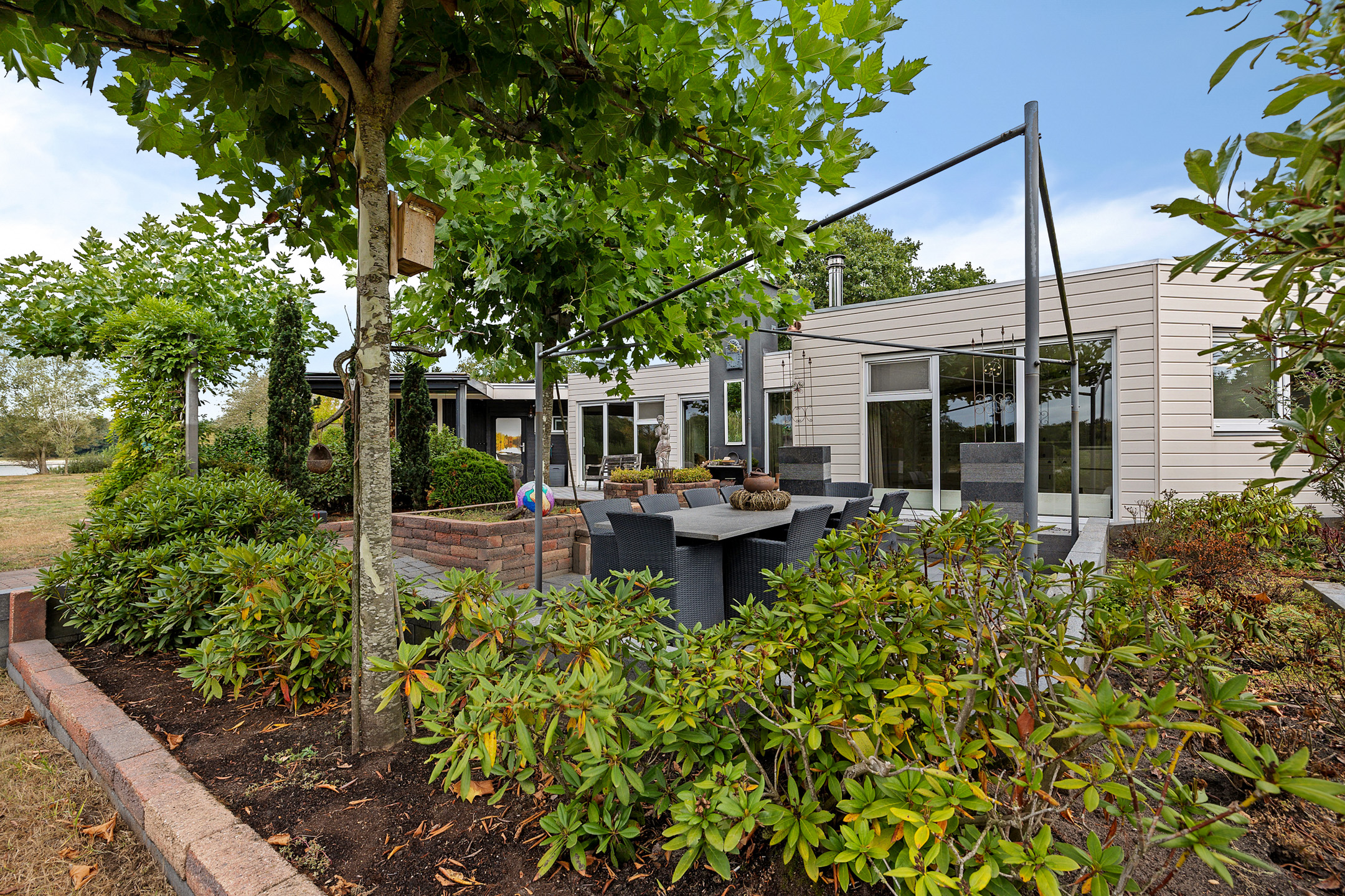 De onder architectuur aangelegde tuin beschikt over twee terrasmogelijkheden zowel open dan wel onderdak met uitzicht over het schitterende water.