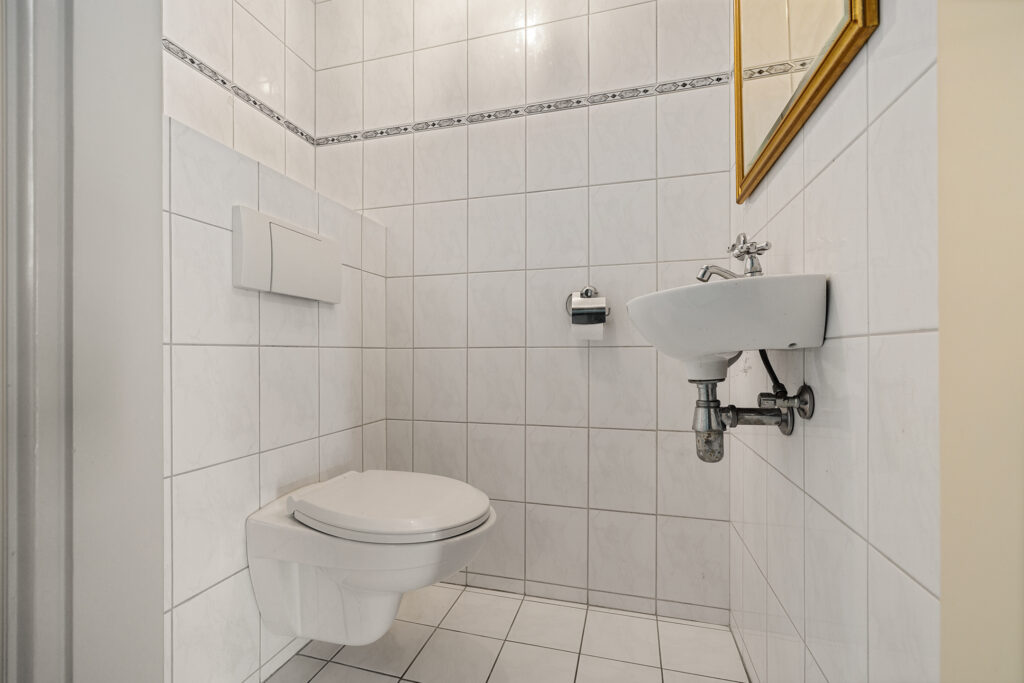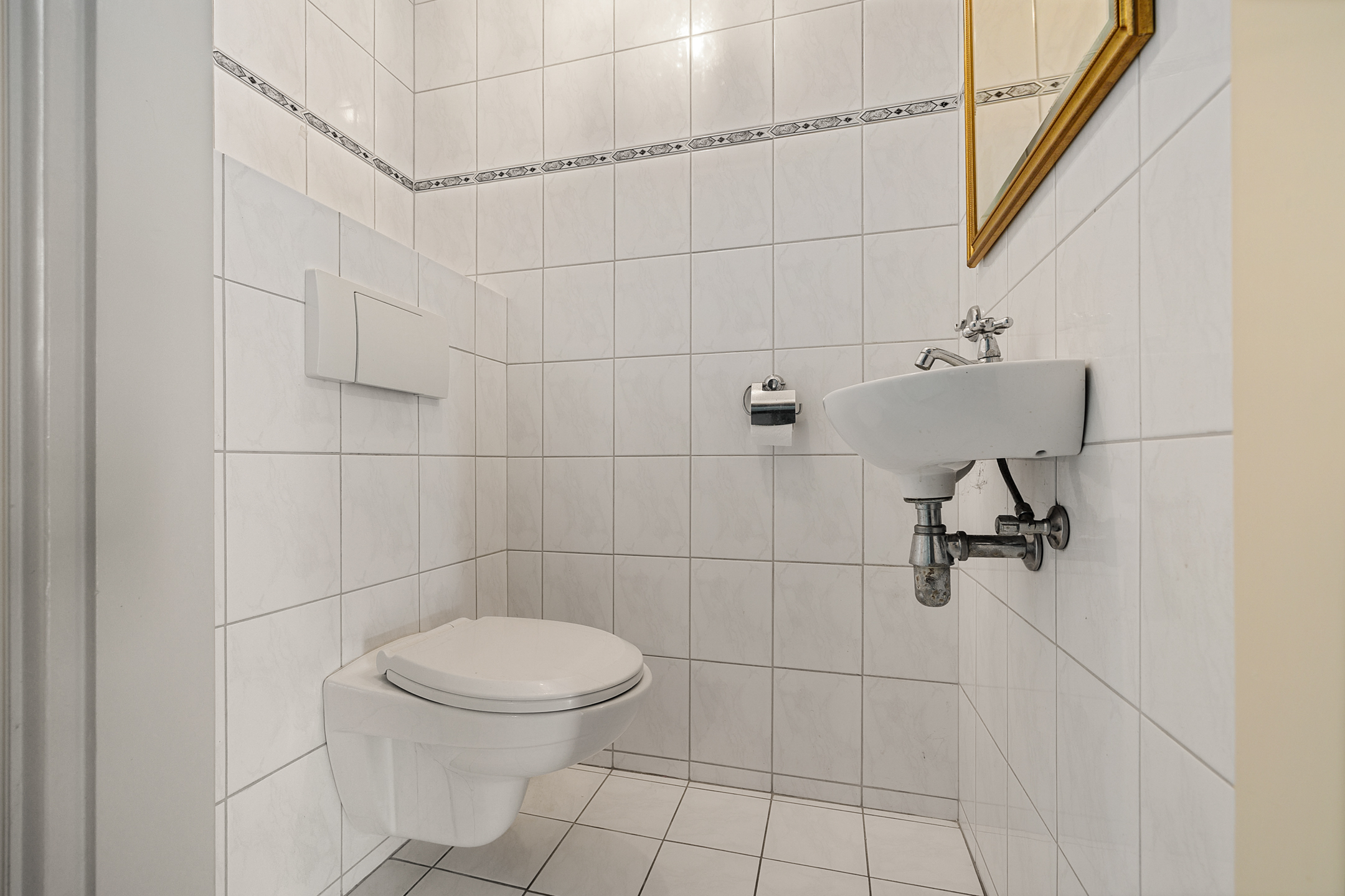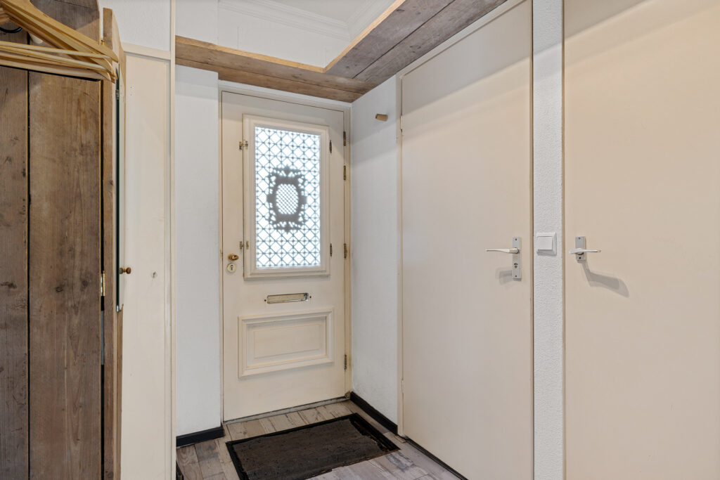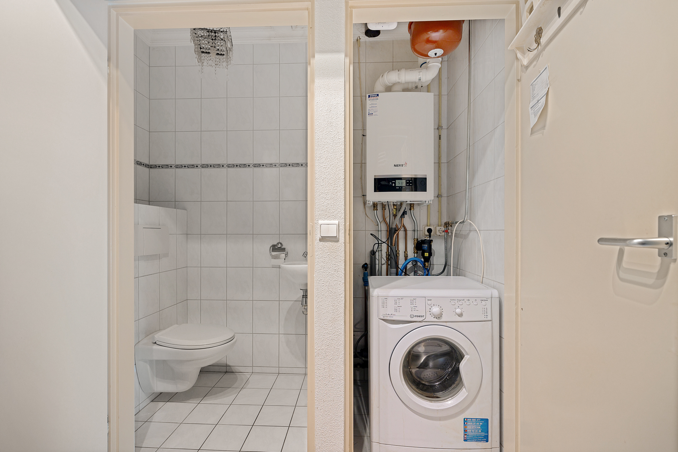 Via de voordeur kom je binnen in de hal waar zich aan de linkerzijde het toilet bevindt inclusief fonteintje. Daarnaast bevindt zich de technische ruimte met de CV-opstelling en de wasmachine-aansluiting. Aan de rechterzijde bevindt zich de meterkast en de garderobe.