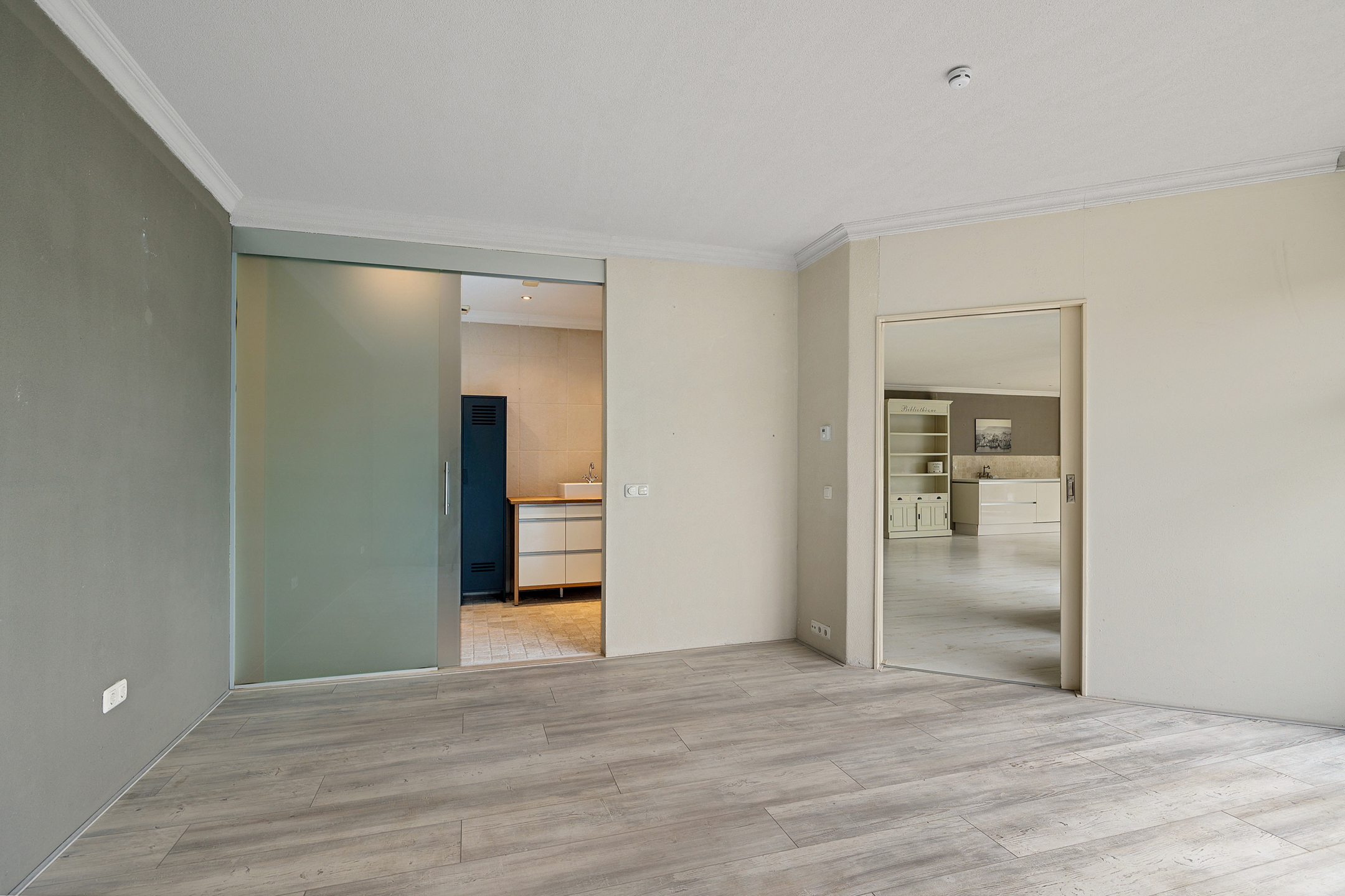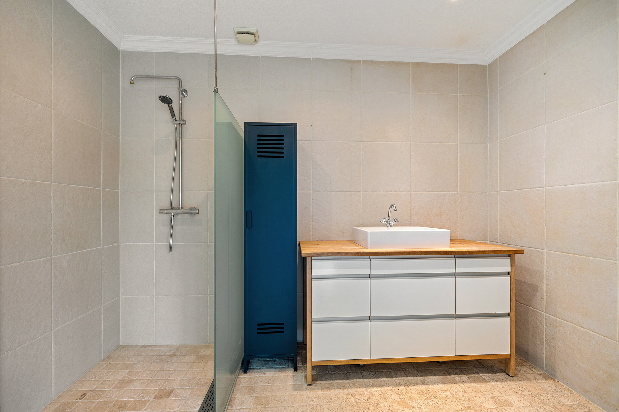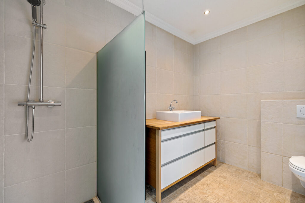 Naast de woonkamer bevindt zich de slaapkamer met een ensuite badkamer welke is voorzien van een inloopdouche, toilet en een wastafelmeubel. Door de keuze van de transparante kleuren straalt de badkamer moderniteit uit.