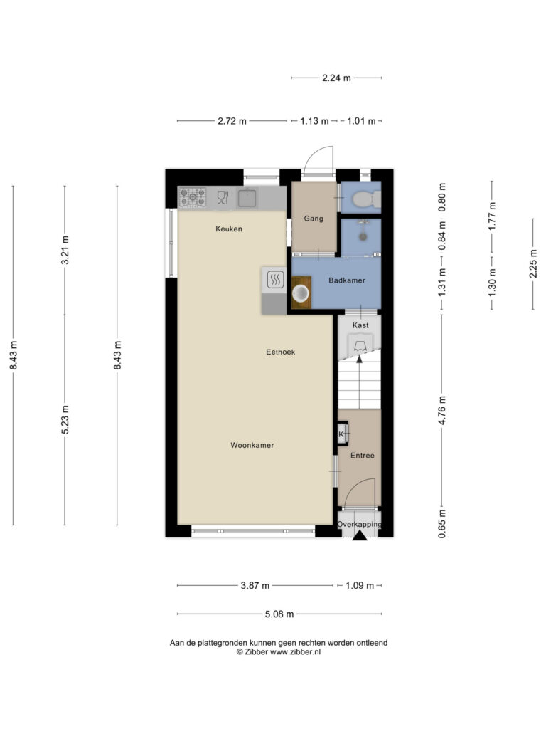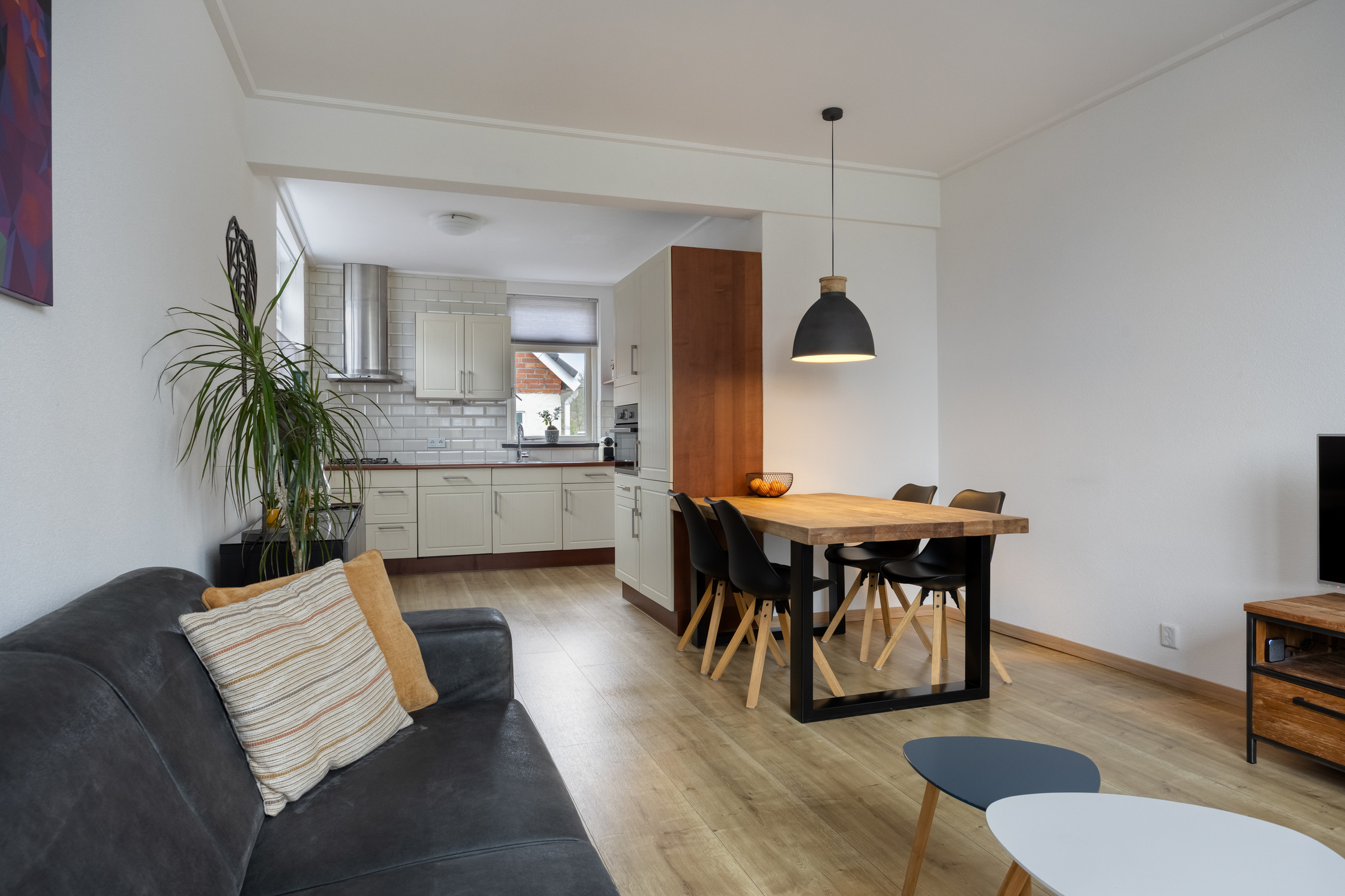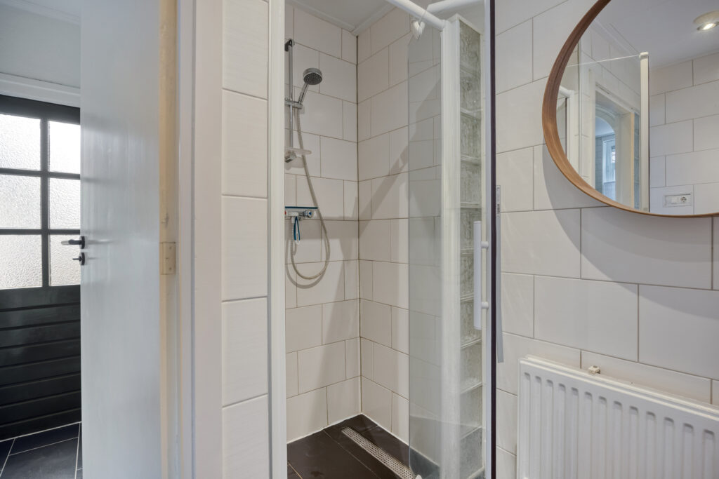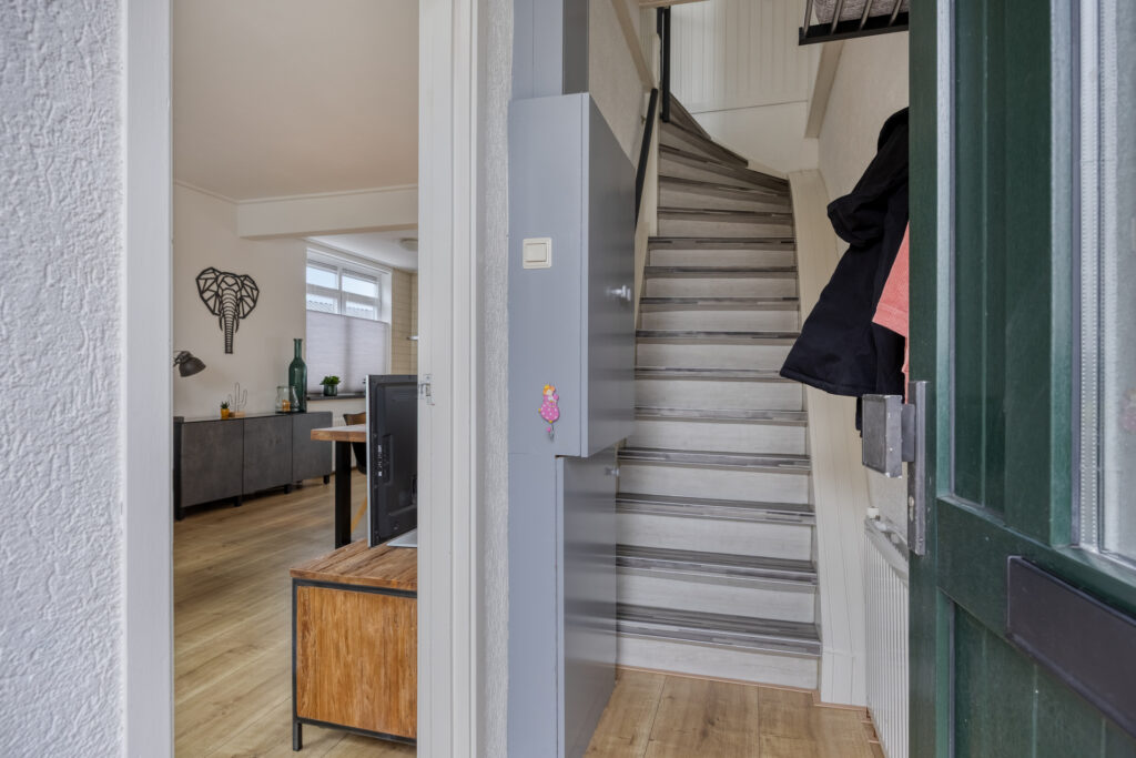 Begane grond: entree/hal met trapopgang; lichte doorzonwoonkamer; open keuken voorzien van diverse inbouwapparatuur, waaronder een vaatwasser, combimagnetron en koel-/vriescombinatie; achterhal met toilet en achterentree; badkamer met douche, wastafel en kast voor wasmachine.