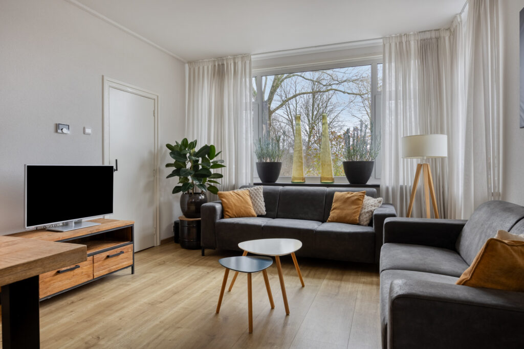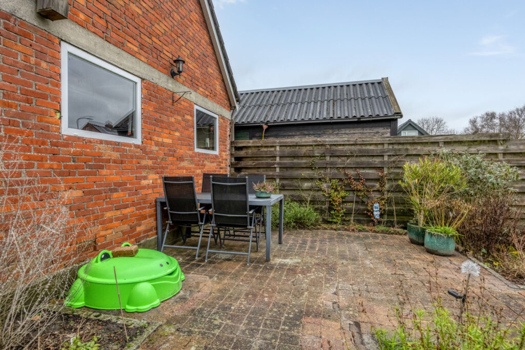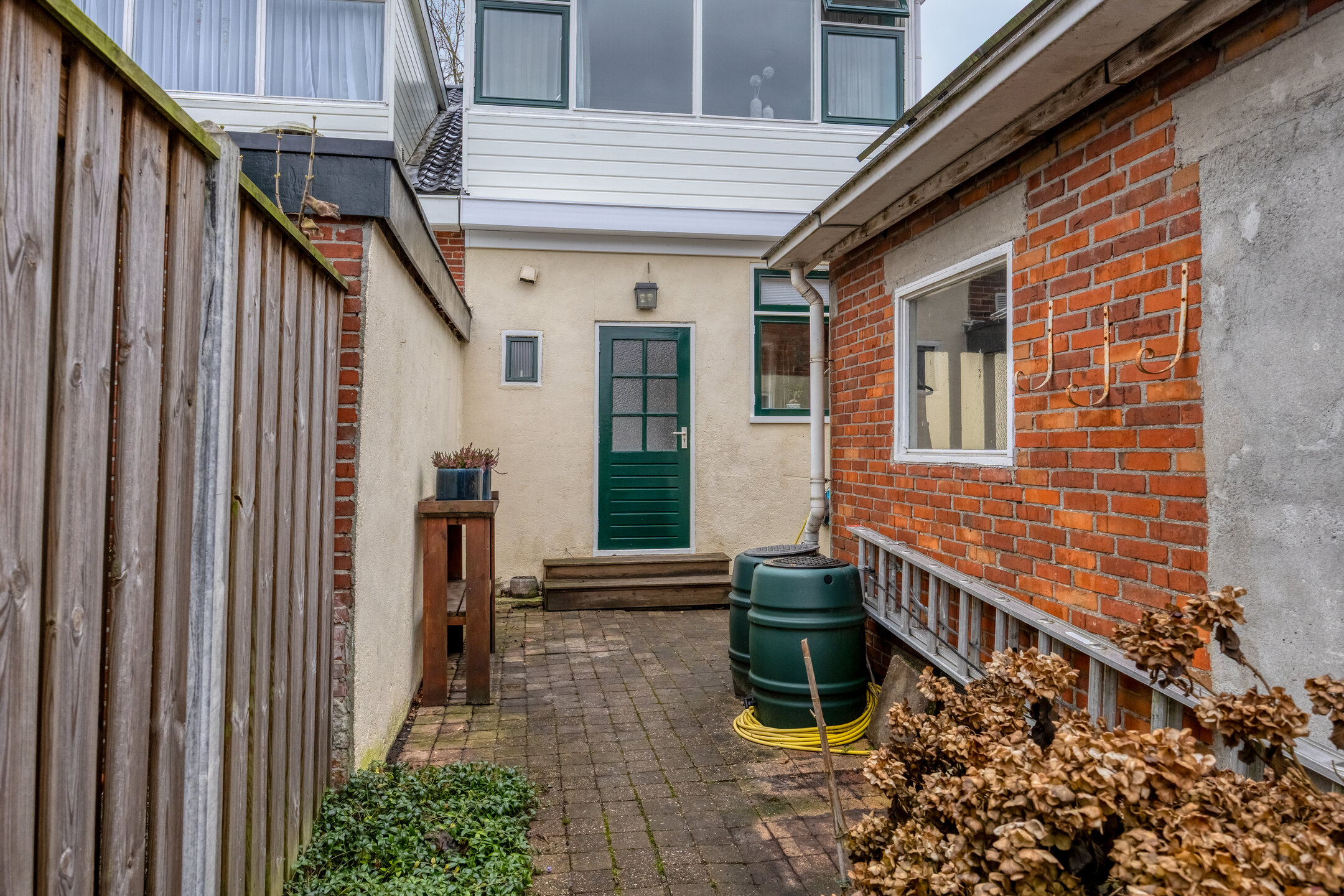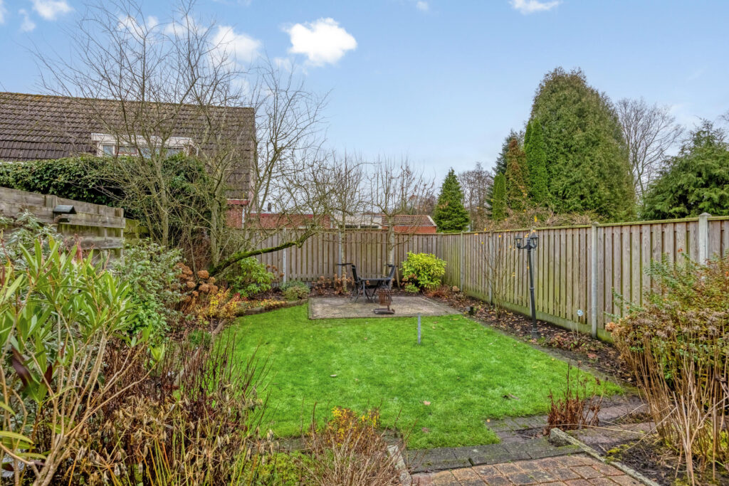 De mooi aangelegde achtertuin op het oosten met twee terrassen biedt een fijne buitenruimte. De schutting en leilindes zorgen voor veel privacy.