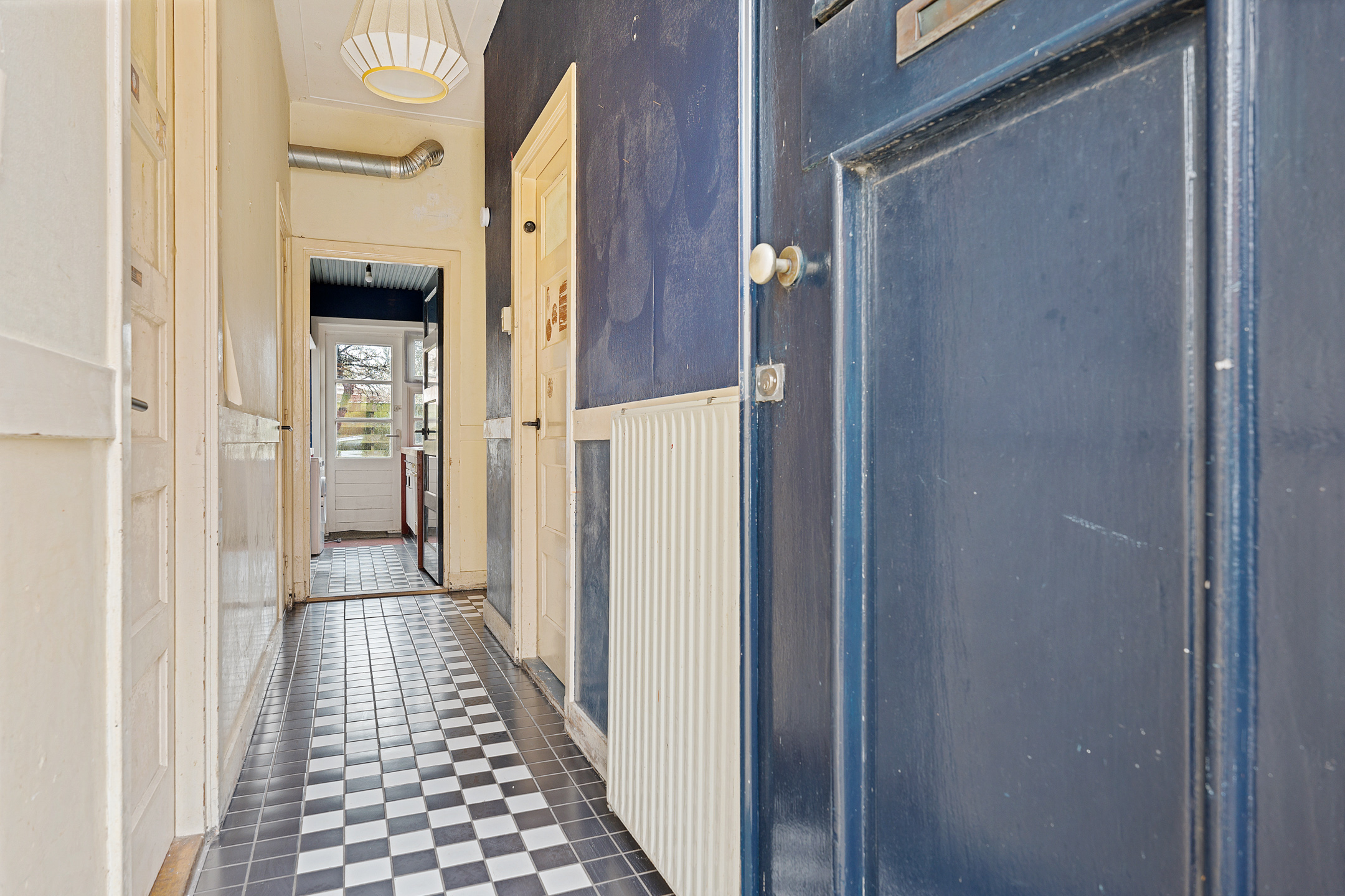Via de entree komt u in de hal, die toegang biedt tot de verschillende vertrekken van de woning. Aan de linkerzijde bevindt zich de eerste slaapkamer, voorzien van kastruimte. Aan de rechterzijde treft u de woonkamer, die in verbinding staat met de eetkamer aan de achterzijde van de woning. De eetkamer is eveneens vanuit de hal bereikbaar, wat zorgt voor een praktische en speelse indeling.