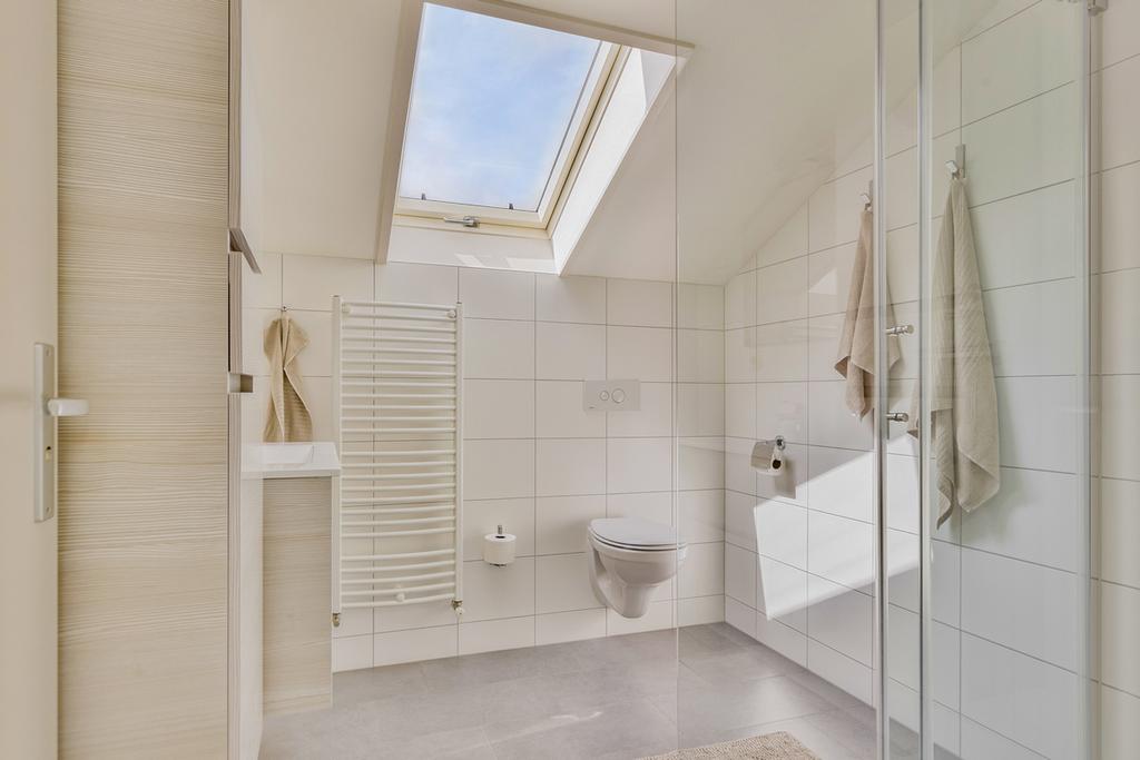 Op de tweede woonlaag bevindt zich een ruime slaapkamer en een tweede badkamer. Deze badkamer is uitgerust met een douchecabine met rainshower, een wastafelmeubel en een tweede toilet. Daarnaast is er een praktische bijkeuken/pantry met aansluitingen voor wasmachine, droger en vriezer.