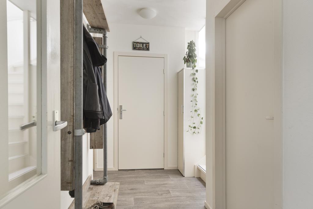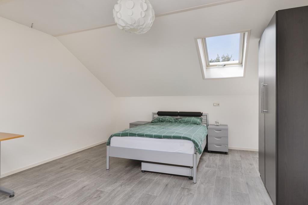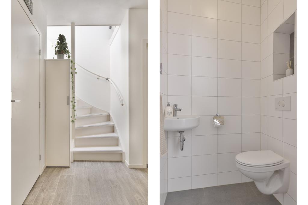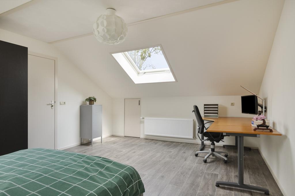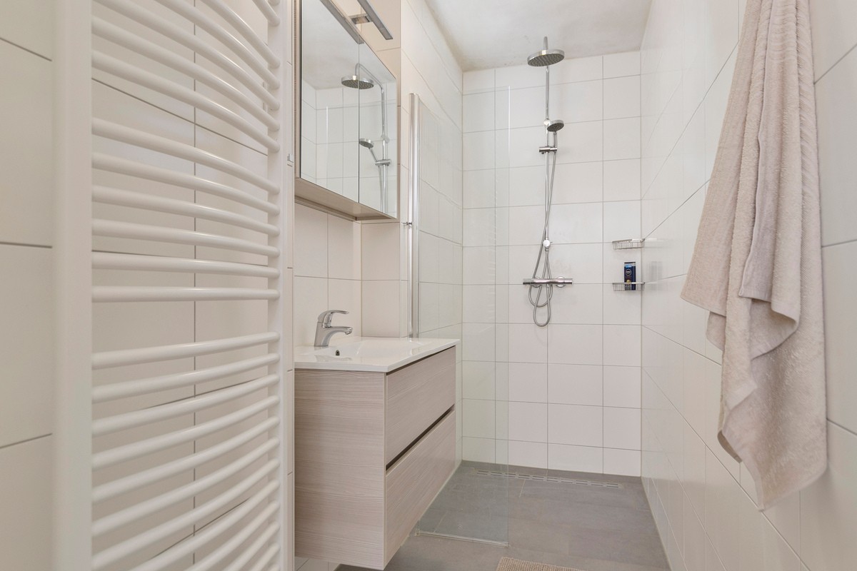 Op deze woonlaag bevindt zich tevens een ruime slaapkamer, ideaal als hoofdslaapkamer, werkkamer of logeerkamer. Verder zijn er handige inbouwkasten onder de trap aanwezig, wat zorgt voor extra bergruimte. De moderne badkamer is voorzien van een inloopdouche en een stijlvol wastafelmeubel.
