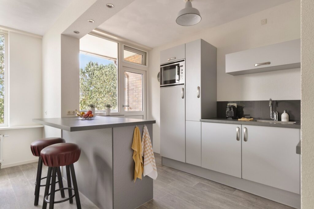 De open keuken is modern uitgevoerd en voorzien van diverse inbouwapparatuur, waaronder een afzuigkap, koelkast, combi-oven en vaatwasser. Het praktische keukeneiland zorgt voor extra werk- en opbergruimte.