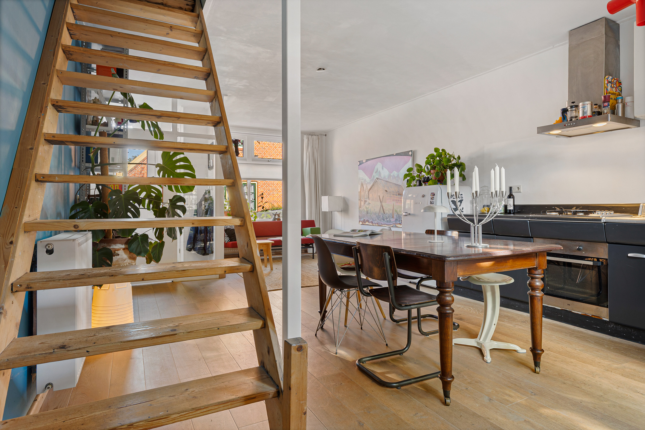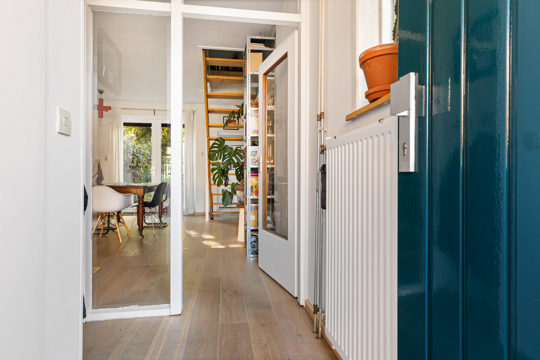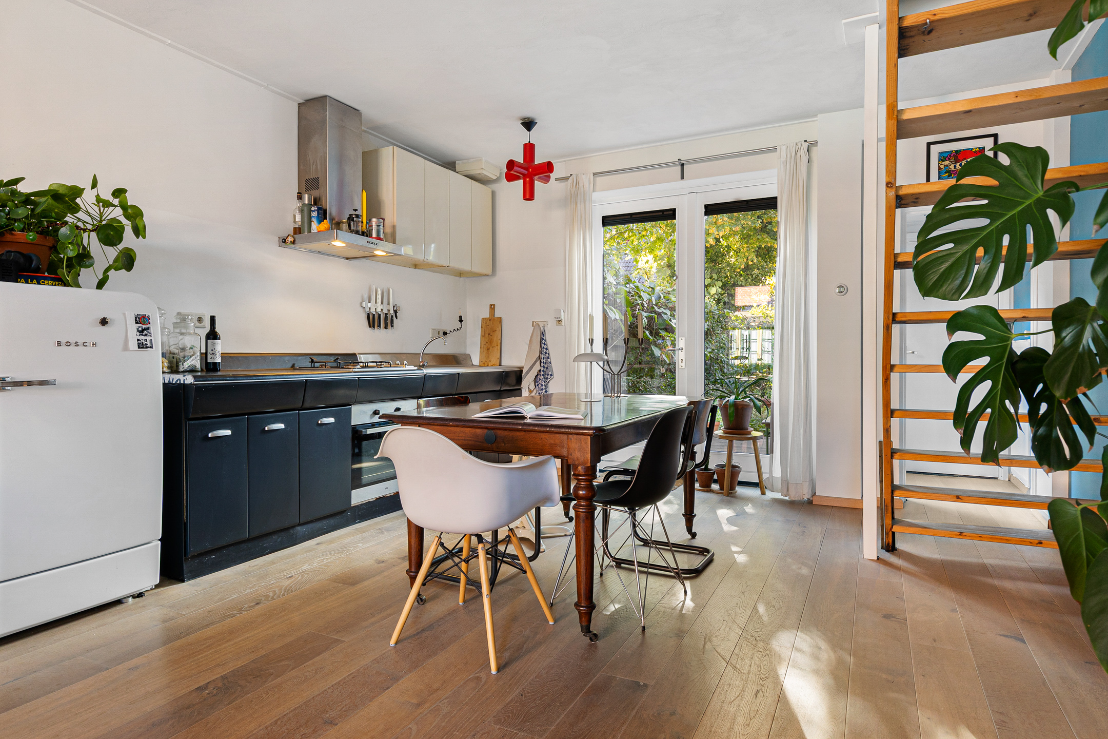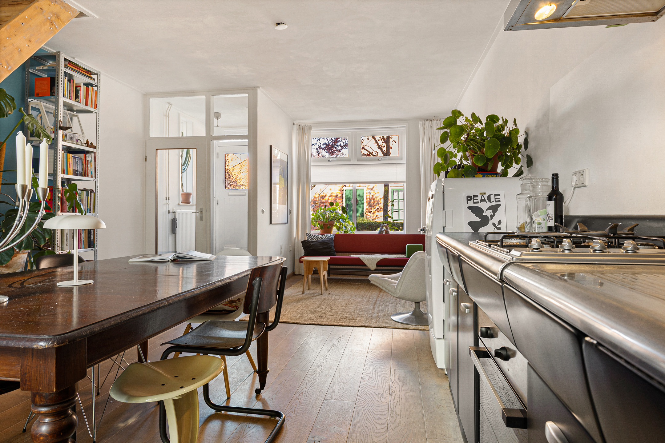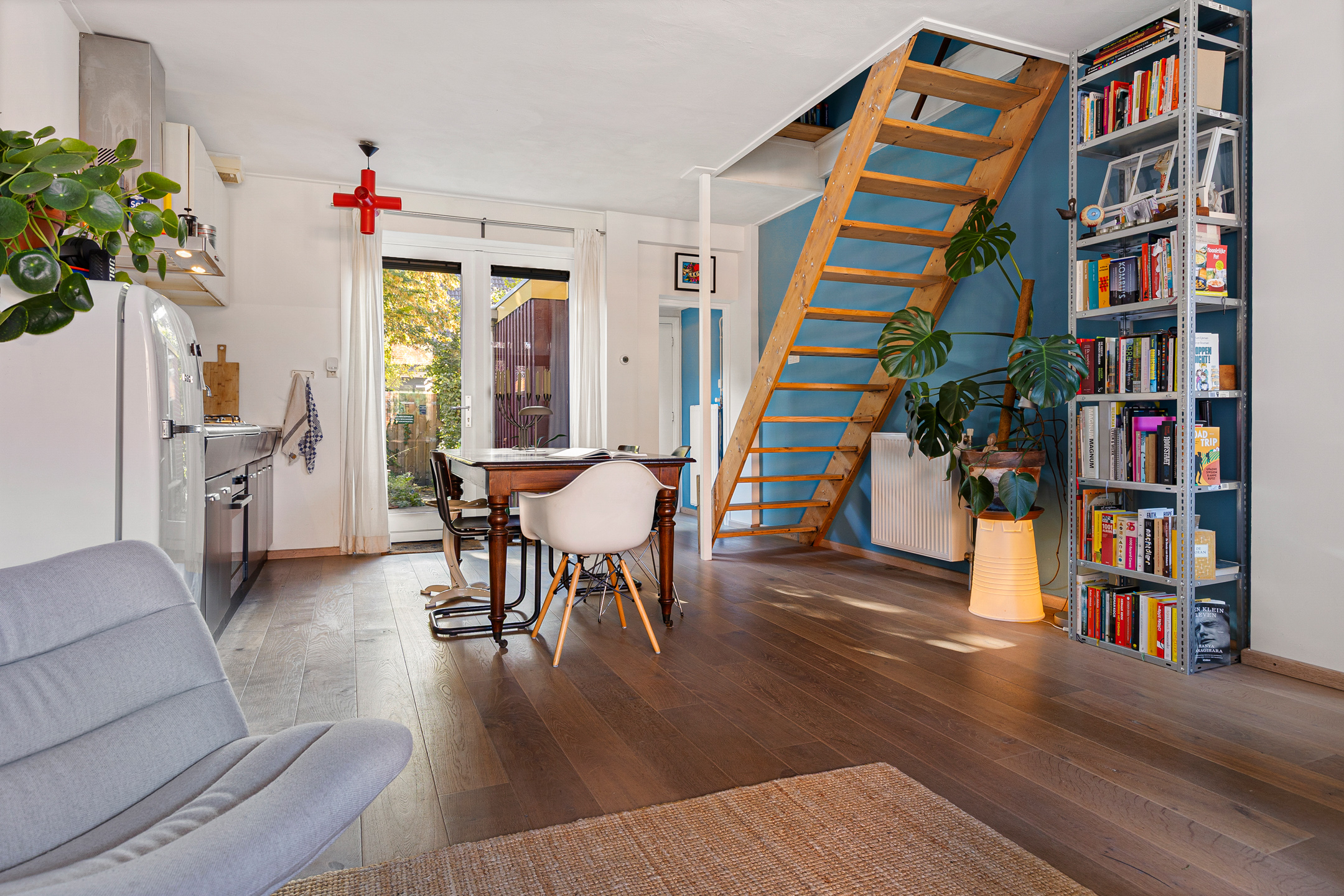 U komt binnen via de hal met meterkast en garderobe, een glazen deur geeft toegang tot de lichte woonkamer. Dankzij de grote raampartijen valt er heerlijk veel daglicht binnen en de indeling maakt het geheel praktisch en sfeervol. De unieke stalen retro design keuken biedt voldoende werkruimte en grenst aan de achtertuin. Verder vindt u op de begane grond een apart toilet en een aangebouwde berging, die bereikbaar is via de tuin.