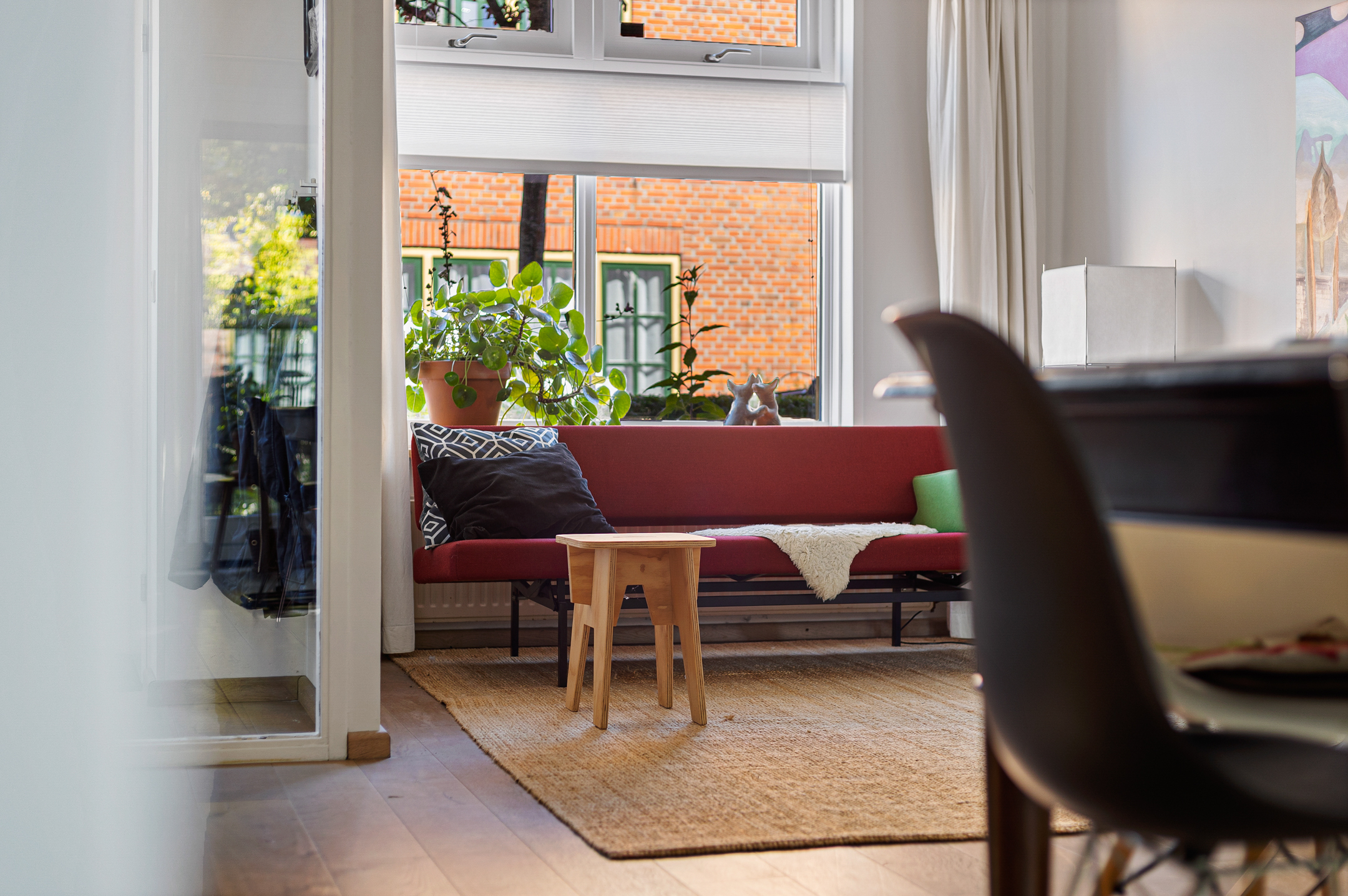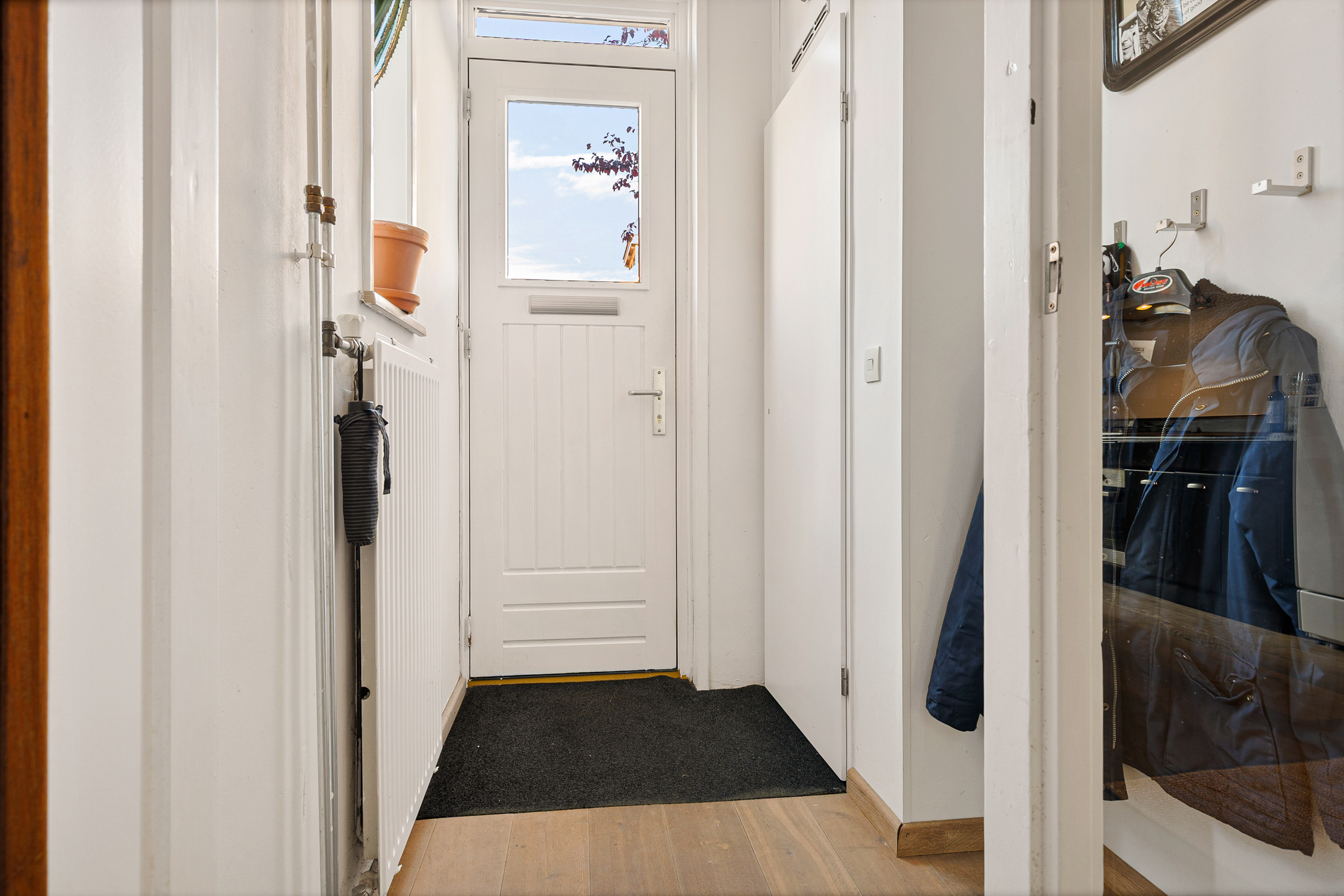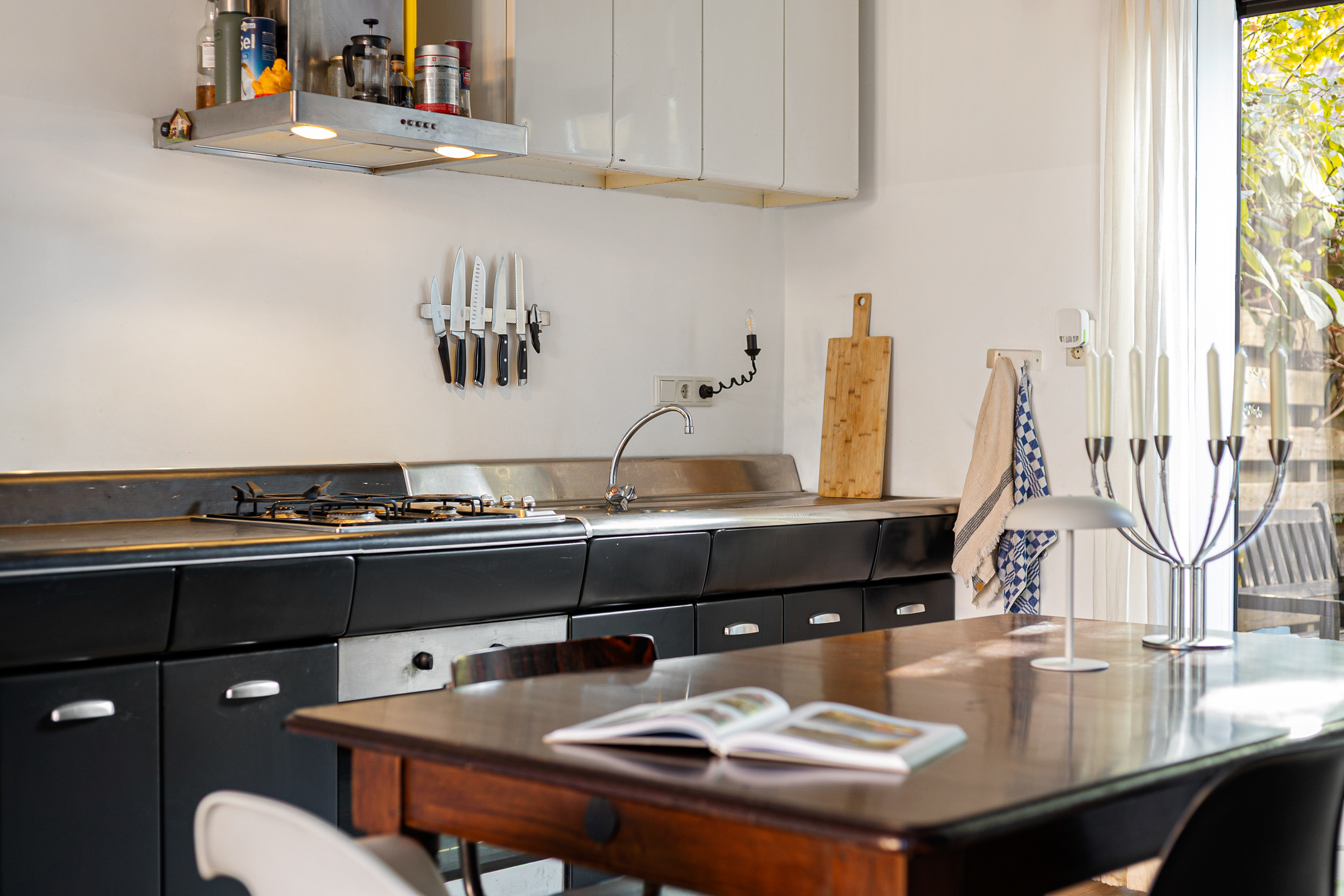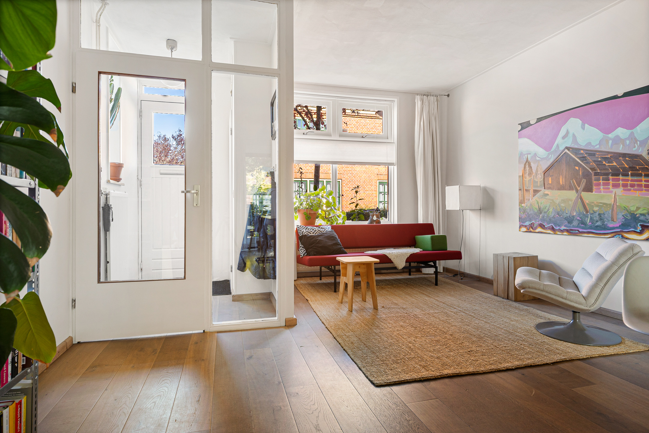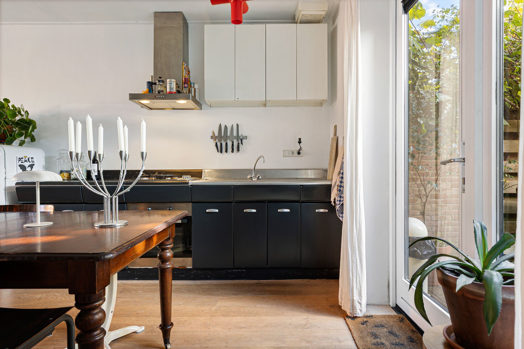 U komt binnen via de hal met meterkast en garderobe, een glazen deur geeft toegang tot de lichte woonkamer. Dankzij de grote raampartijen valt er heerlijk veel daglicht binnen en de indeling maakt het geheel praktisch en sfeervol. De unieke stalen retro design keuken biedt voldoende werkruimte en grenst aan de achtertuin. Verder vindt u op de begane grond een apart toilet en een aangebouwde berging, die bereikbaar is via de tuin.