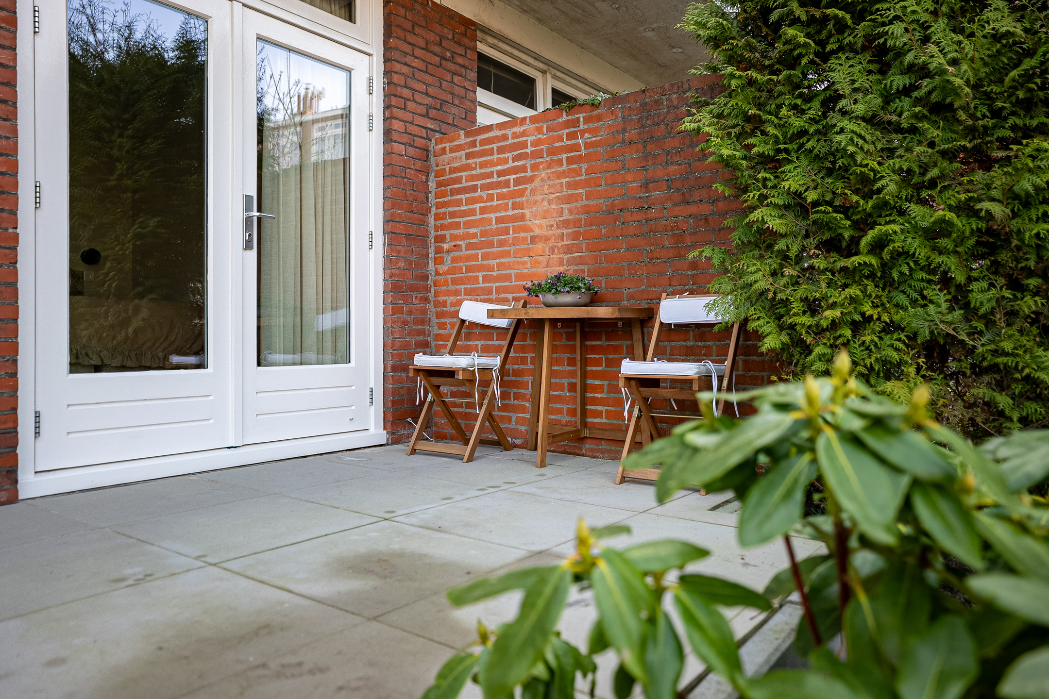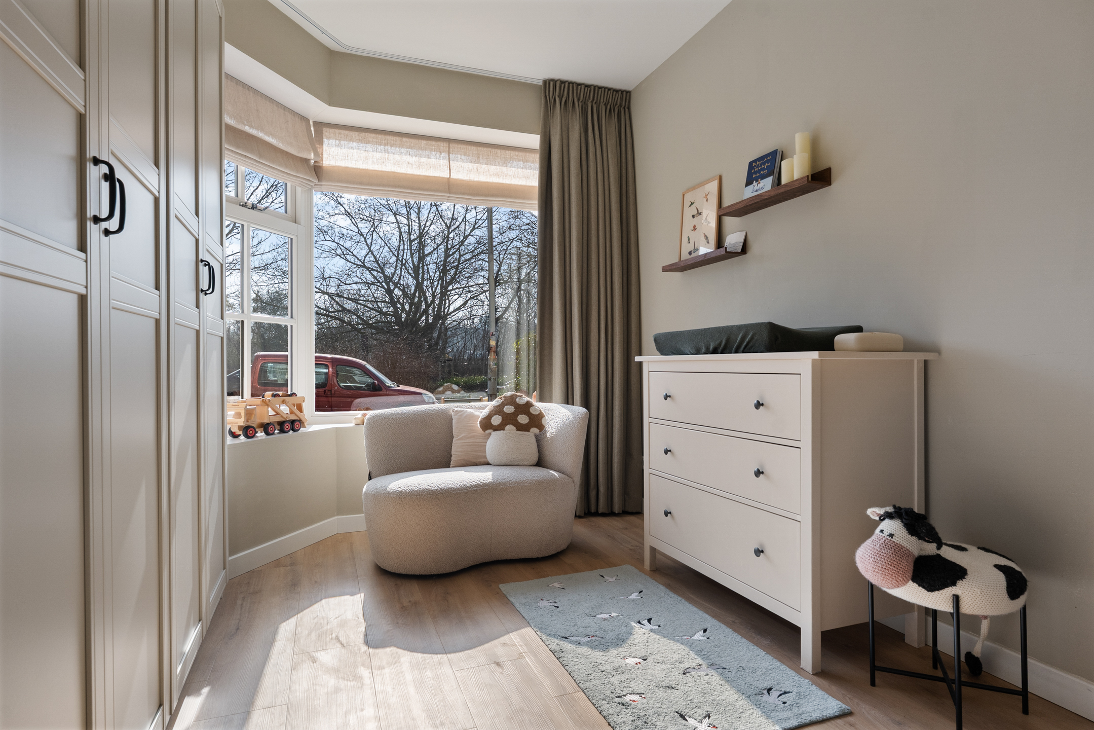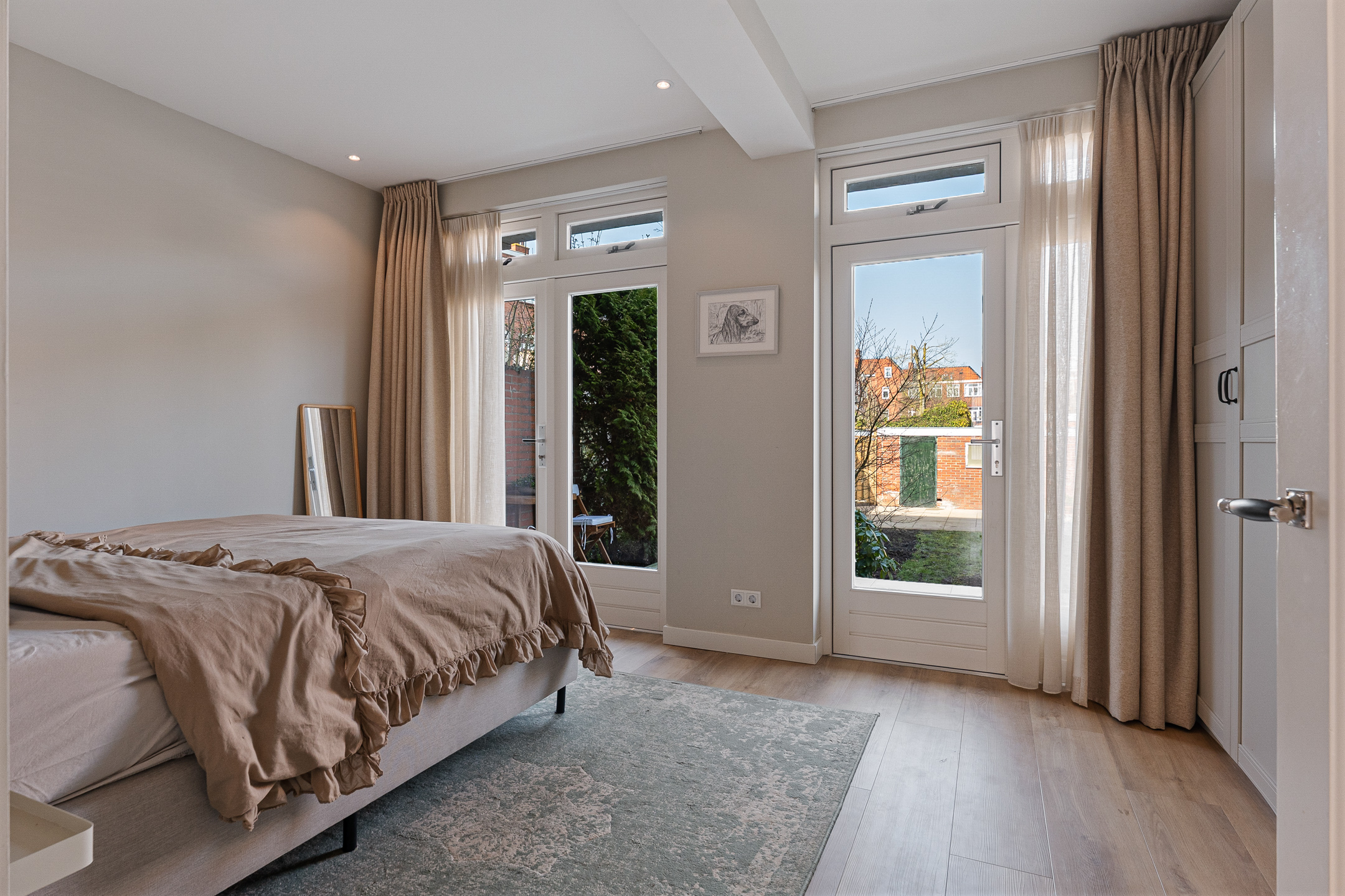 Recht vooruit, aan de achterzijde van de woning, bevindt zich de tweede slaapkamer. Deze ruime kamer beschikt over openslaande deuren naar de tuin, waardoor binnen en buiten mooi met elkaar verbonden worden.