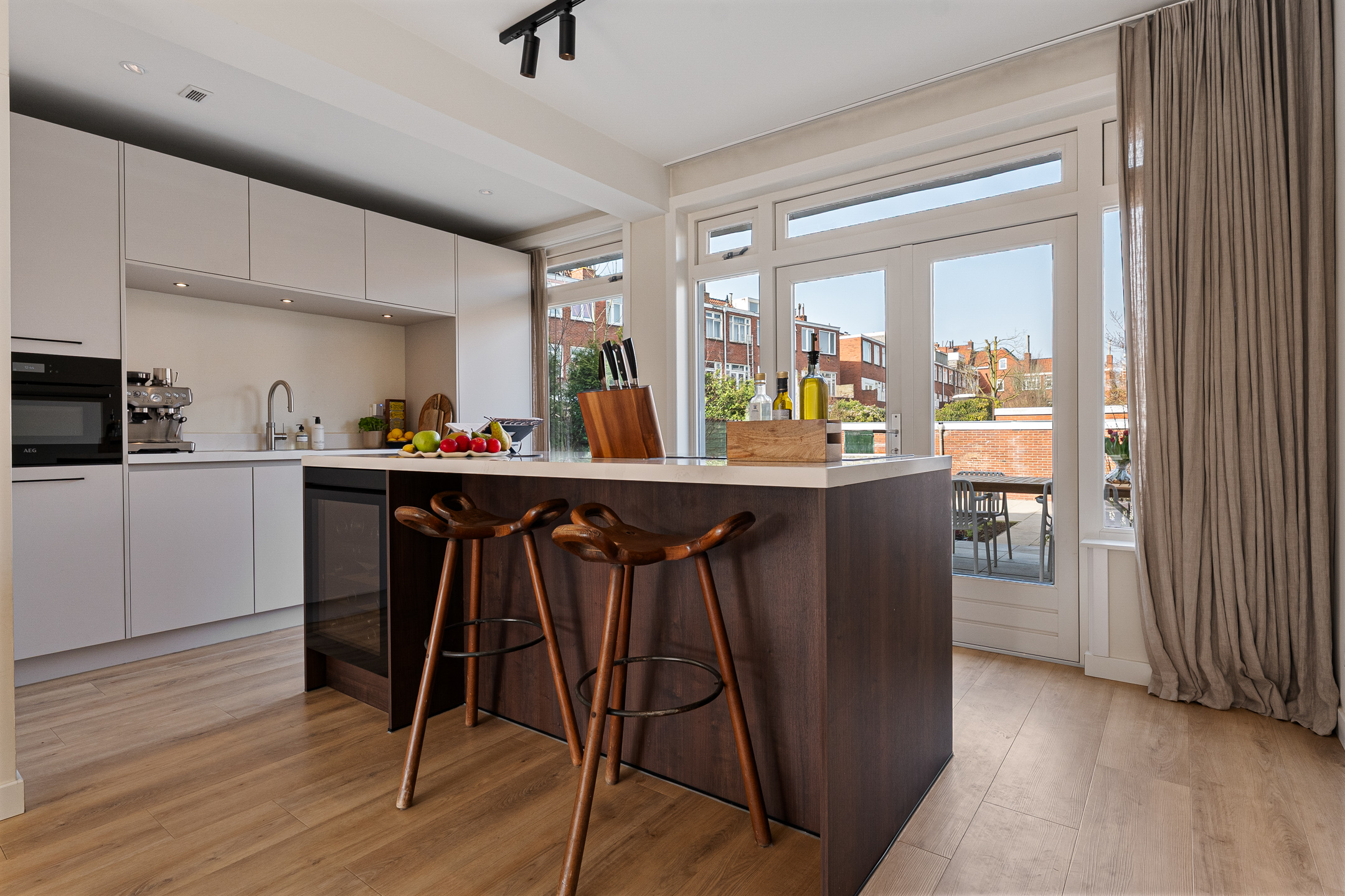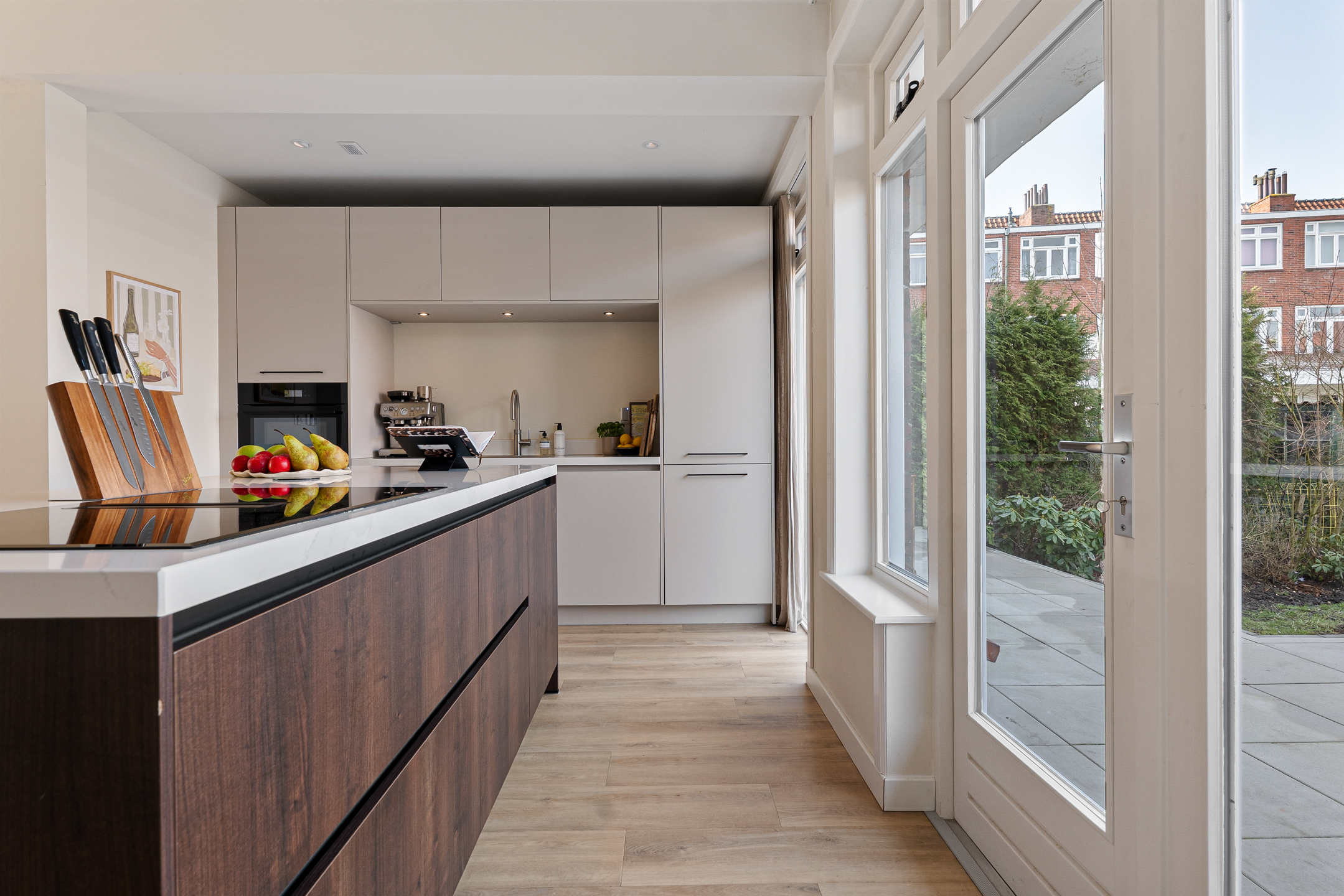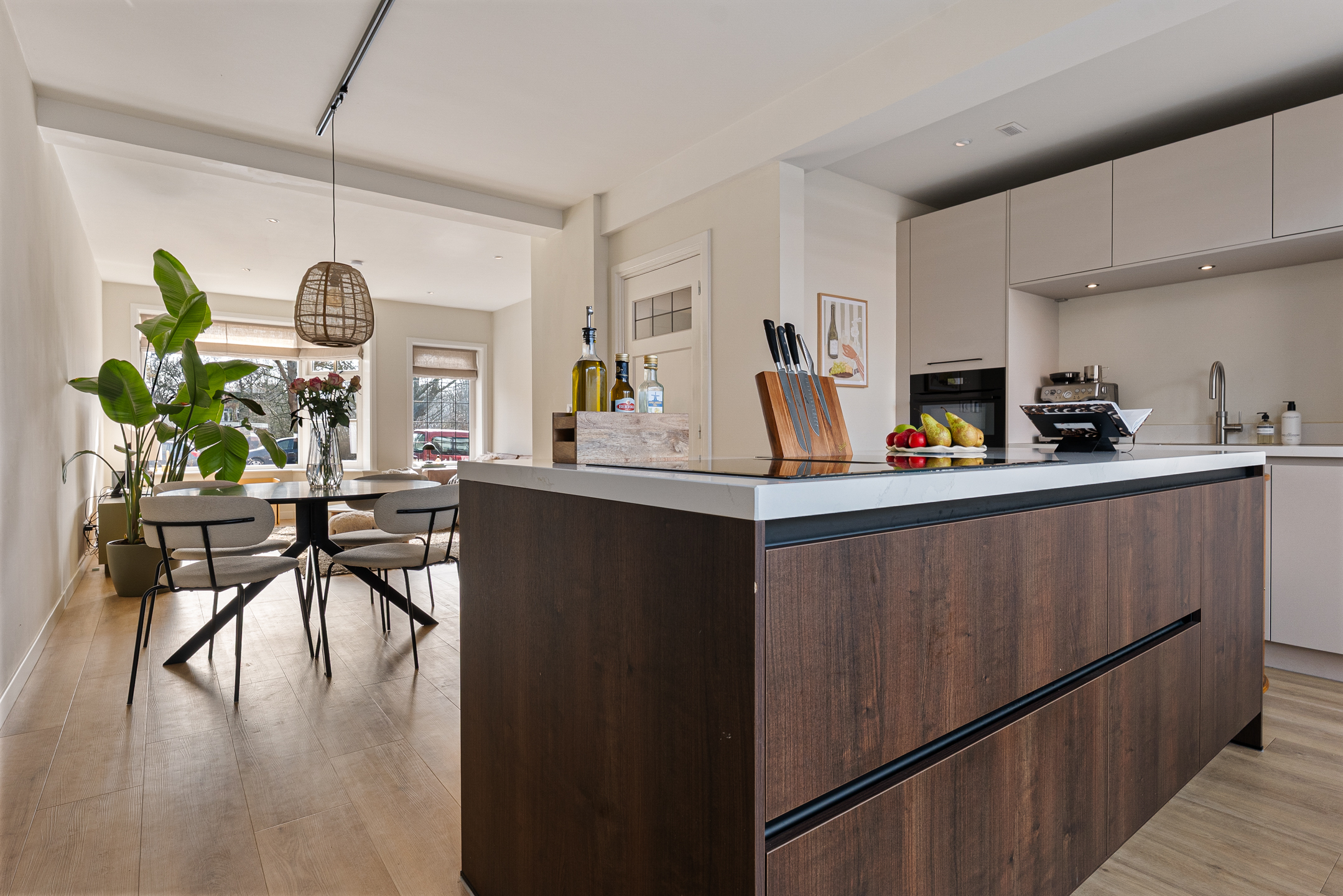De woonkamer staat in open verbinding met de moderne woonkeuken (2024), waardoor een mooie, lichte en ruimtelijke leefruimte ontstaat. De keuken is ingericht met een kookeiland en diverse inbouwapparatuur, waaronder een kookplaat, combi-oven, vaatwasser, koel-vriescombinatie, klimaatkast en een Quooker. Vanuit de keuken is er direct toegang tot de tuin.