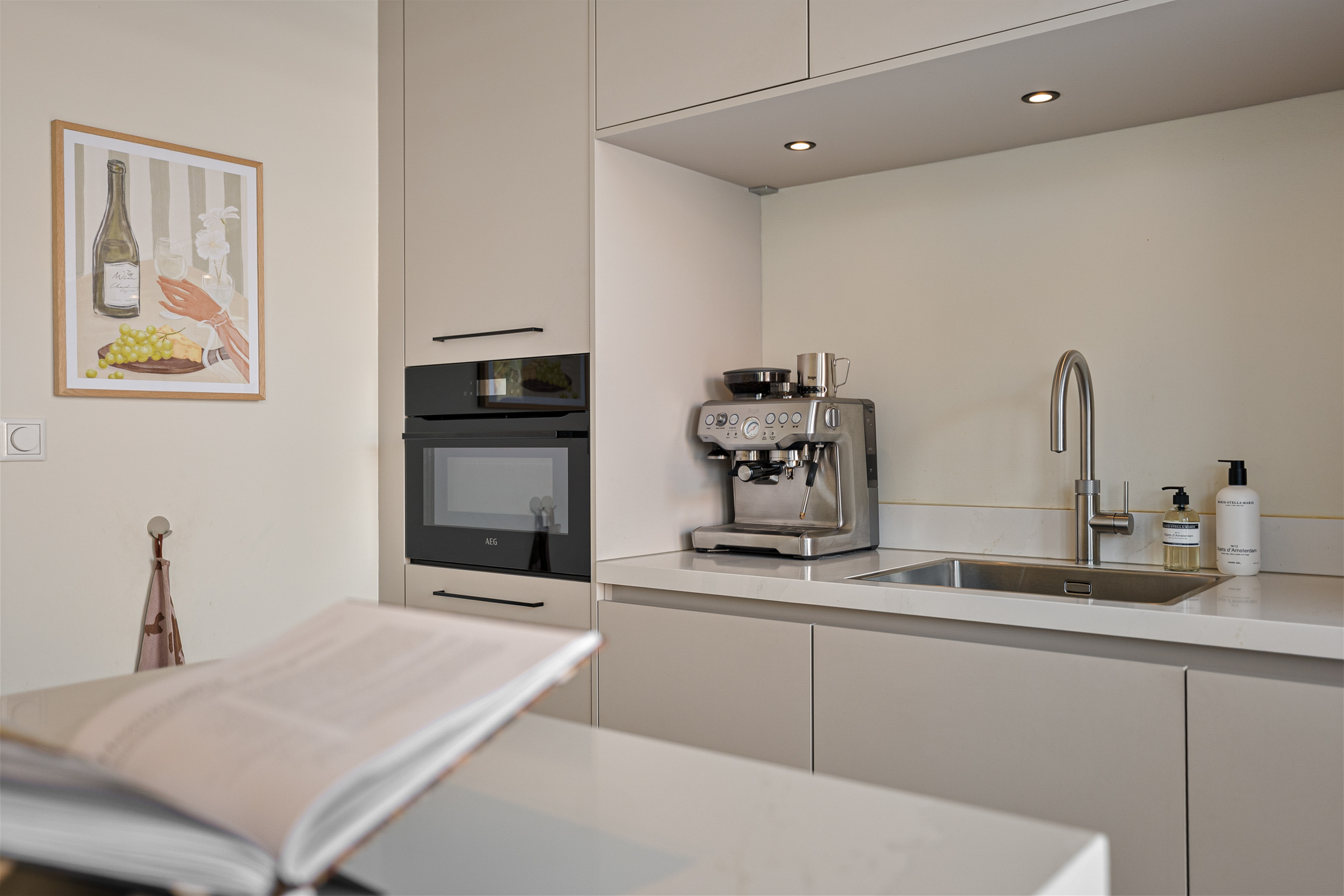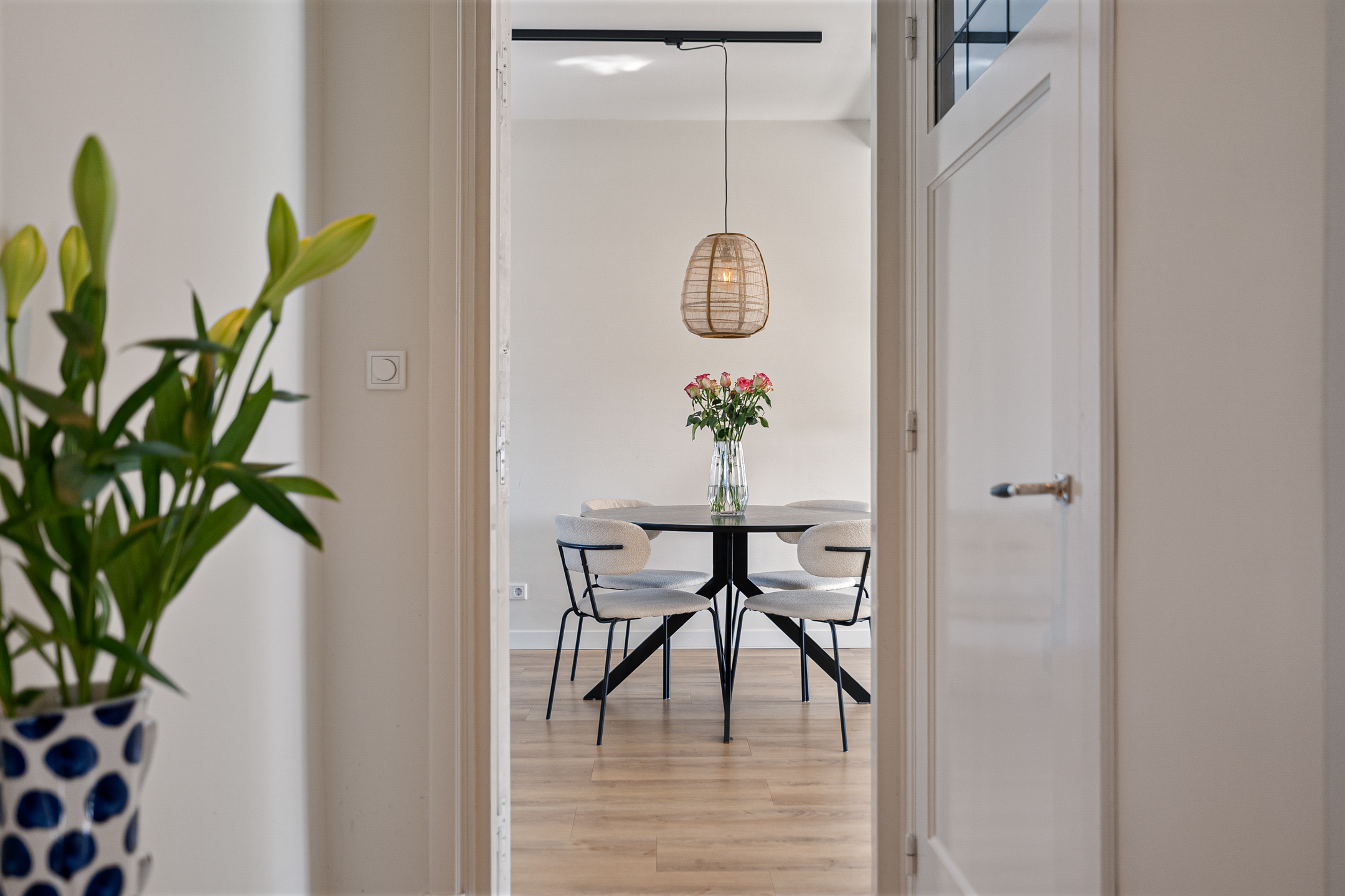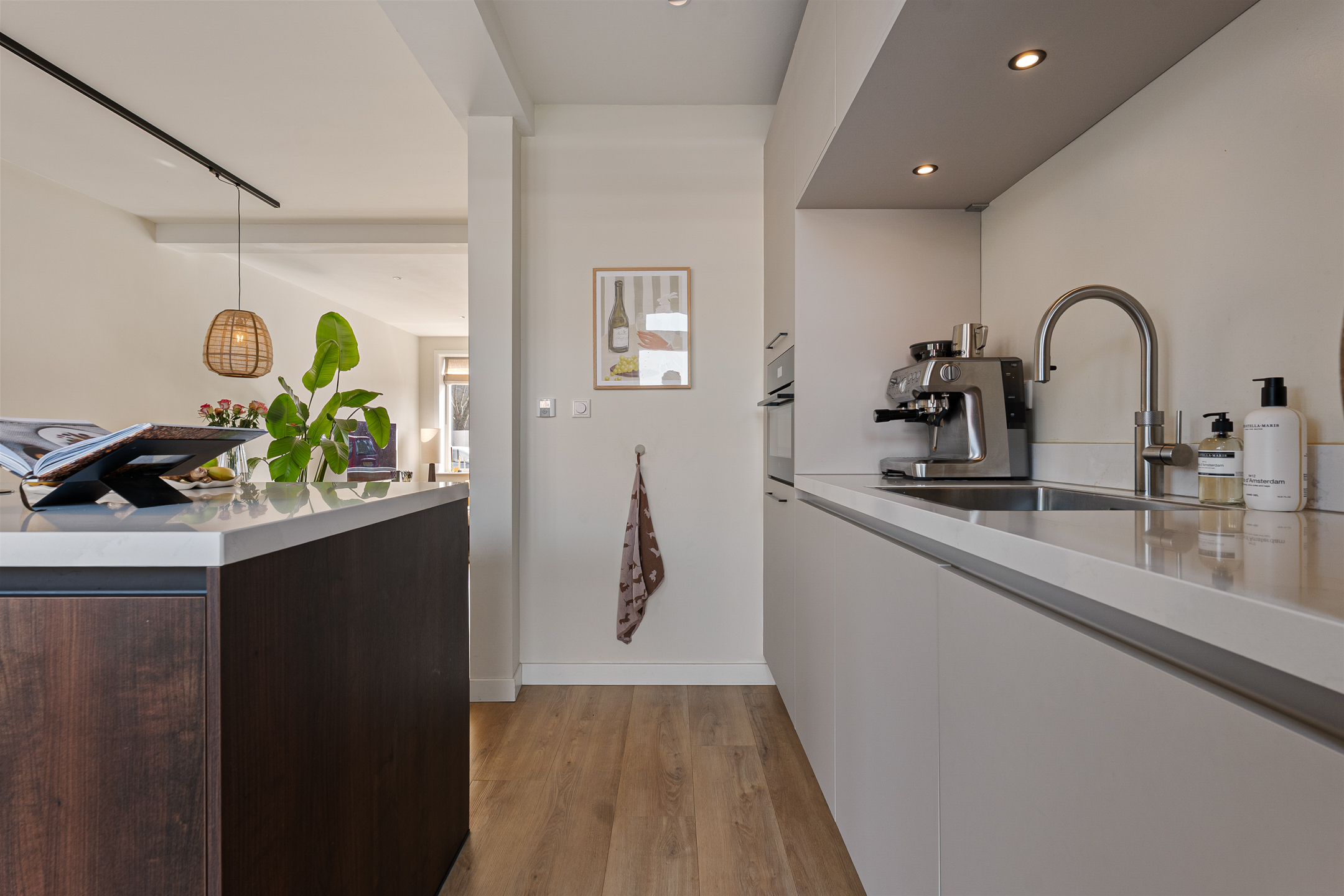 De woonkamer staat in open verbinding met de moderne woonkeuken (2024), waardoor een mooie, lichte en ruimtelijke leefruimte ontstaat. De keuken is ingericht met een kookeiland en diverse inbouwapparatuur, waaronder een kookplaat, combi-oven, vaatwasser, koel-vriescombinatie, klimaatkast en een Quooker. Vanuit de keuken is er direct toegang tot de tuin.