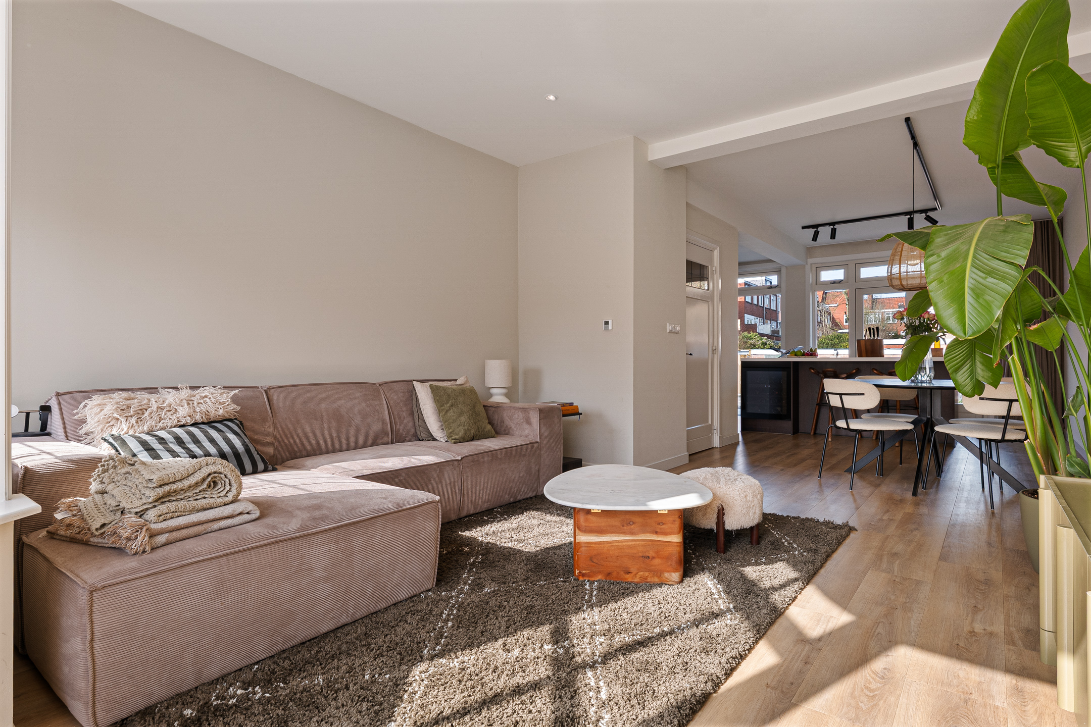 Aan het einde van de hal bereik je de lichte woonkamer aan de voorzijde van de woning. Dankzij de grote raampartijen valt hier veel daglicht naar binnen en is er volop ruimte voor een comfortabele zit- en eethoek.