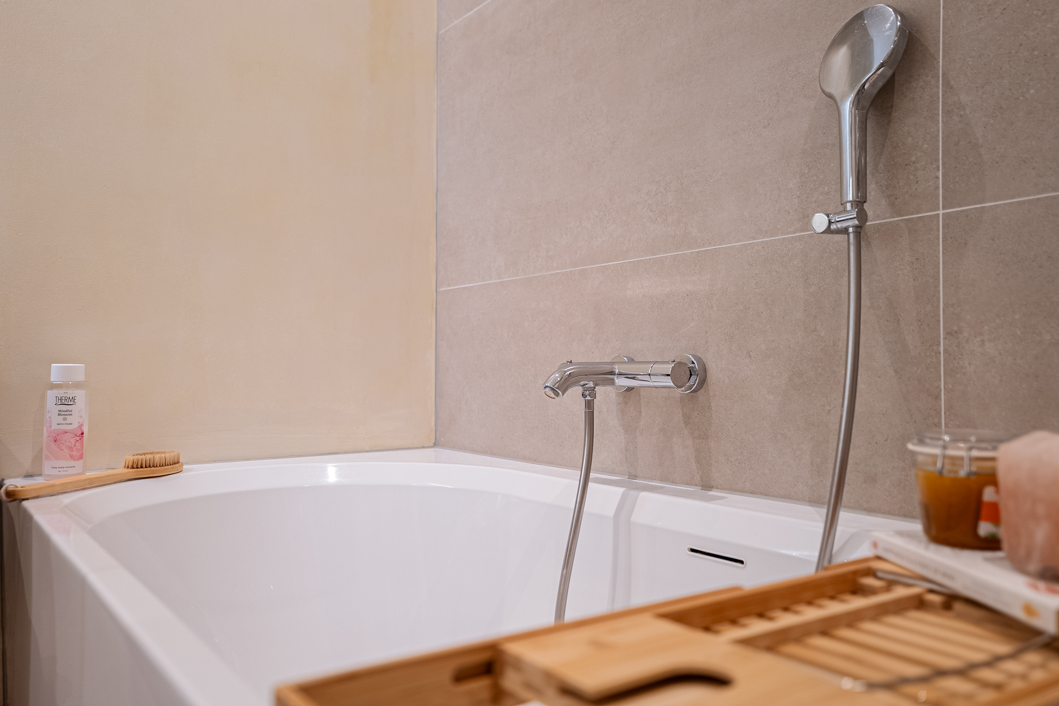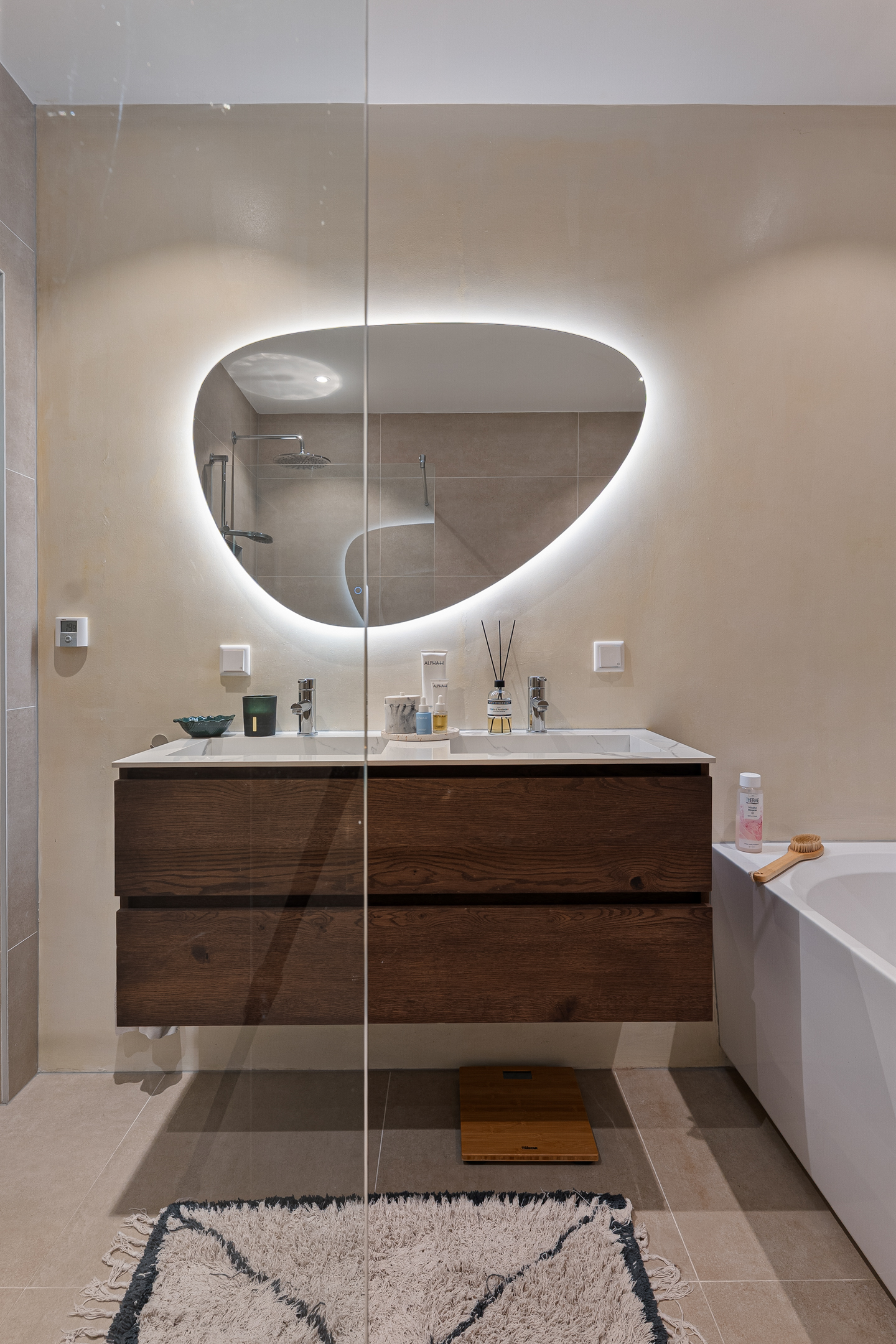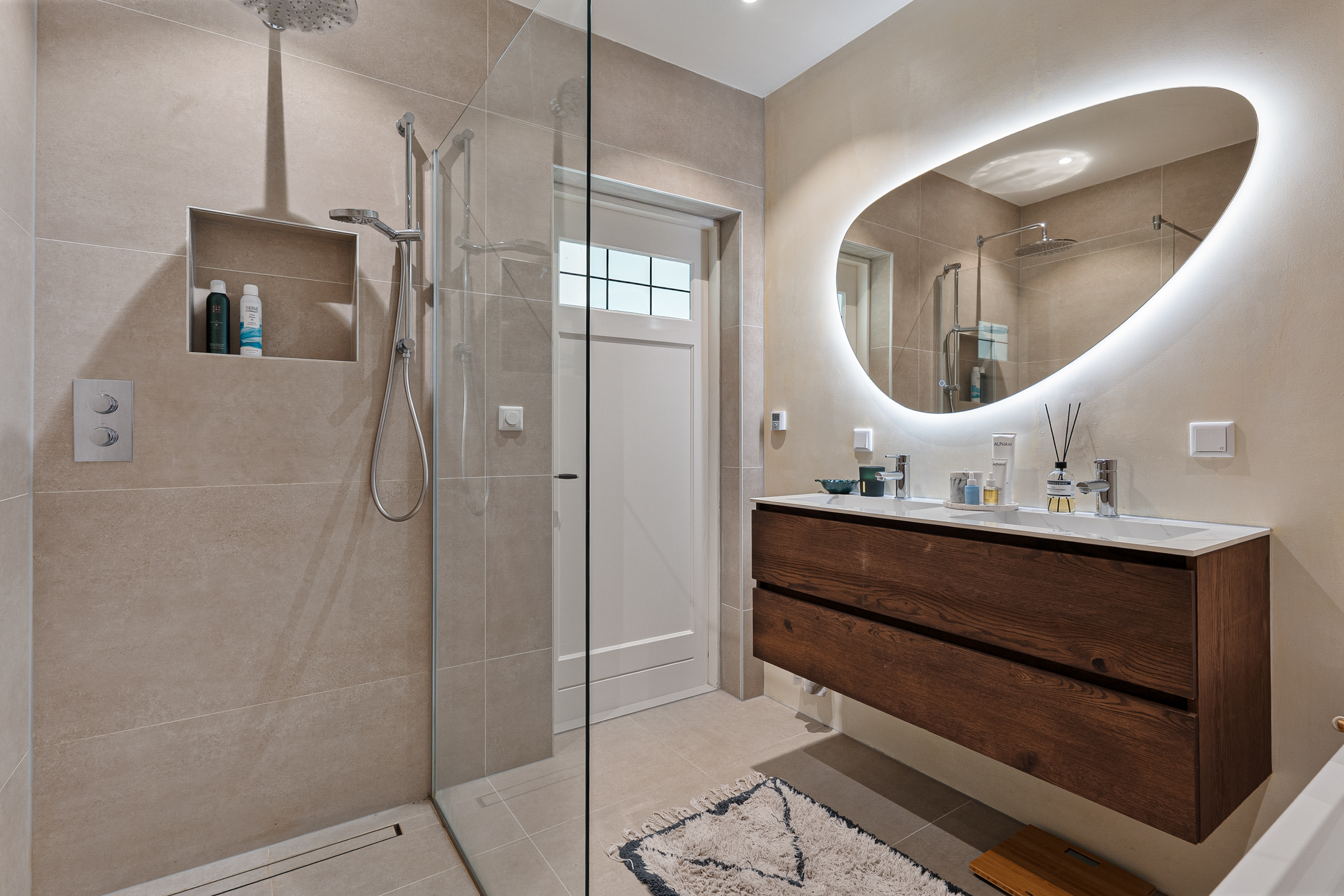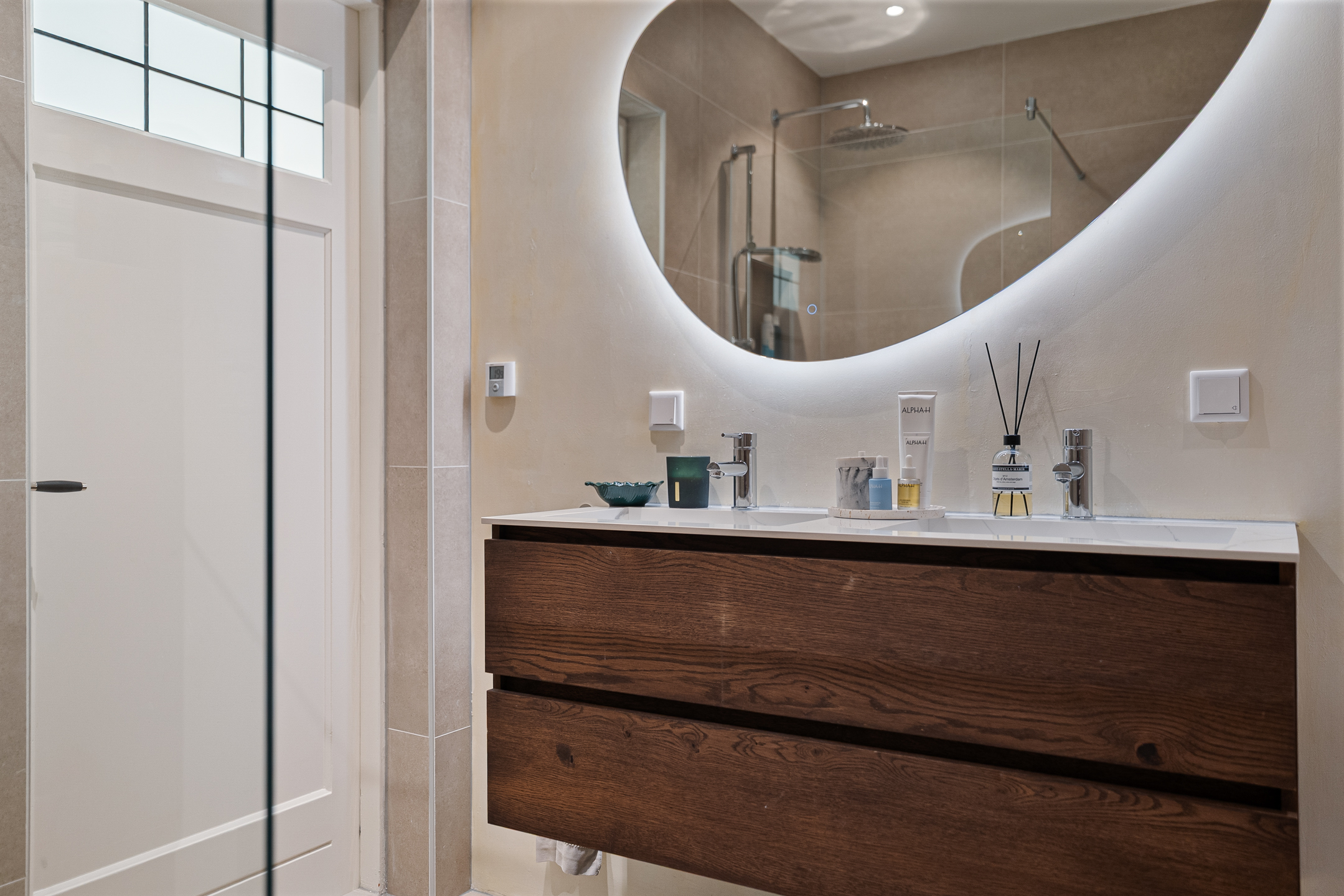 De tweede deur aan de linkerzijde leidt naar de moderne badkamer (2024), die compleet is uitgevoerd met een ligbad, een ruime inloopdouche en een wastafelmeubel met dubbele wasbak. Net als de rest van de woning is ook de badkamer voorzien van comfortabele vloerverwarming.