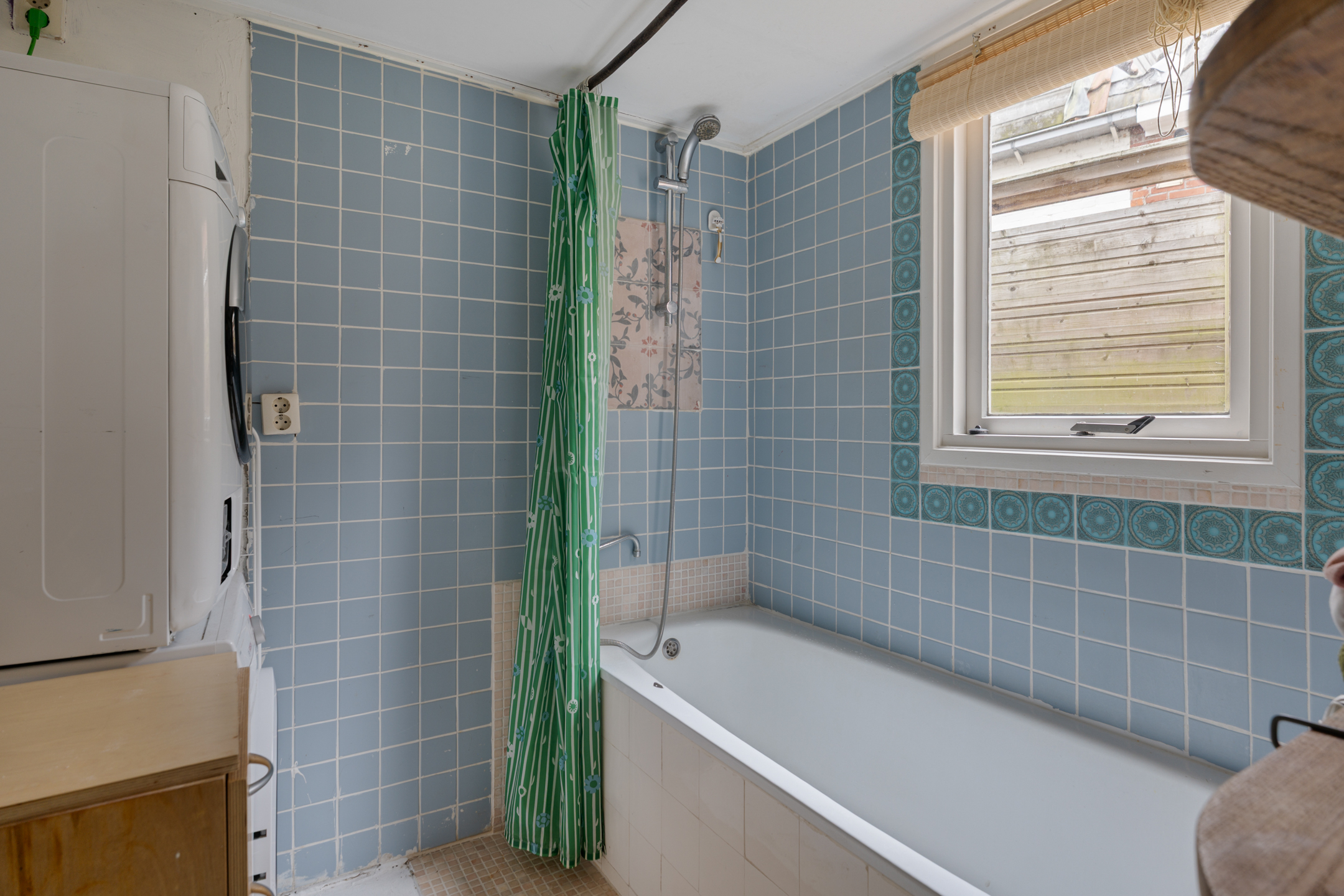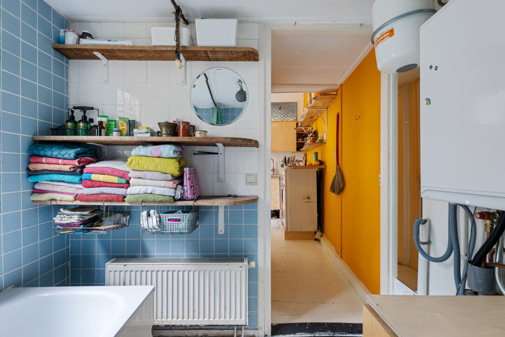 Aan de achterzijde van de woning bevindt zich de keuken, die in open verbinding staat met de woonkamer. Vanuit de keuken bereikt u een tweede hal, welke toegang geeft tot het toilet en de badkamer. De badkamer is voorzien van een ligbad met douche en een wasmachineaansluiting.