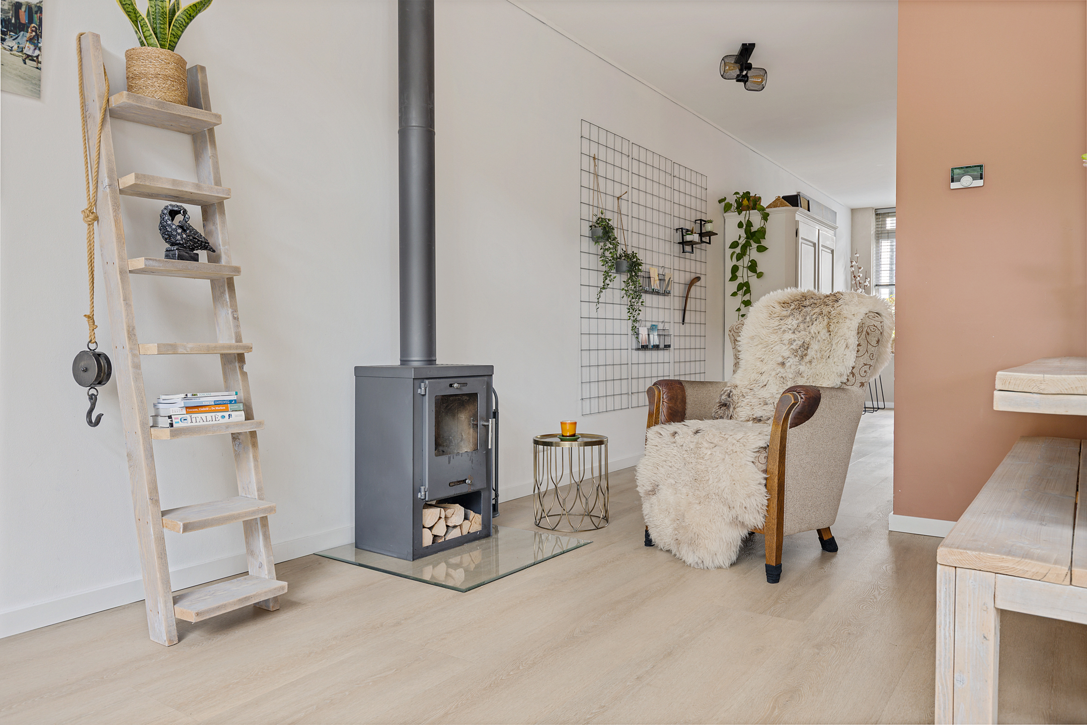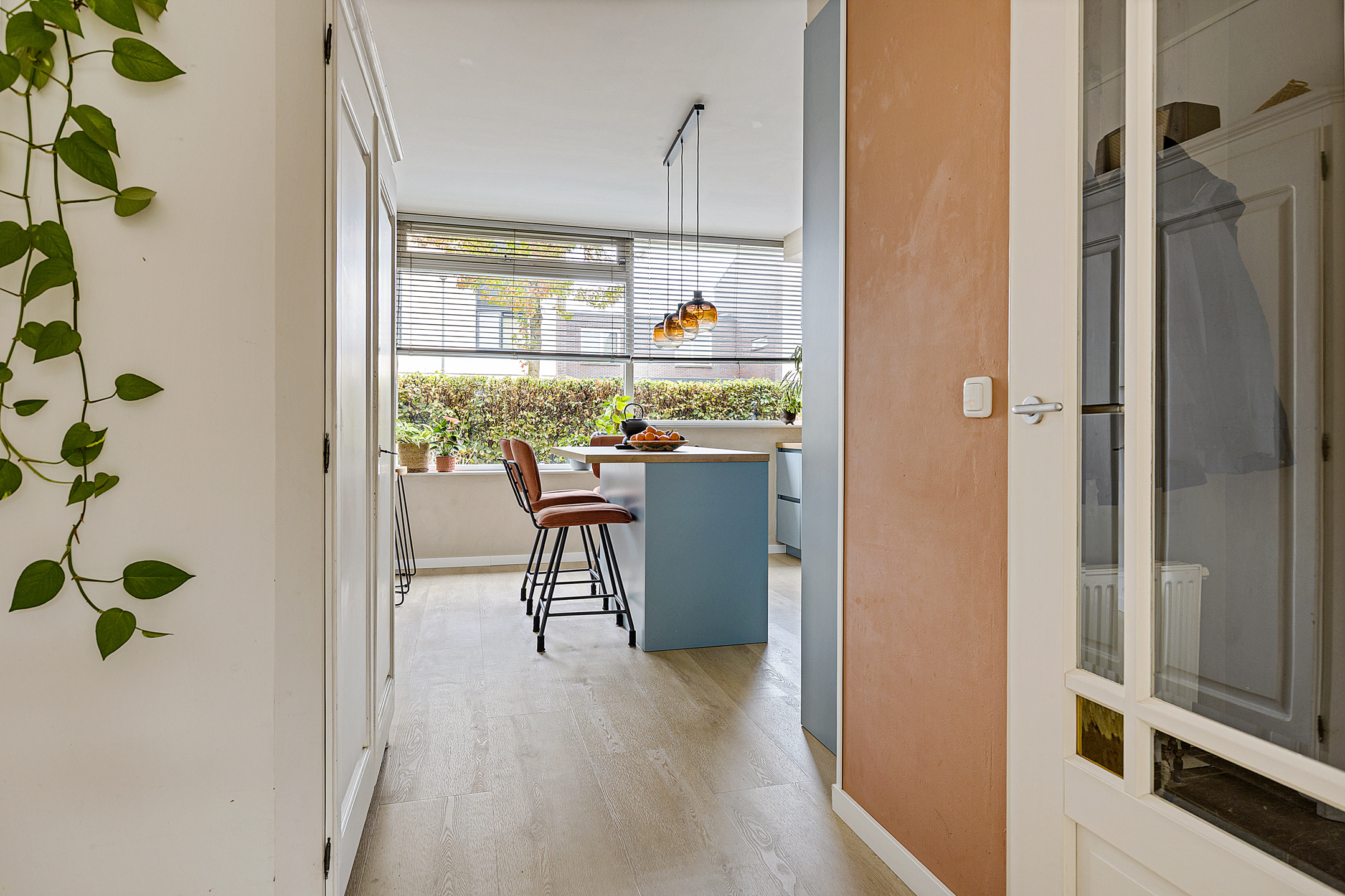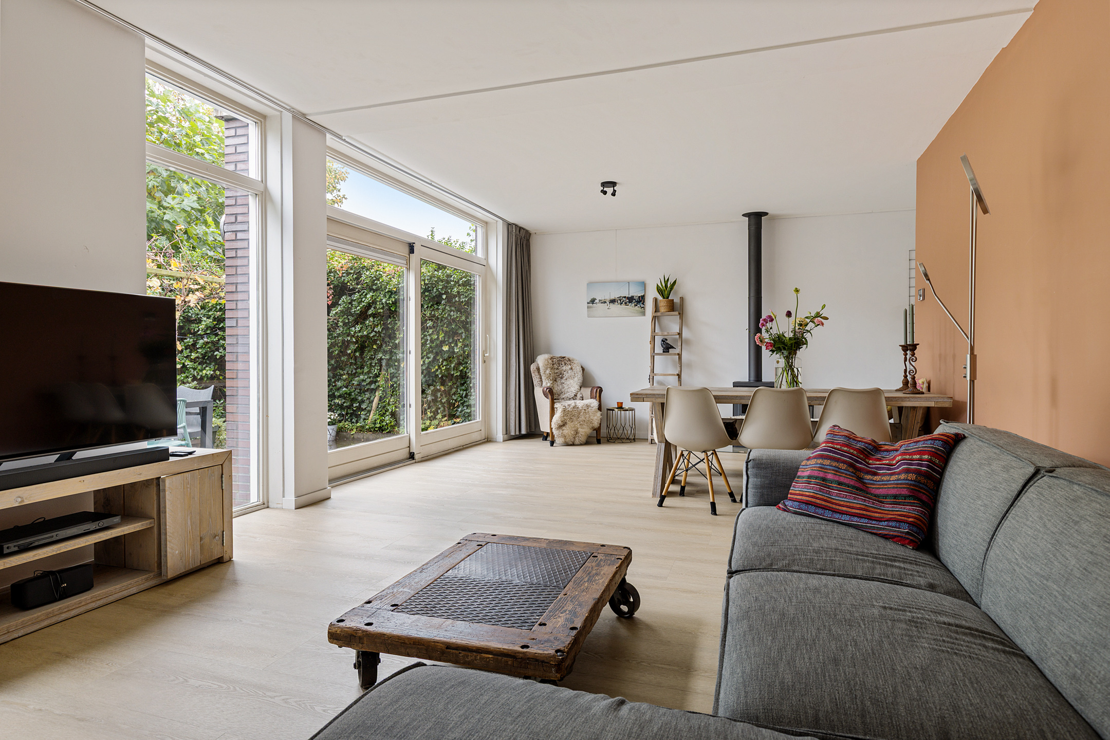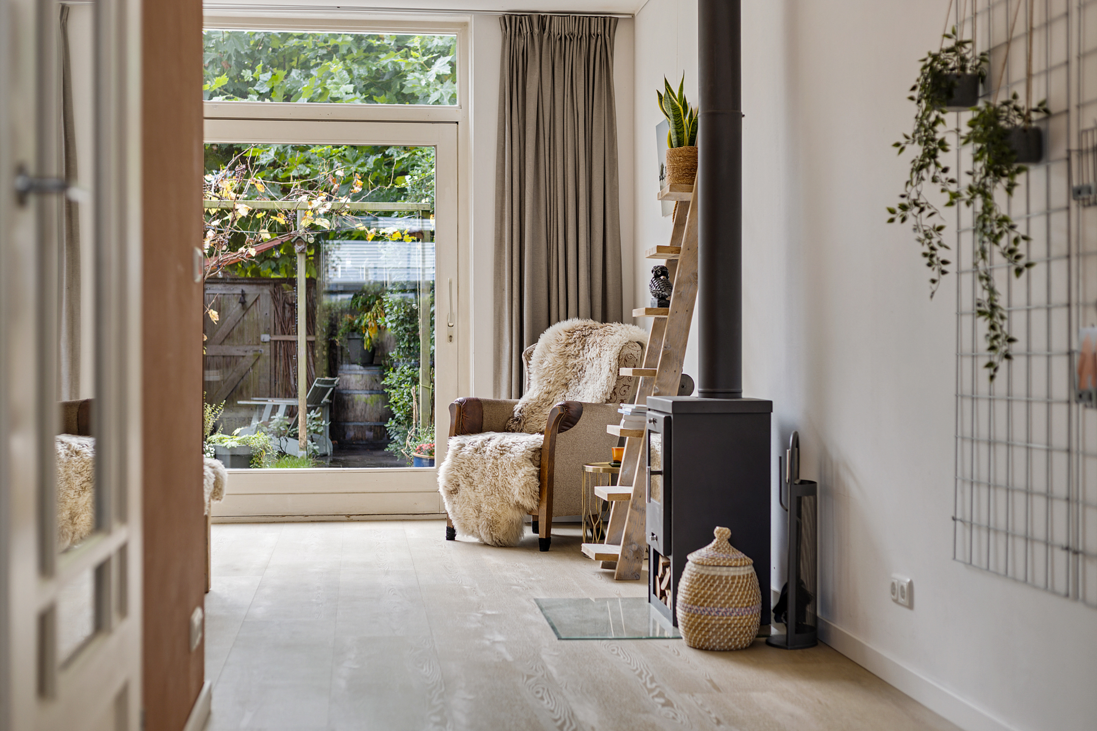 Via de overkapping kom je droog binnen in de ruime hal met toilet, meterkast en trapopgang. Vanuit de hal is er toegang tot zowel de berging als de woonkamer met open keuken. De lichte woonkamer van circa 41 m² ligt aan de tuinzijde en beschikt over grote raampartijen die zorgen voor een fraai uitzicht op de achtertuin en veel natuurlijk licht. De sfeervolle open keuken bevindt zich aan de voorzijde van de woning en profiteert eveneens van een ruime lichtinval.