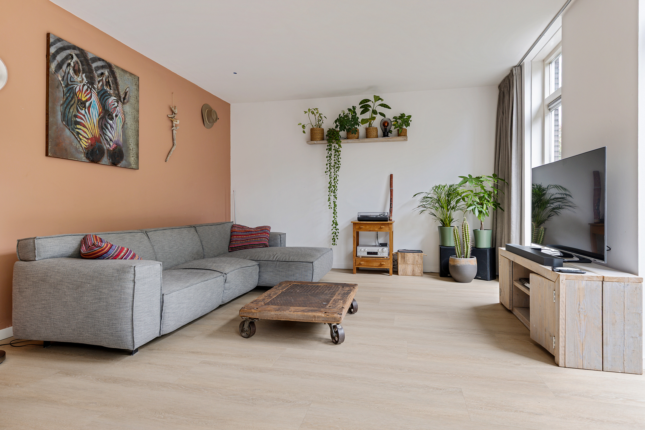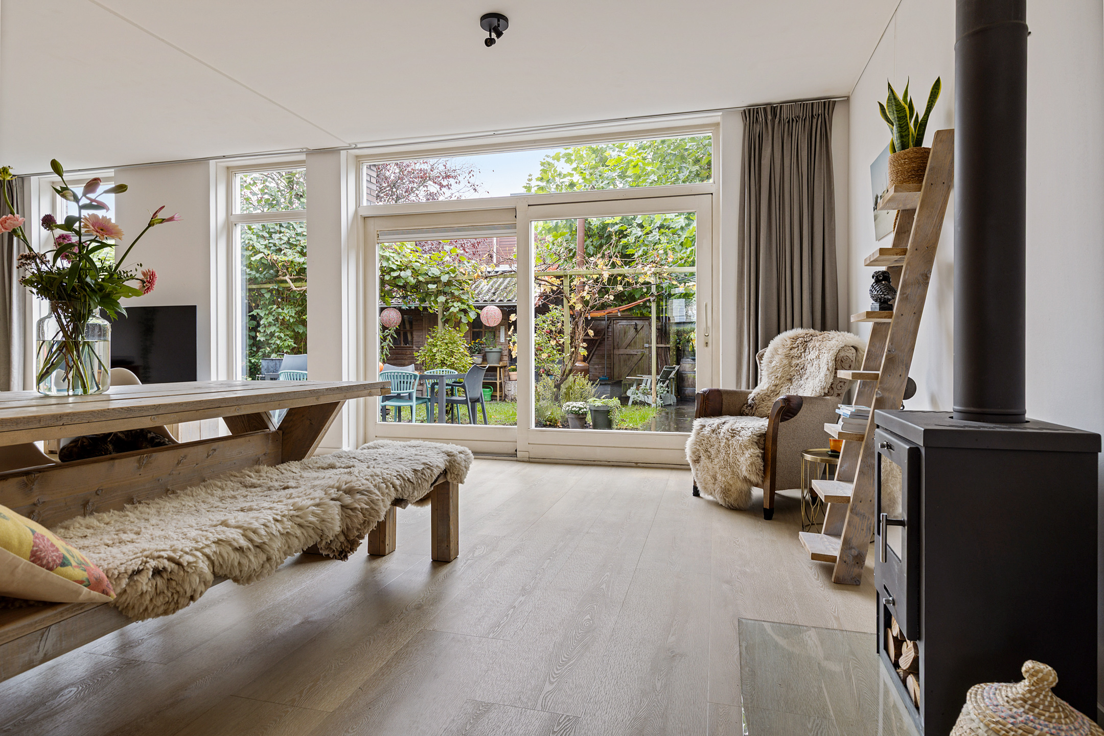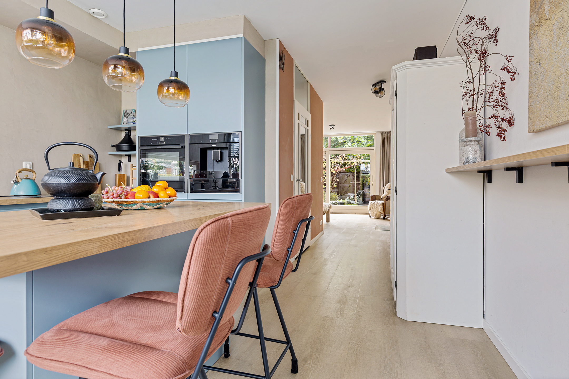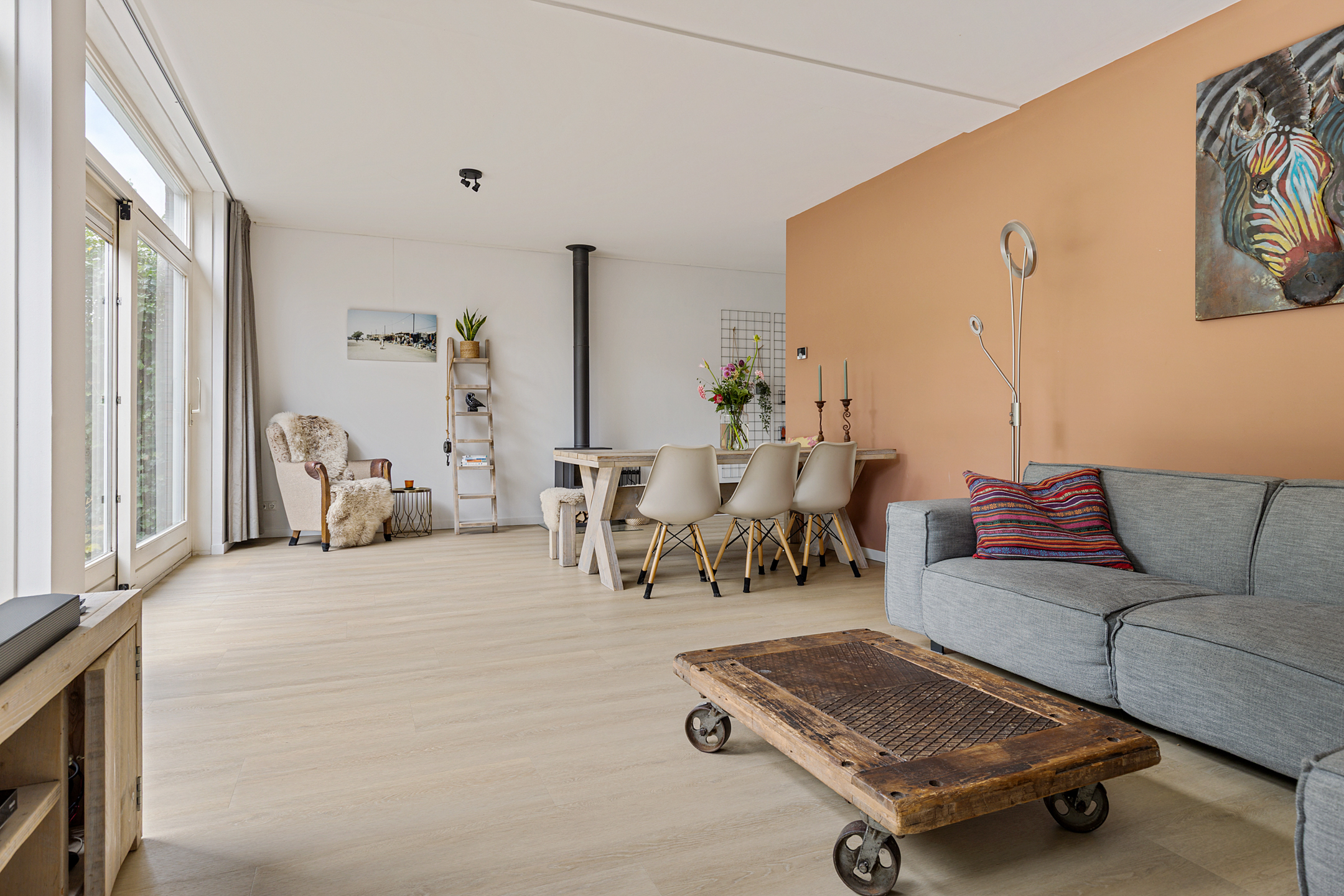 Via de overkapping kom je droog binnen in de ruime hal met toilet, meterkast en trapopgang. Vanuit de hal is er toegang tot zowel de berging als de woonkamer met open keuken. De lichte woonkamer van circa 41 m² ligt aan de tuinzijde en beschikt over grote raampartijen die zorgen voor een fraai uitzicht op de achtertuin en veel natuurlijk licht. De sfeervolle open keuken bevindt zich aan de voorzijde van de woning en profiteert eveneens van een ruime lichtinval.