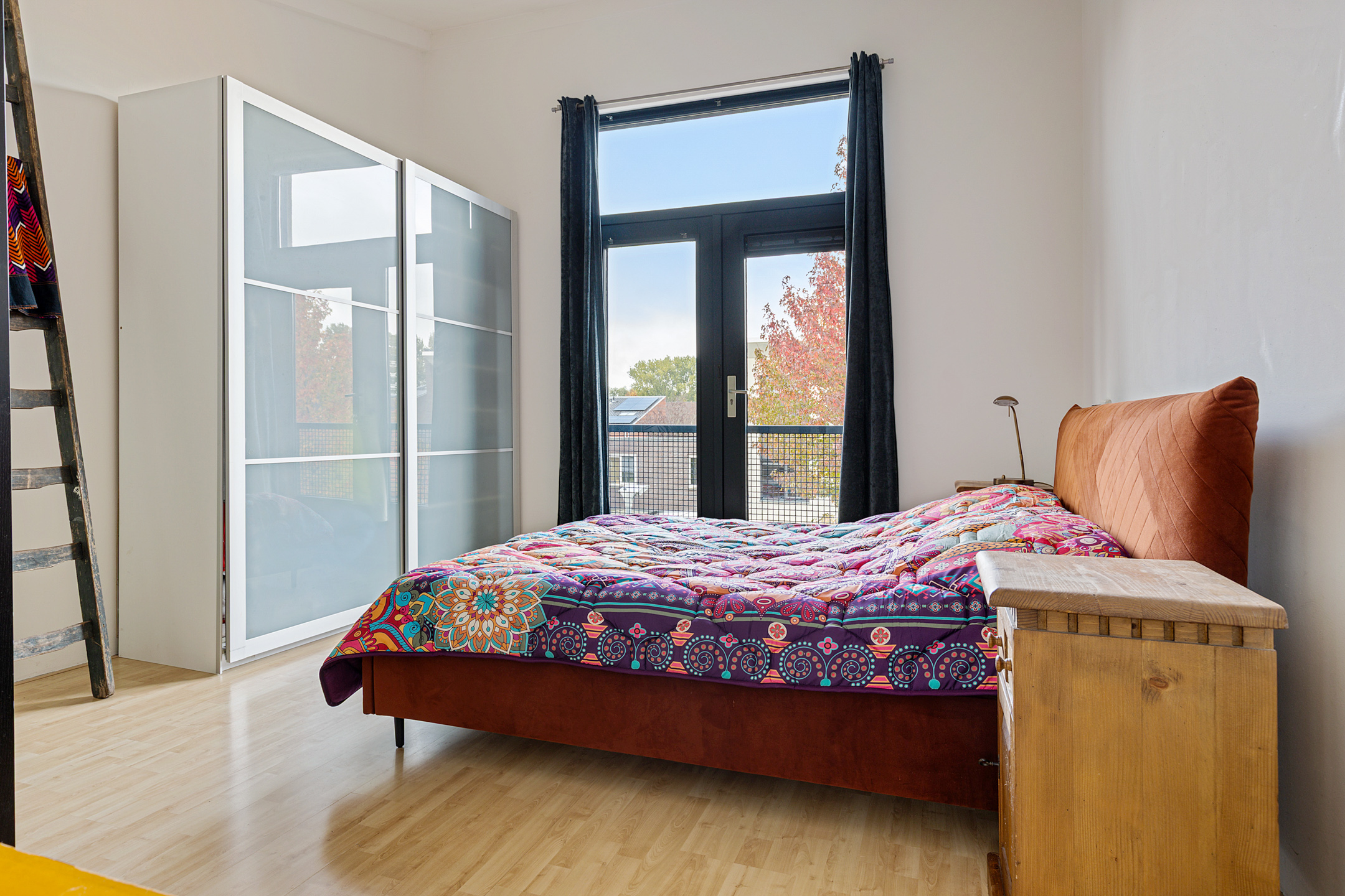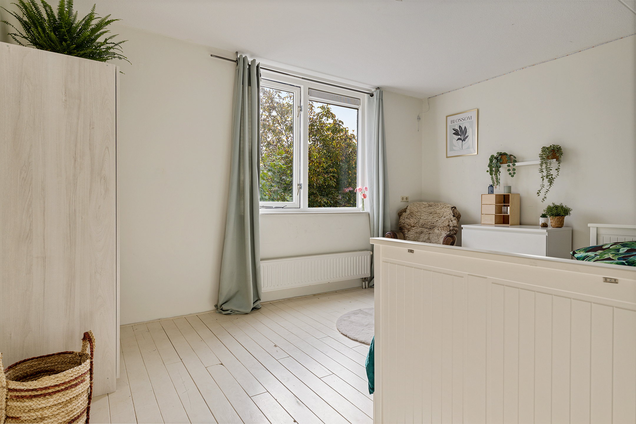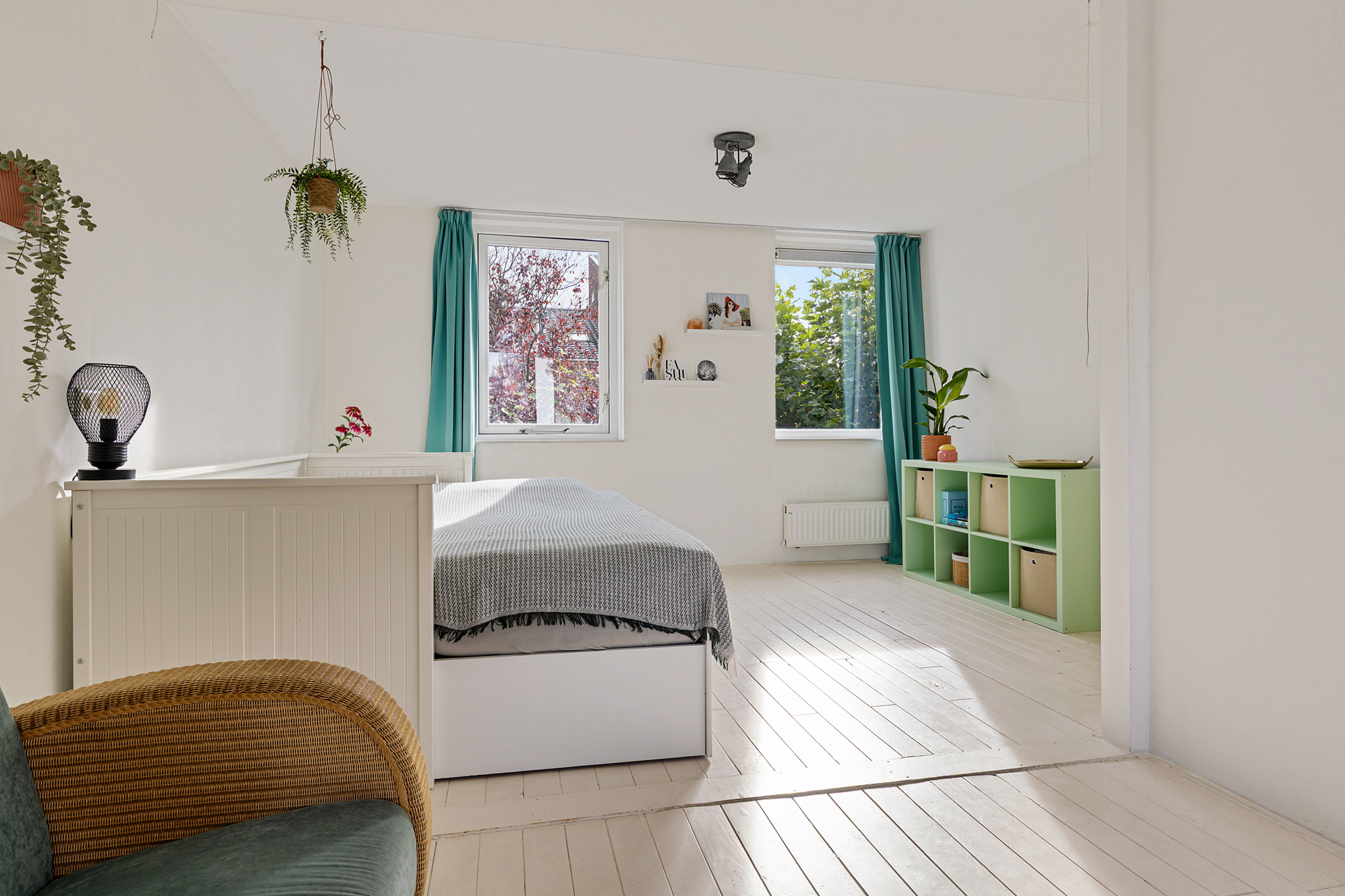 De tweede verdieping beschikt over een ruime vierde slaapkamer, die dankzij het Franse balkon en de grote raampartij geniet van een lichte en prettige sfeer.