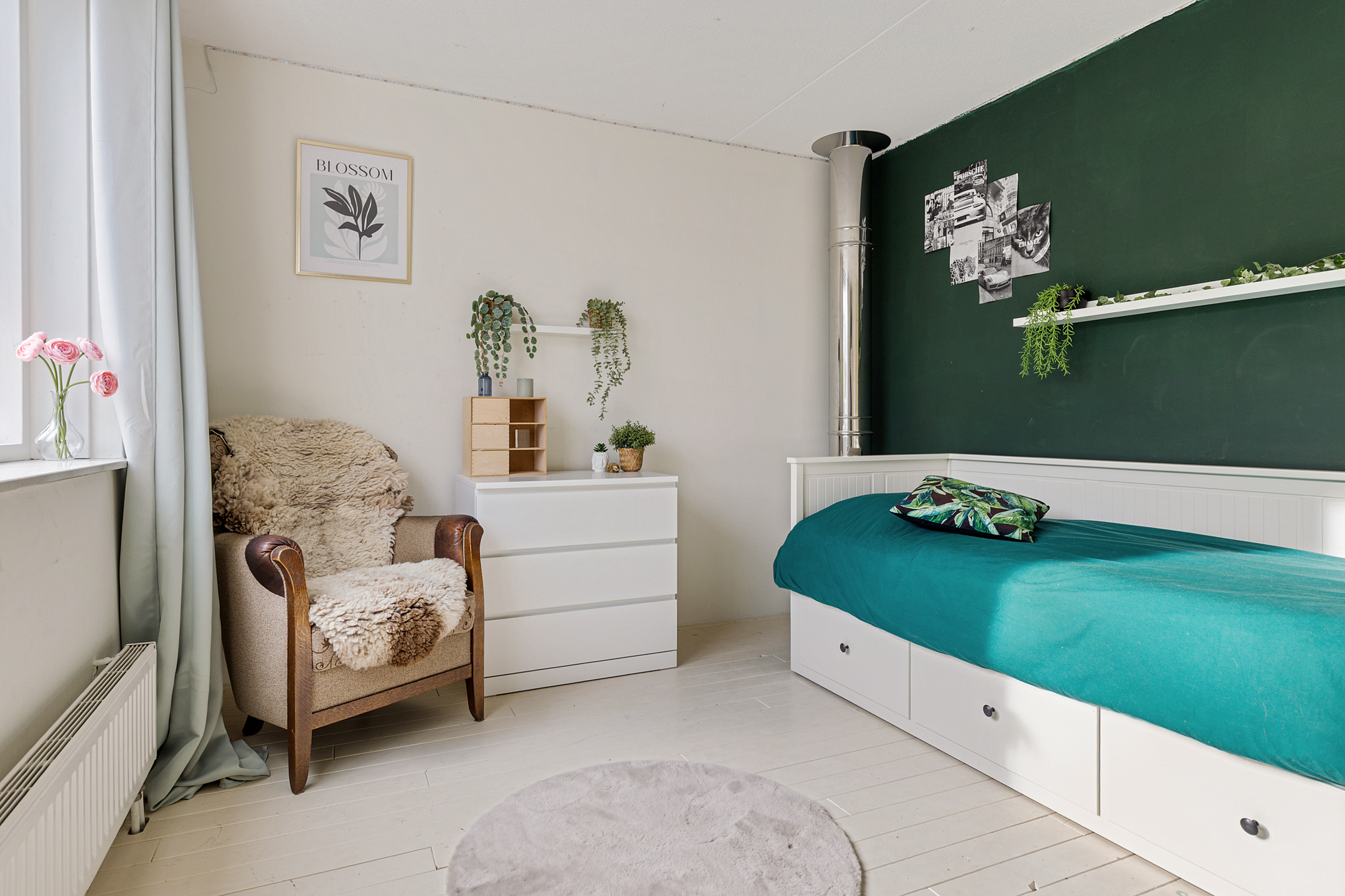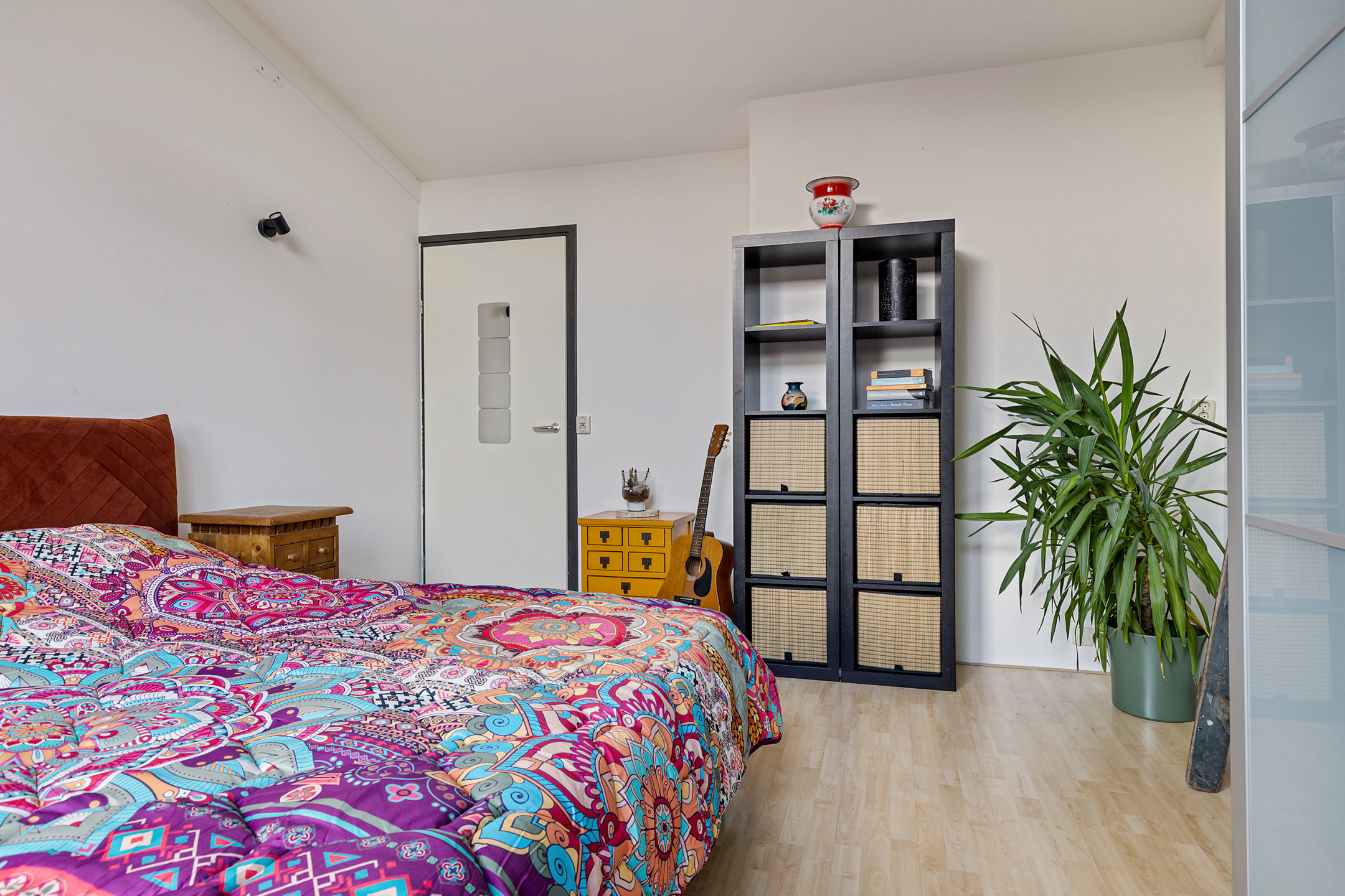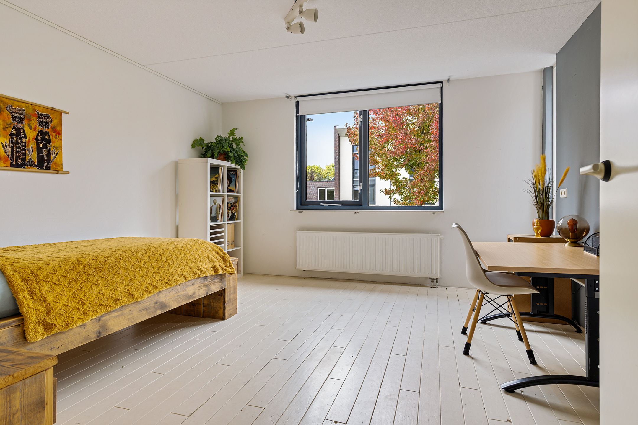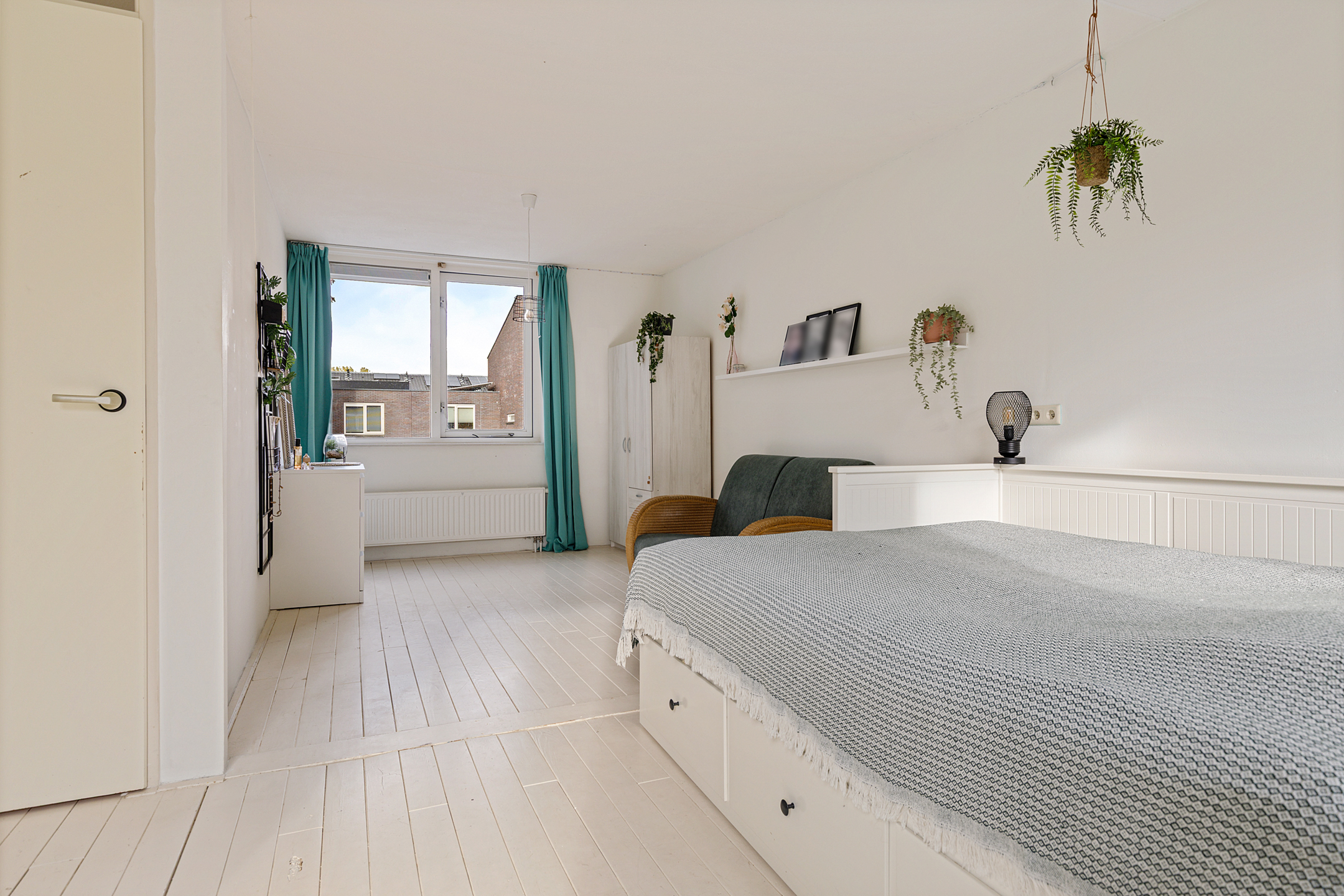 De tweede verdieping beschikt over een ruime vierde slaapkamer, die dankzij het Franse balkon en de grote raampartij geniet van een lichte en prettige sfeer.