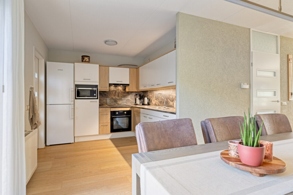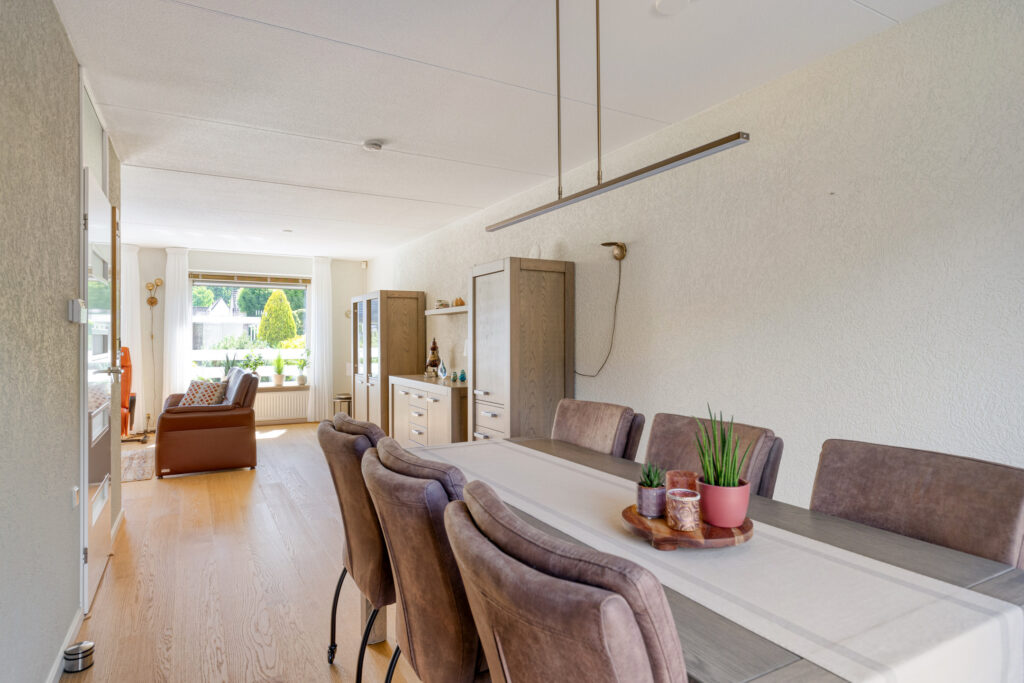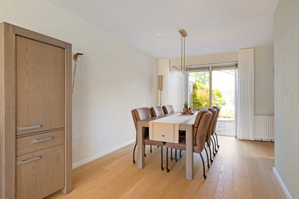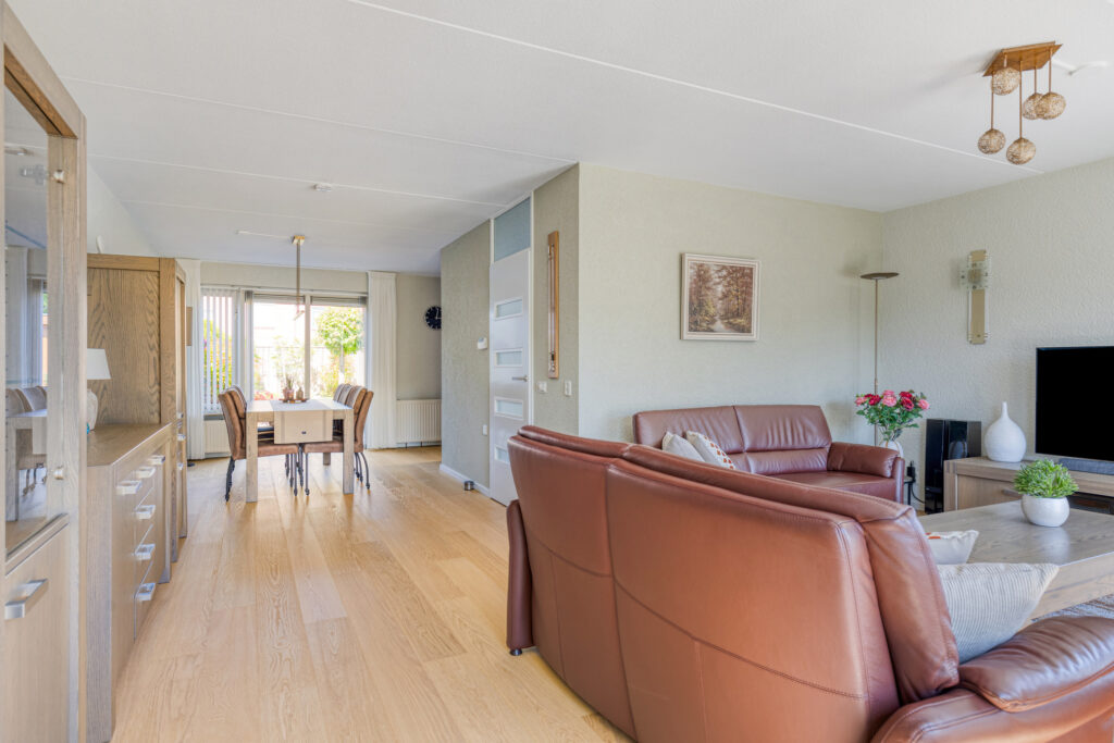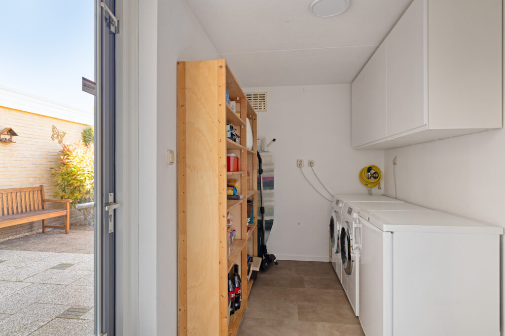 Indeling: entree; hal met trapopgang, meterkast en toilet; woonkamer met veel lichtinval; eethoek; open keuken met hoekkeukenopstelling die voorzien is van vaatwasser, inductiekookplaat, afzuigkap en oven; bijkeuken met witgoedaansluitingen, achterentree en doorgang garage.