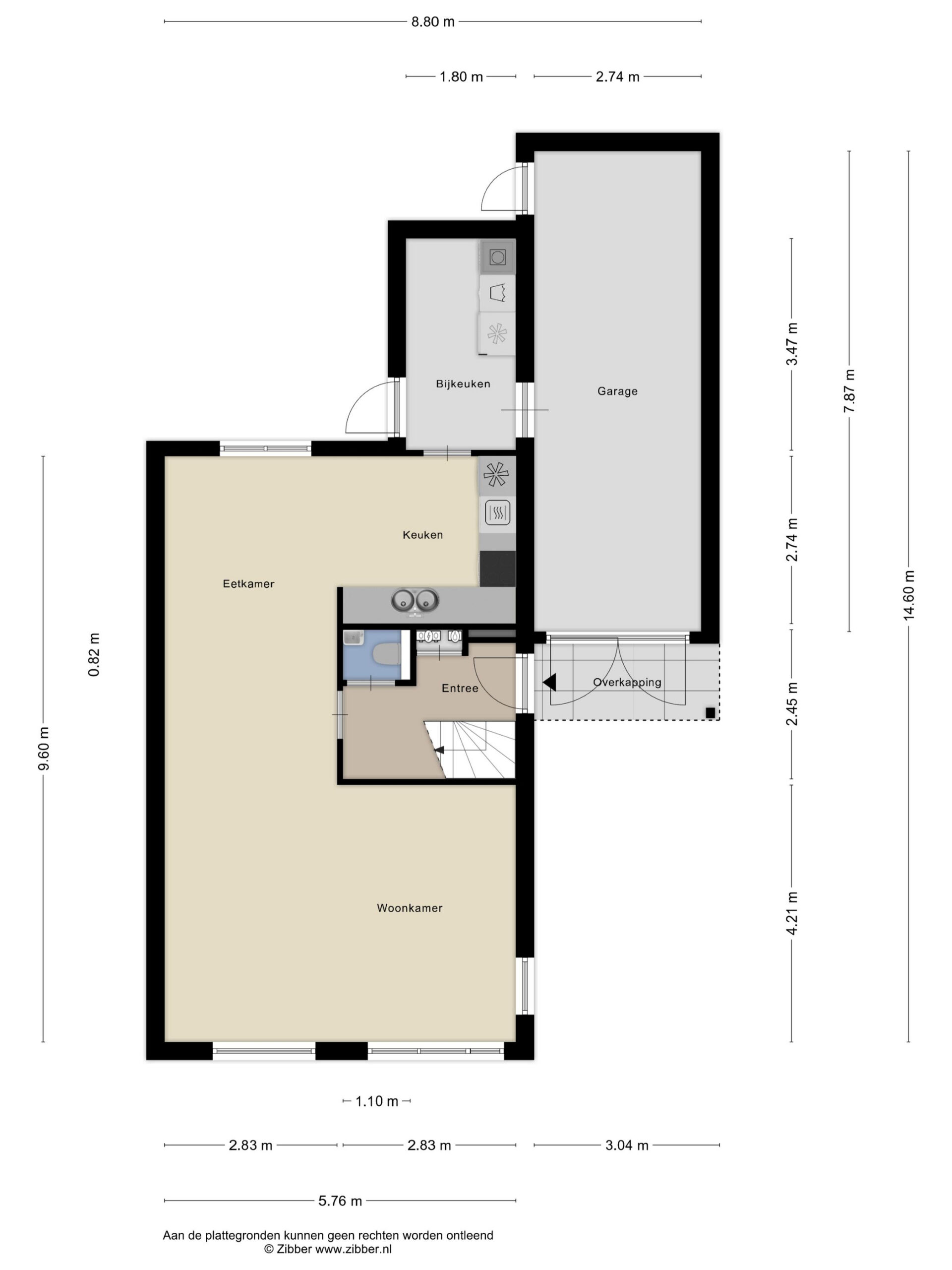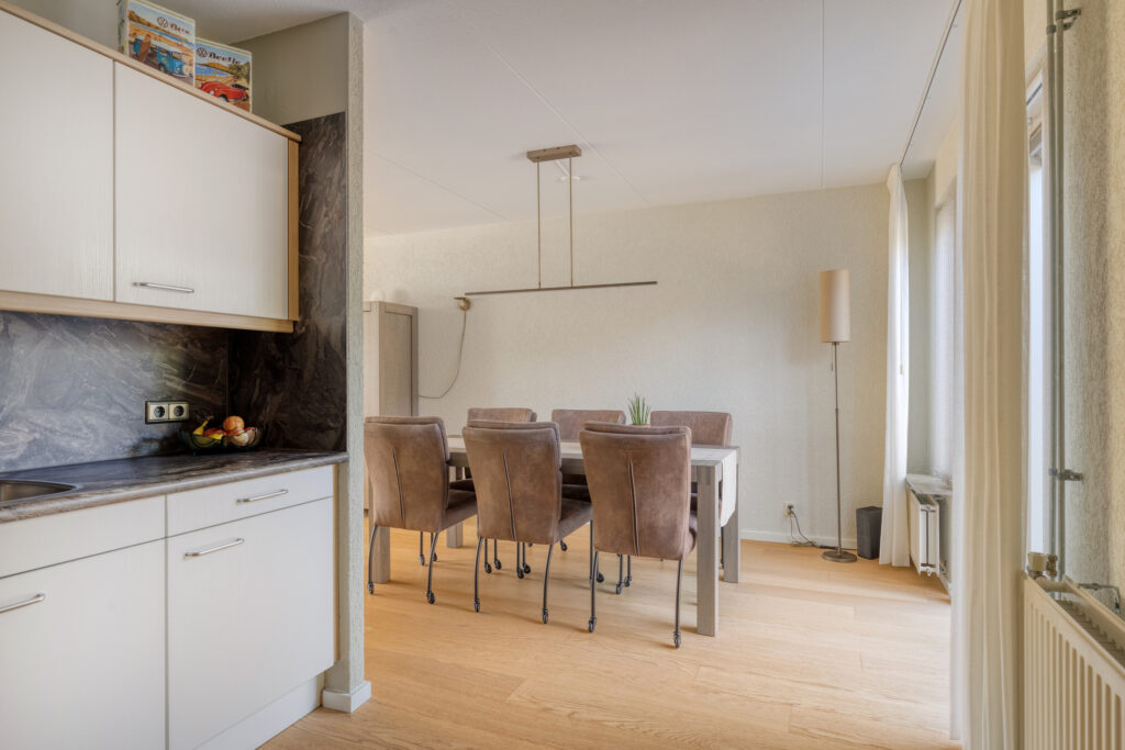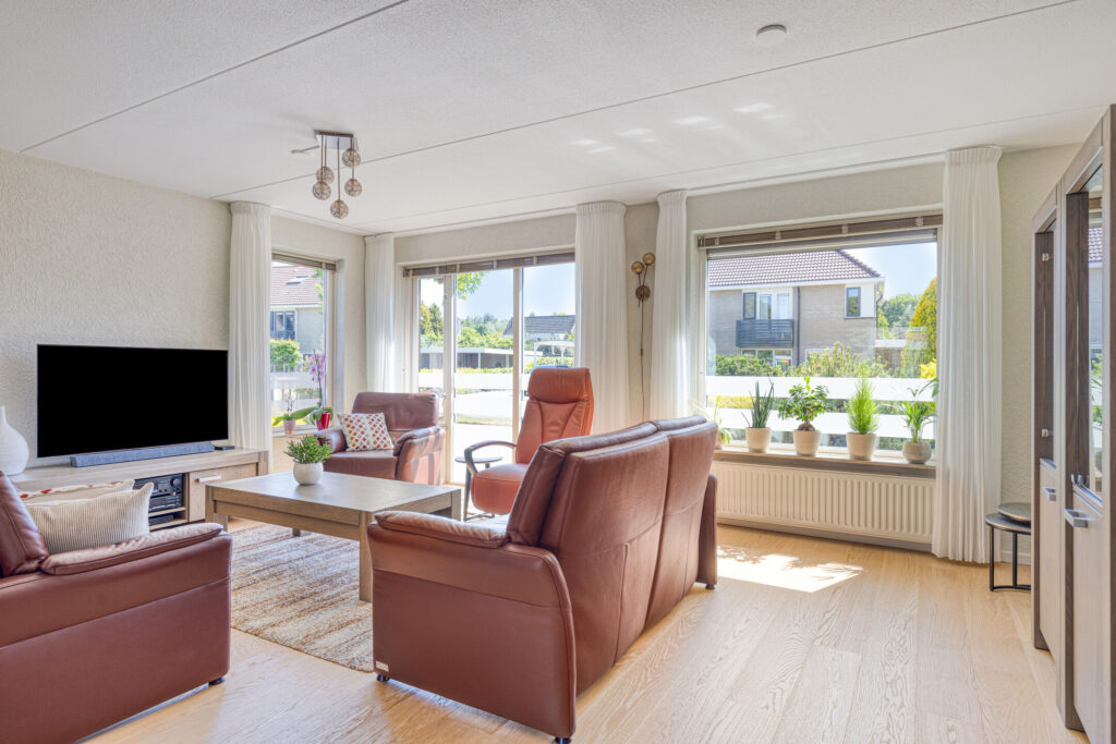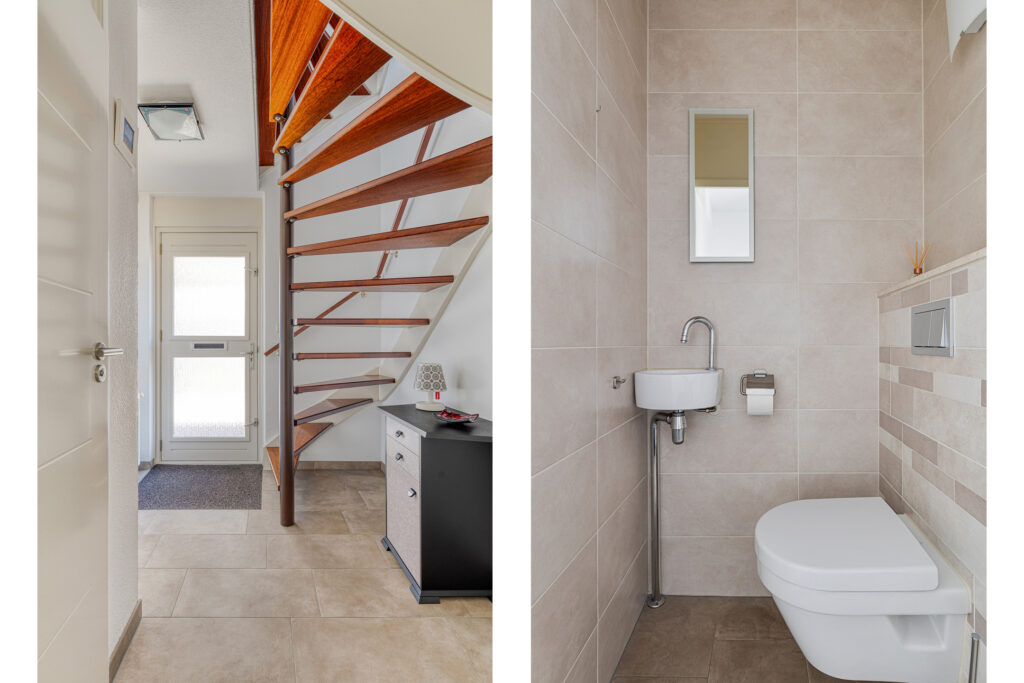 Indeling: entree; hal met trapopgang, meterkast en toilet; woonkamer met veel lichtinval; eethoek; open keuken met hoekkeukenopstelling die voorzien is van vaatwasser, inductiekookplaat, afzuigkap en oven; bijkeuken met witgoedaansluitingen, achterentree en doorgang garage.