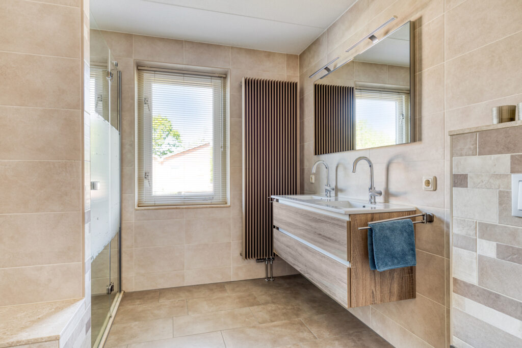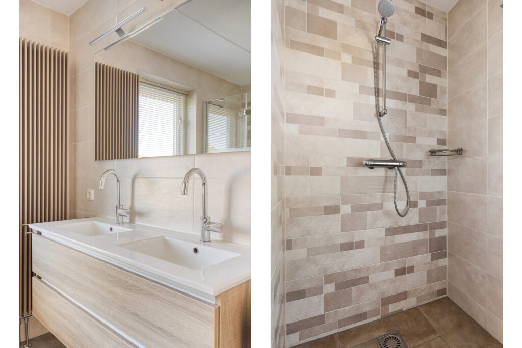 Eerste verdieping: overloop; drie slaapkamers; badkamer met inloopdouche, wastafelmeubel met dubbele kraan, toilet.