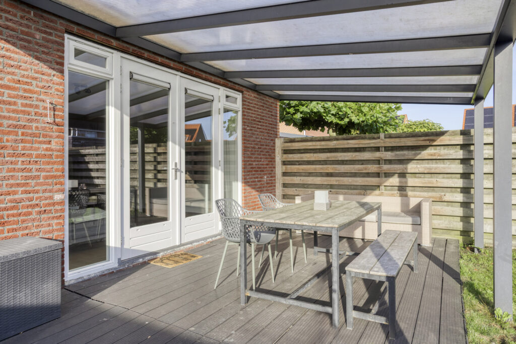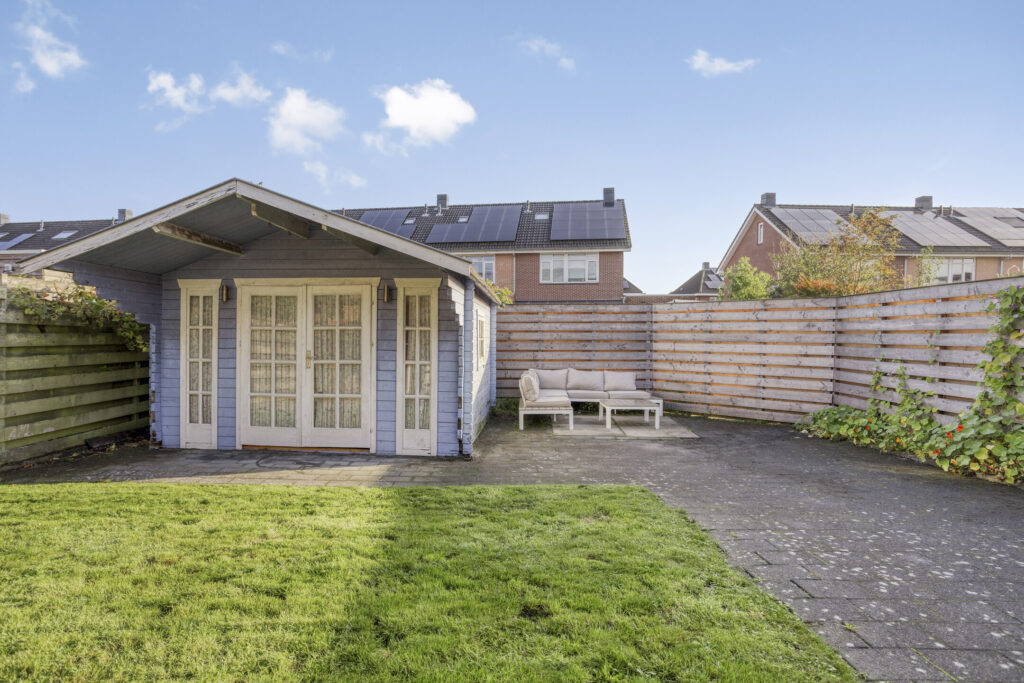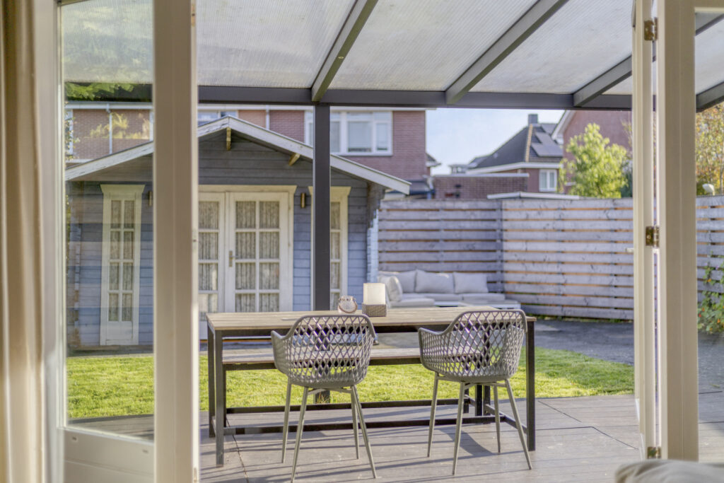 De woning ligt op een ruim hoekperceel en beschikt over een fraai aangelegde tuin met een ruime terrasoverkapping. De overkapping is het verlengstuk van de woonkamer. Bij de eerste zonnestralen is het heerlijk vertoeven onder de overkapping. De tuin zelf is ca. 15 meter diep en er is vanwege de grootte altijd wel een zon- of schaduwplek te vinden.