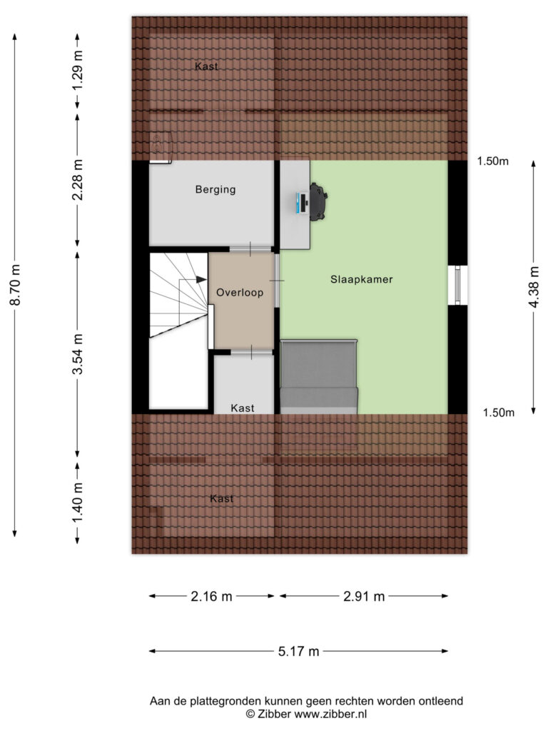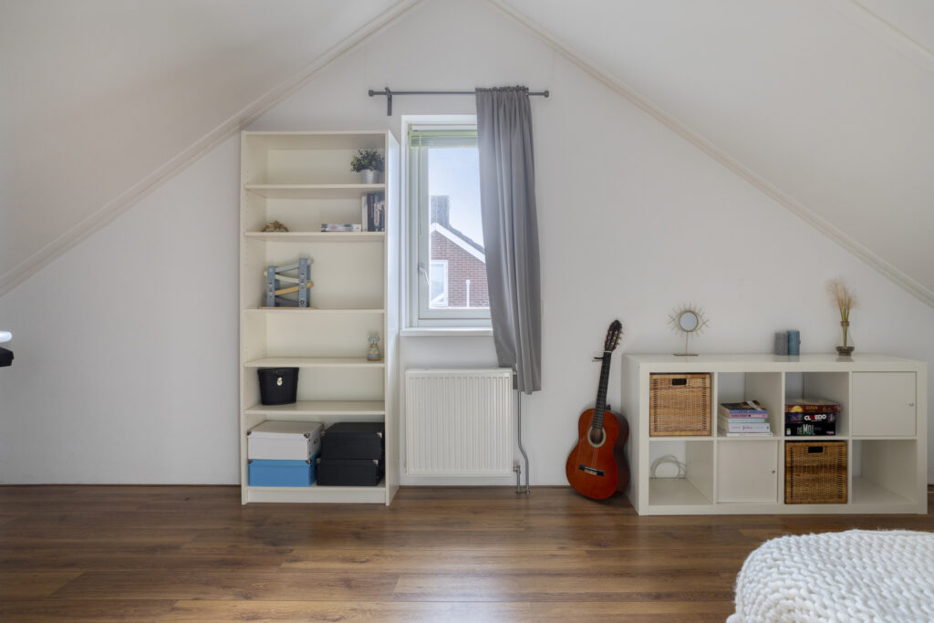 Tweede verdieping: overloop met bergruimtes en cv-opstelling; vierde slaapkamer.
