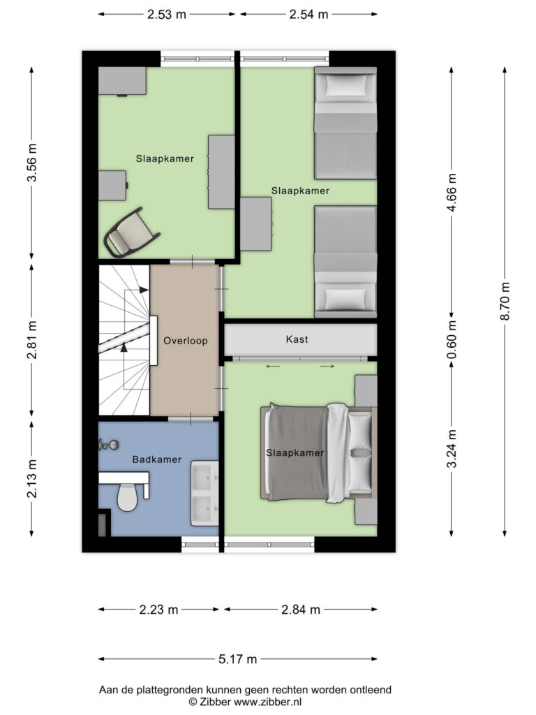 Eerste verdieping: overloop; drie ruime slaapkamers; badkamer met inloopdouche, wastafelmeubel en toilet.
