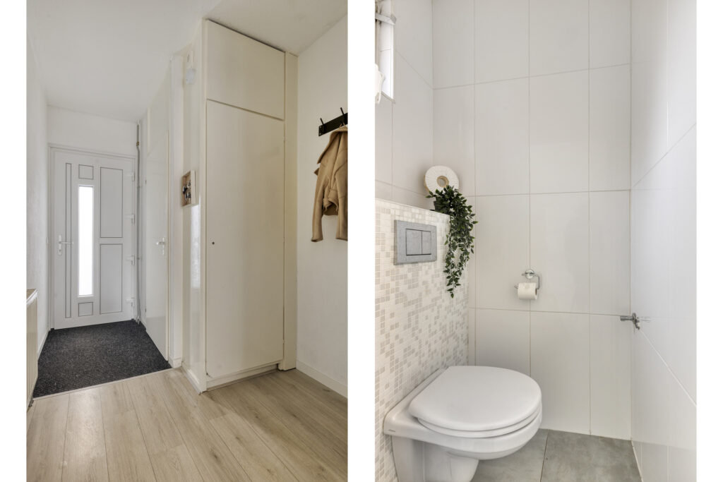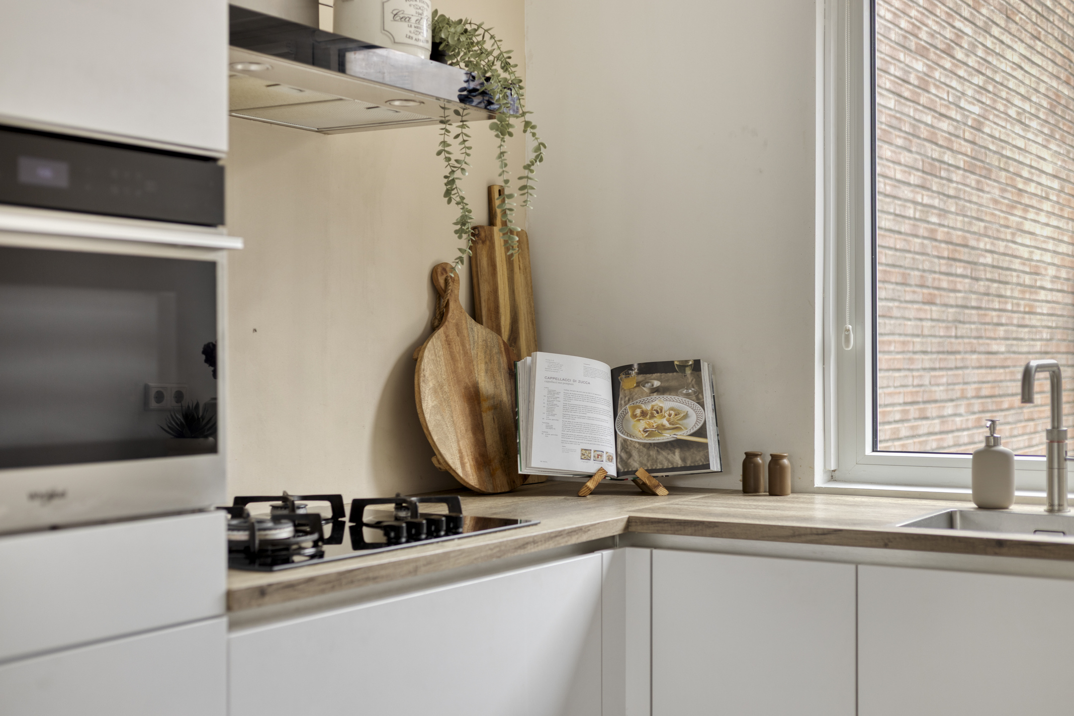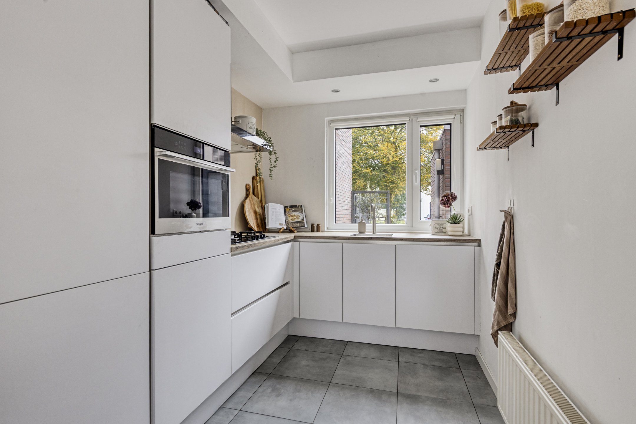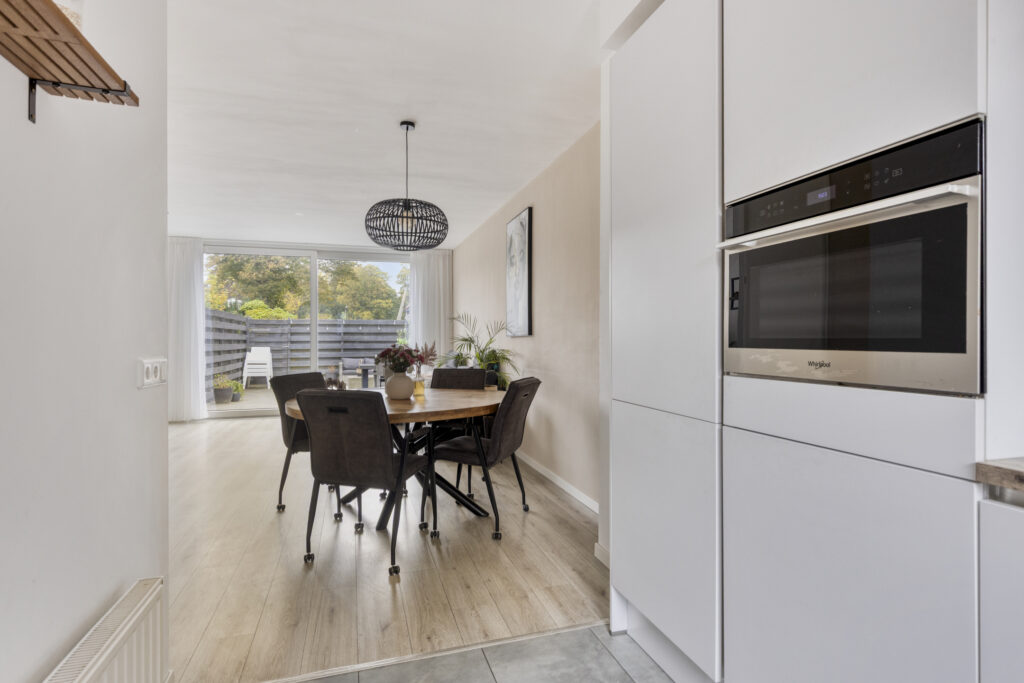 Indeling: voorentree; hal met toilet en trapopgang; tuingerichte woonkamer met trapkast; moderne open keuken voorzien van inductiekookplaat, afzuigkap, koelvriescombinatie, combi-oven en vaatwasser.