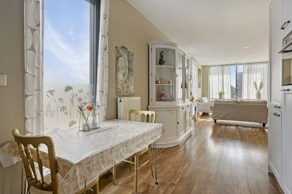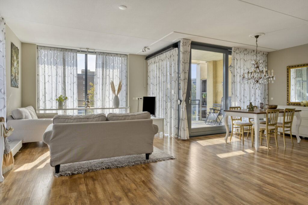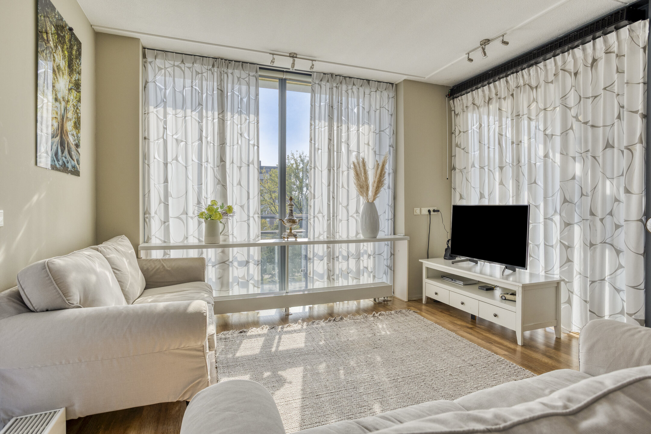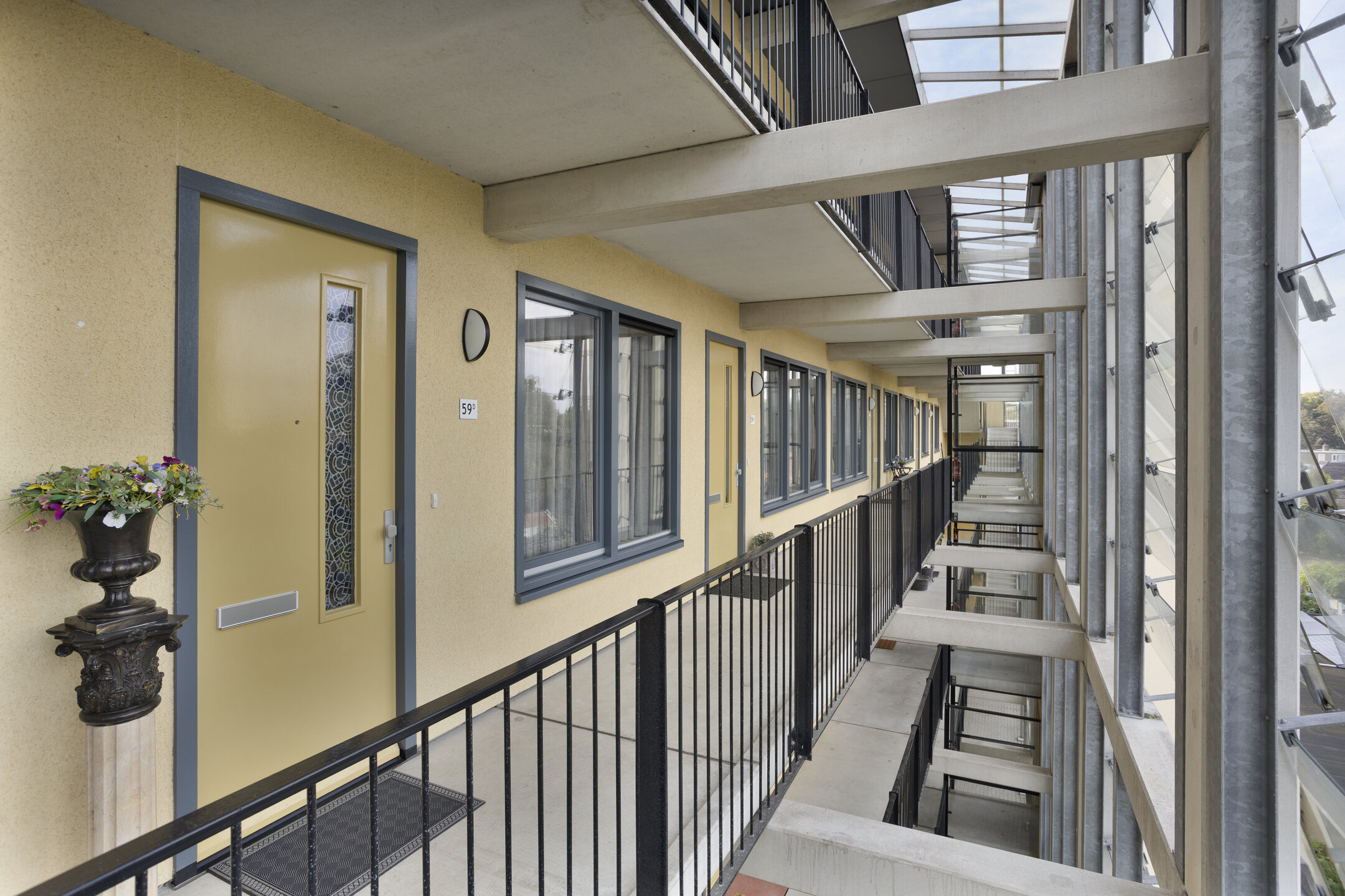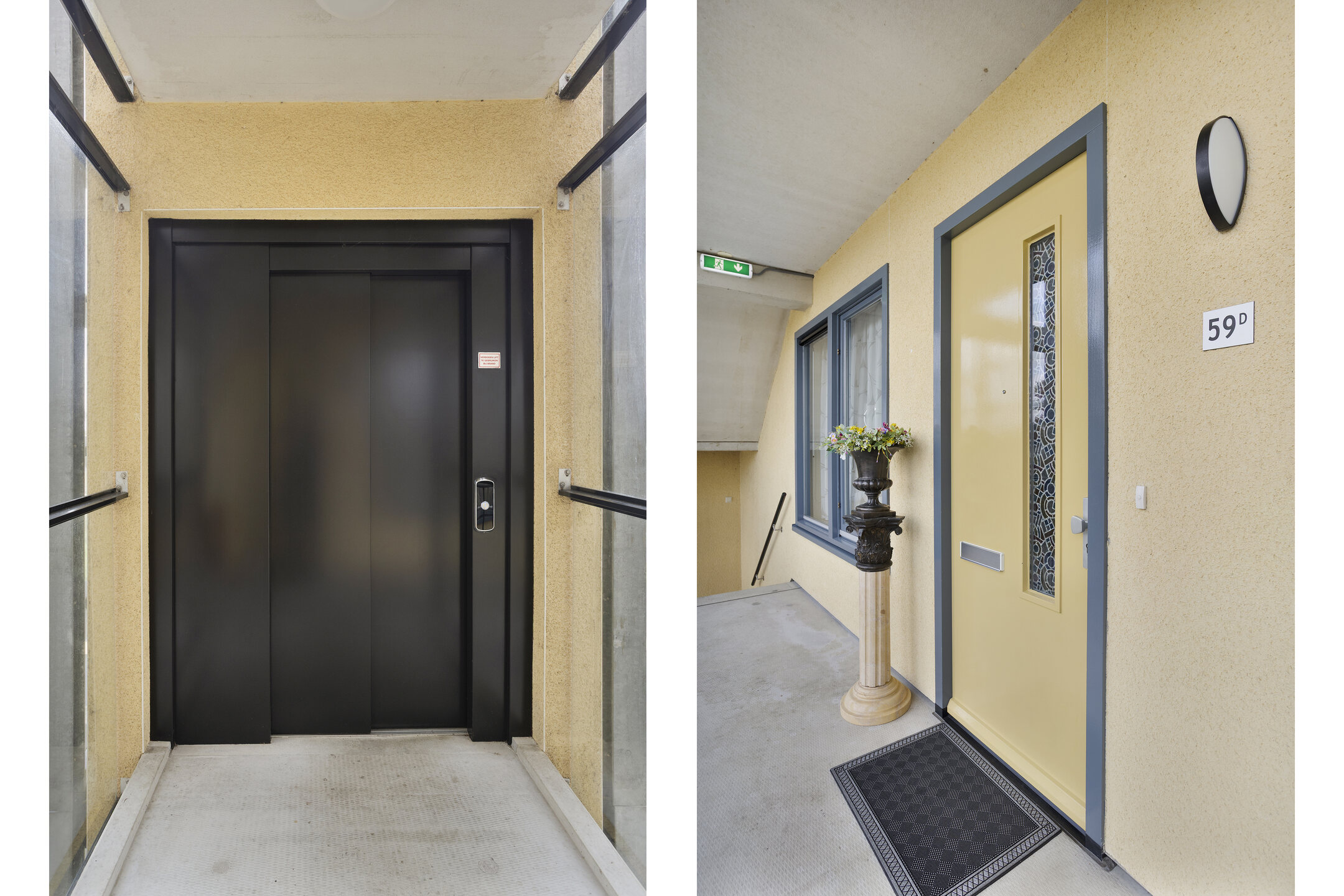 In een statig en uitstekend onderhouden appartementencomplex bevindt zich dit fraaie hoekappartement (nummer 59D), dat direct opvalt door zijn royale lichtinval dankzij ramen aan zowel de voor- als de zijgevel. Vanuit de ruime en lichte woonkamer stap je zo het zonnige balkon op, waar je geniet van een vrij uitzicht. Op de begane grond bevindt zich een ruime privégarage, groot genoeg voor een auto én extra opbergruimte. Het terrein is volledig omsloten en wordt veilig afgesloten met een elektrisch bedienbaar hekwerk.