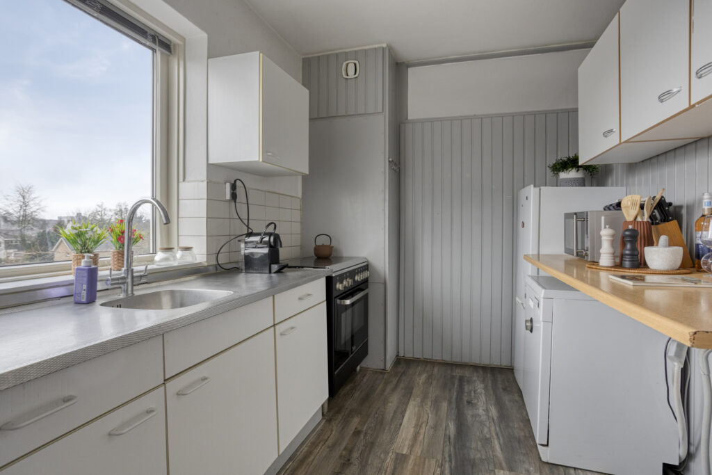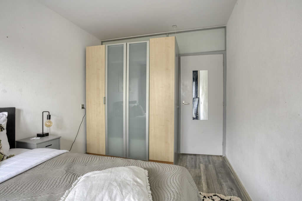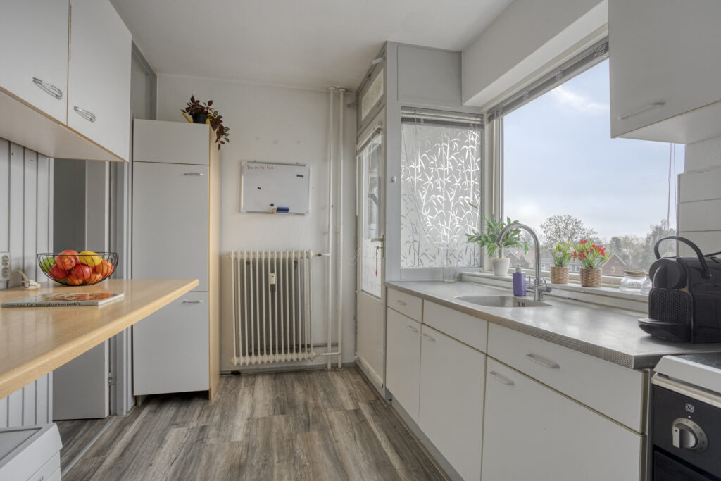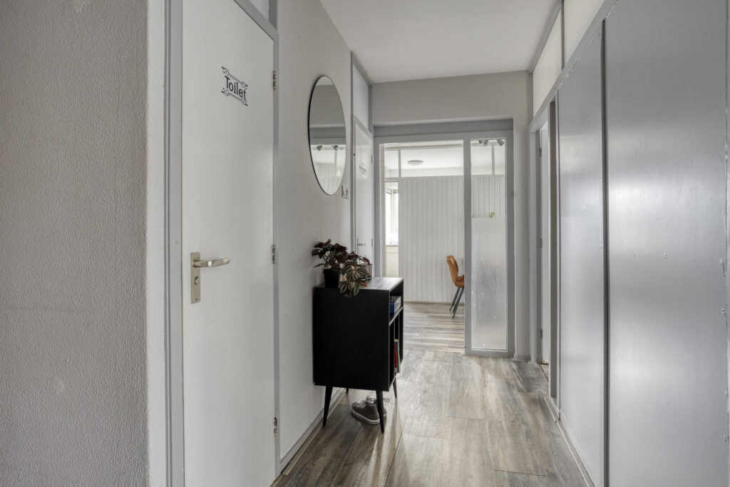 2e woonlaag: entree, hal met kastenwand, meterkast, provisiekast, toilet, badkamer met douchecabine en wastafel, twee slaapkamers, woonkamer met schuifpui naar het balkon en aansluitend de gesloten keuken met toegang naar klein balkon.