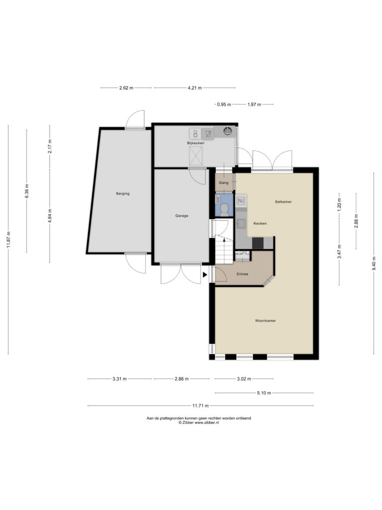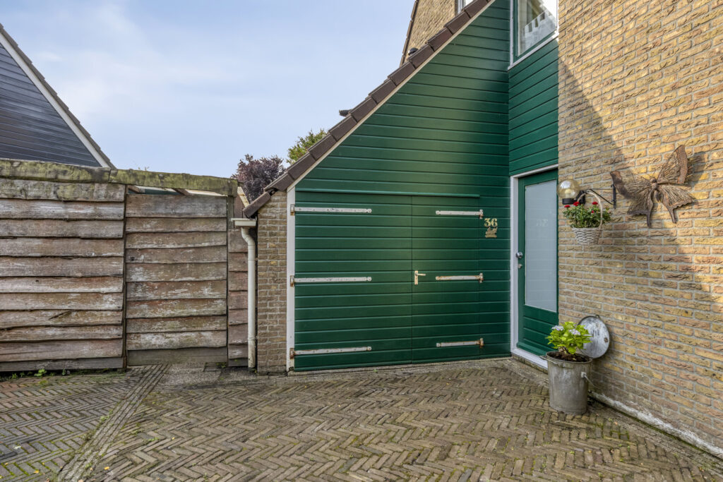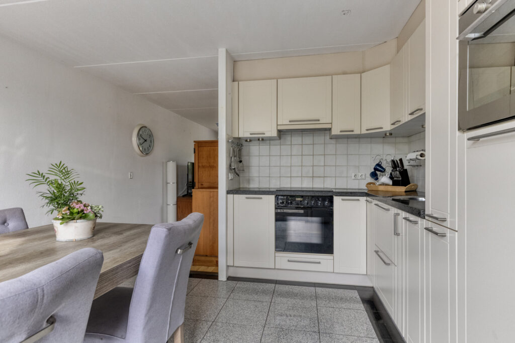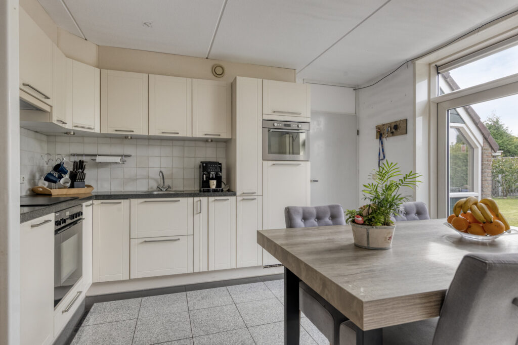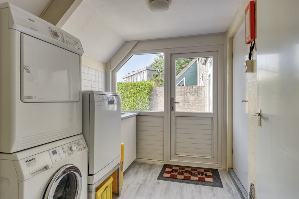 Indeling: zijentree; hal met meterkast en trapopgang; lichte straatgerichte woonkamer; tuingerichte half open keuken met openslaande deuren; keukenopstelling met inductiekookplaat, afzuigkap, oven, koelkast en combimagnetron; bijkeuken met achterentree en witgoedaansluitingen; garage met trapkast.